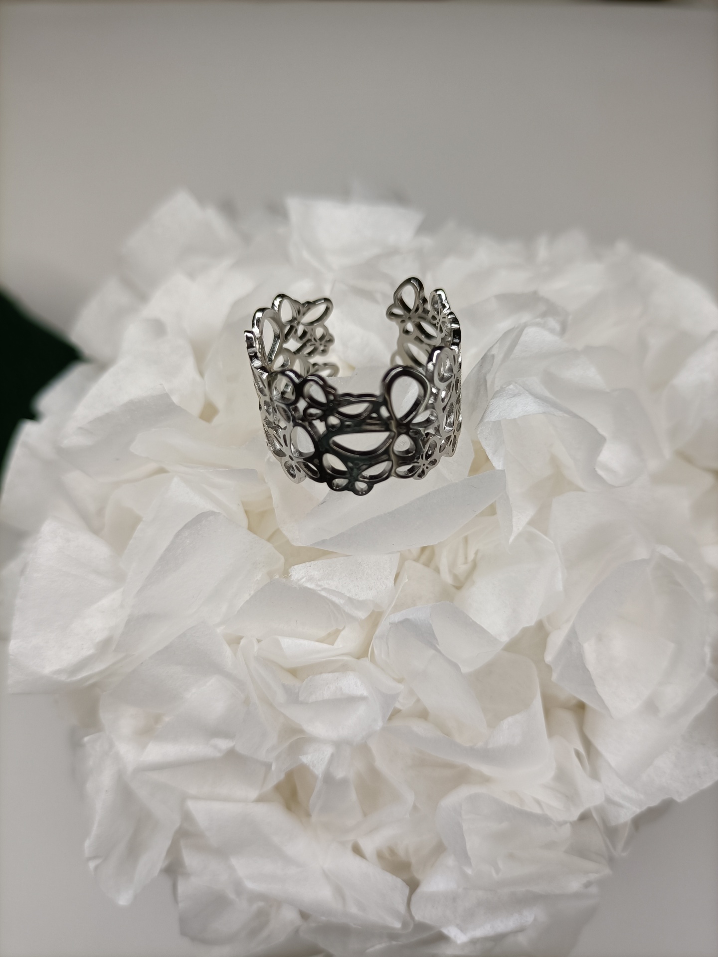 Encante-se com a delicadeza deste anel em aço inoxidável, disponível em dourado e prateado.