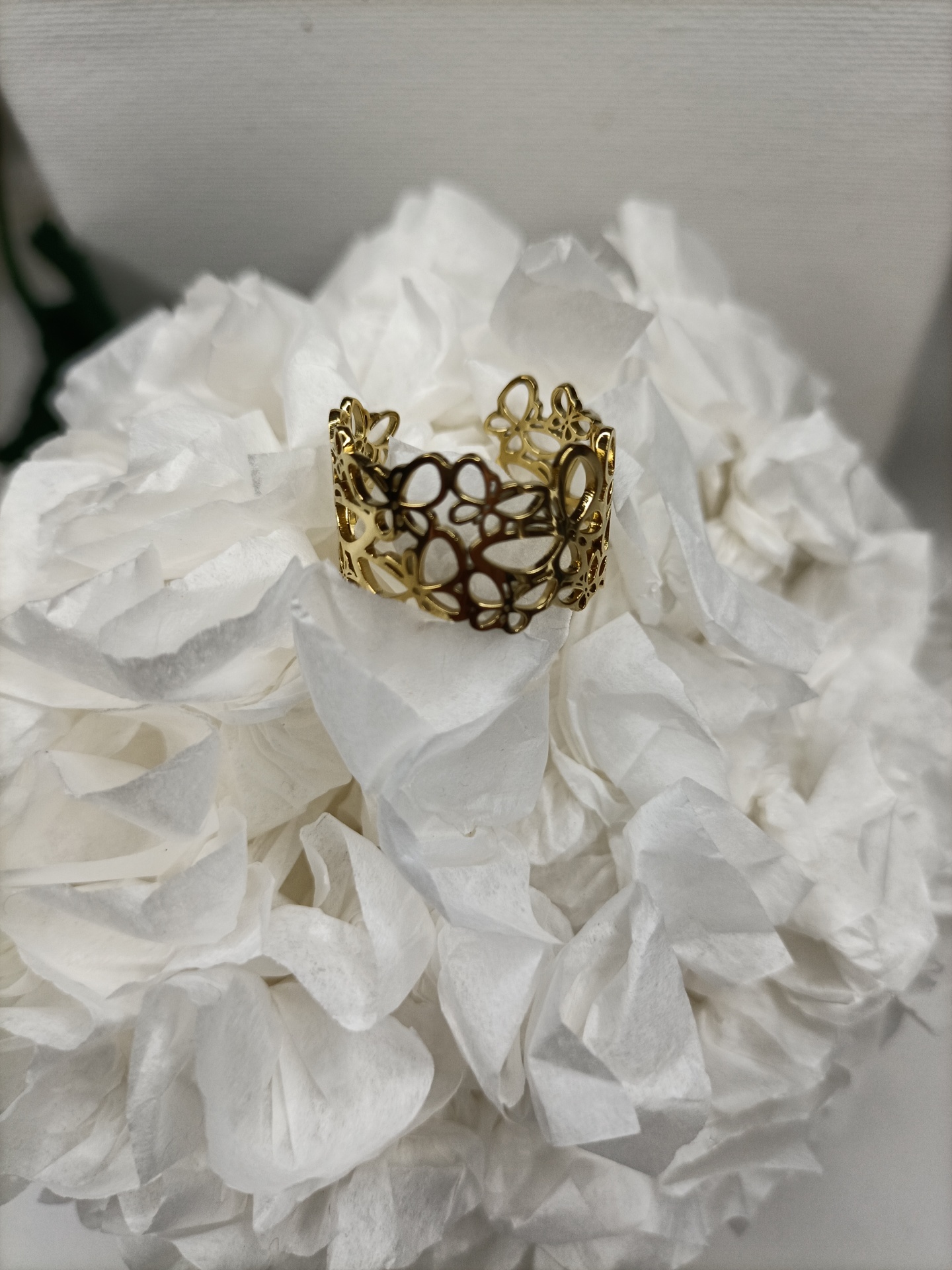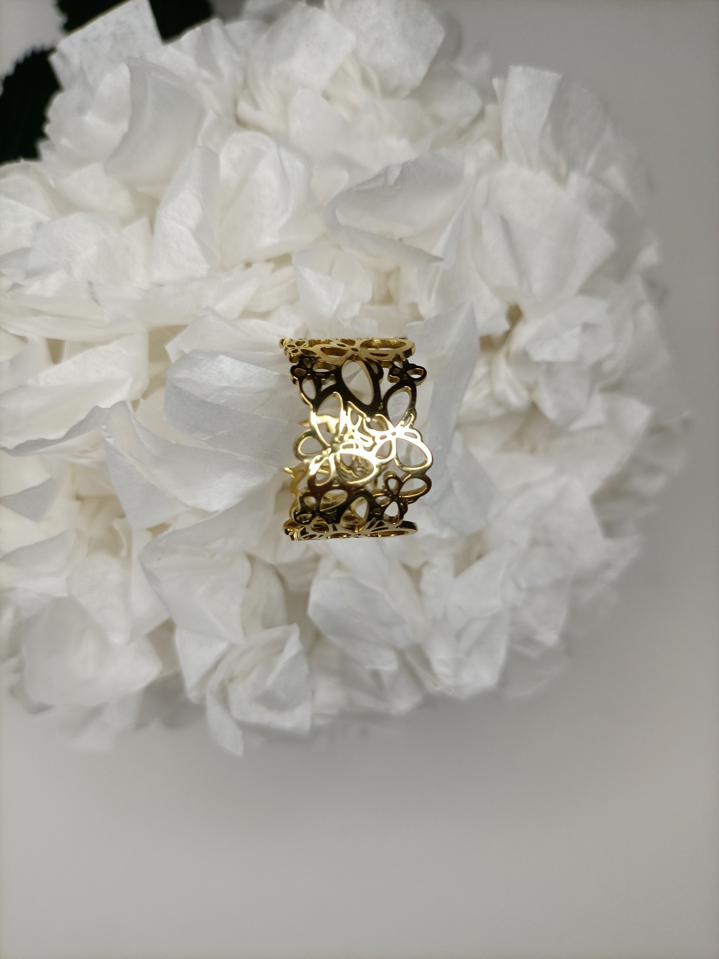 • Anel dourado com padrão recortado em fundo de flores de papel brancas