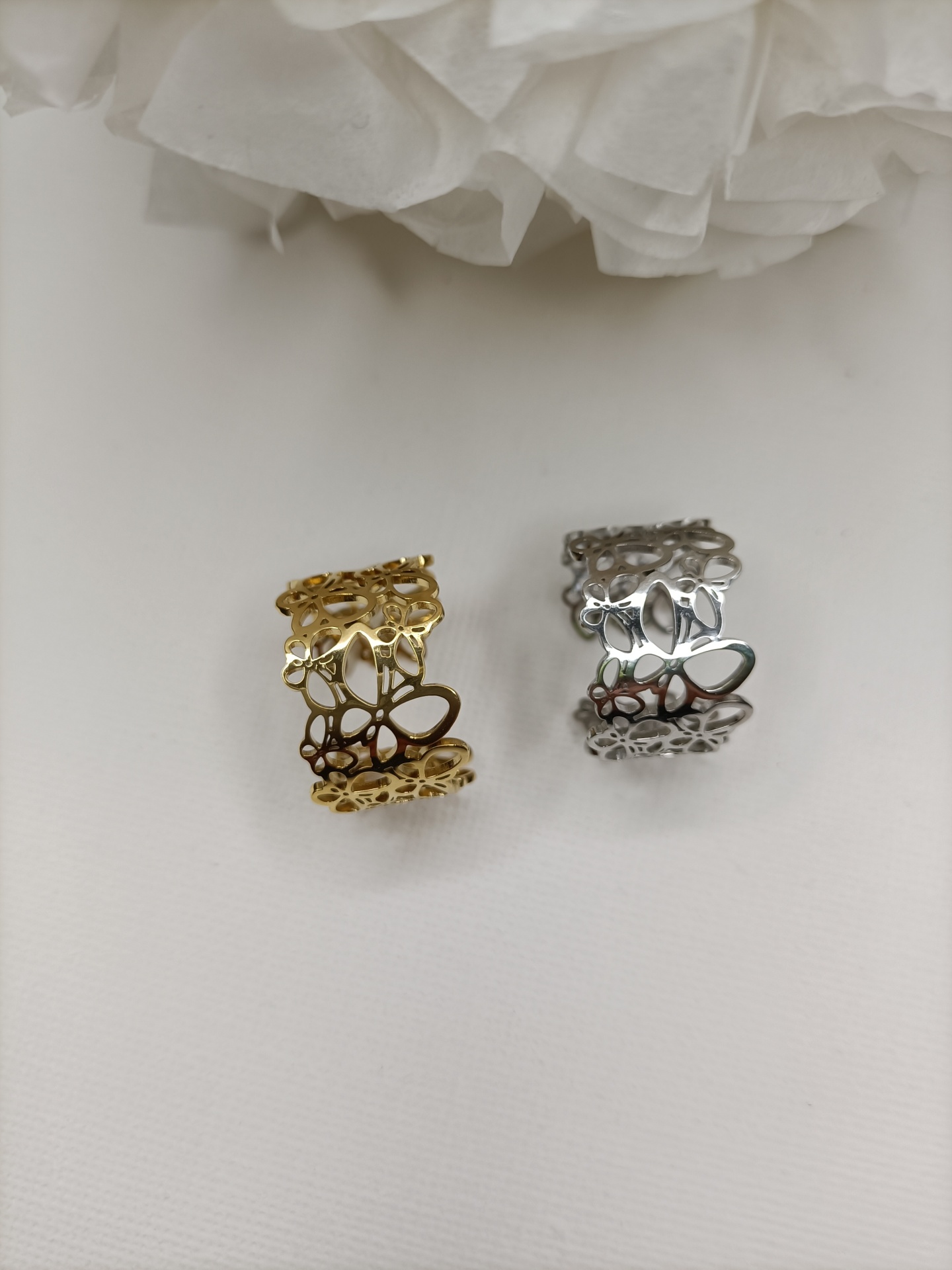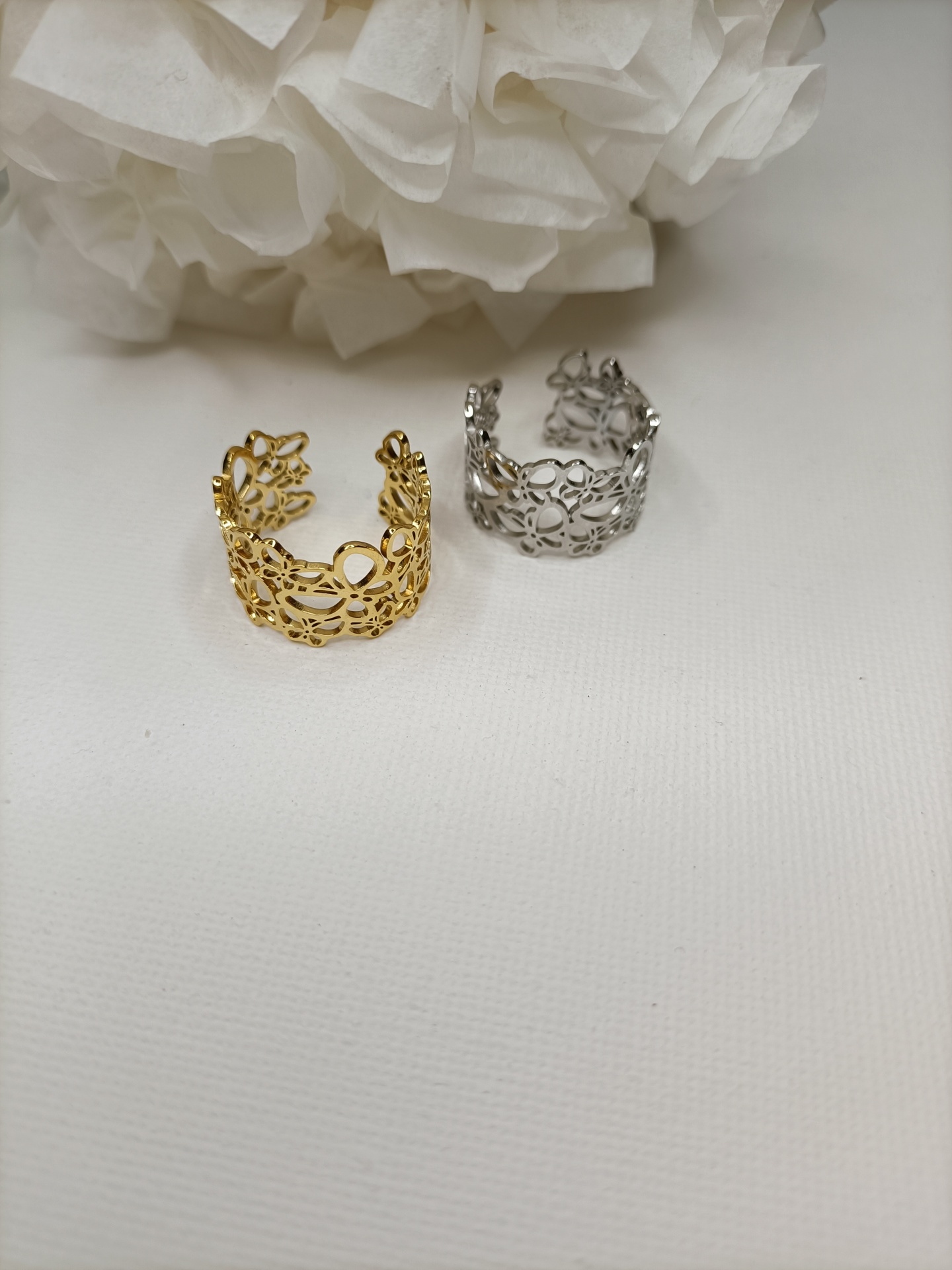 • Par de anéis abertos dourado e prateado com design de renda circular sobre fundo branco.