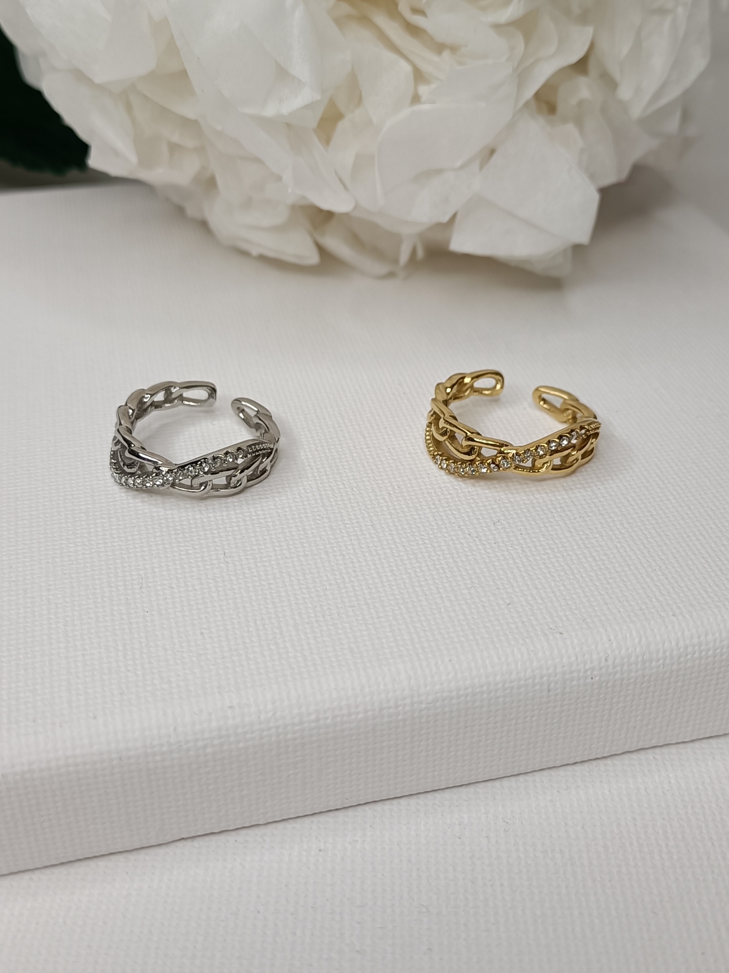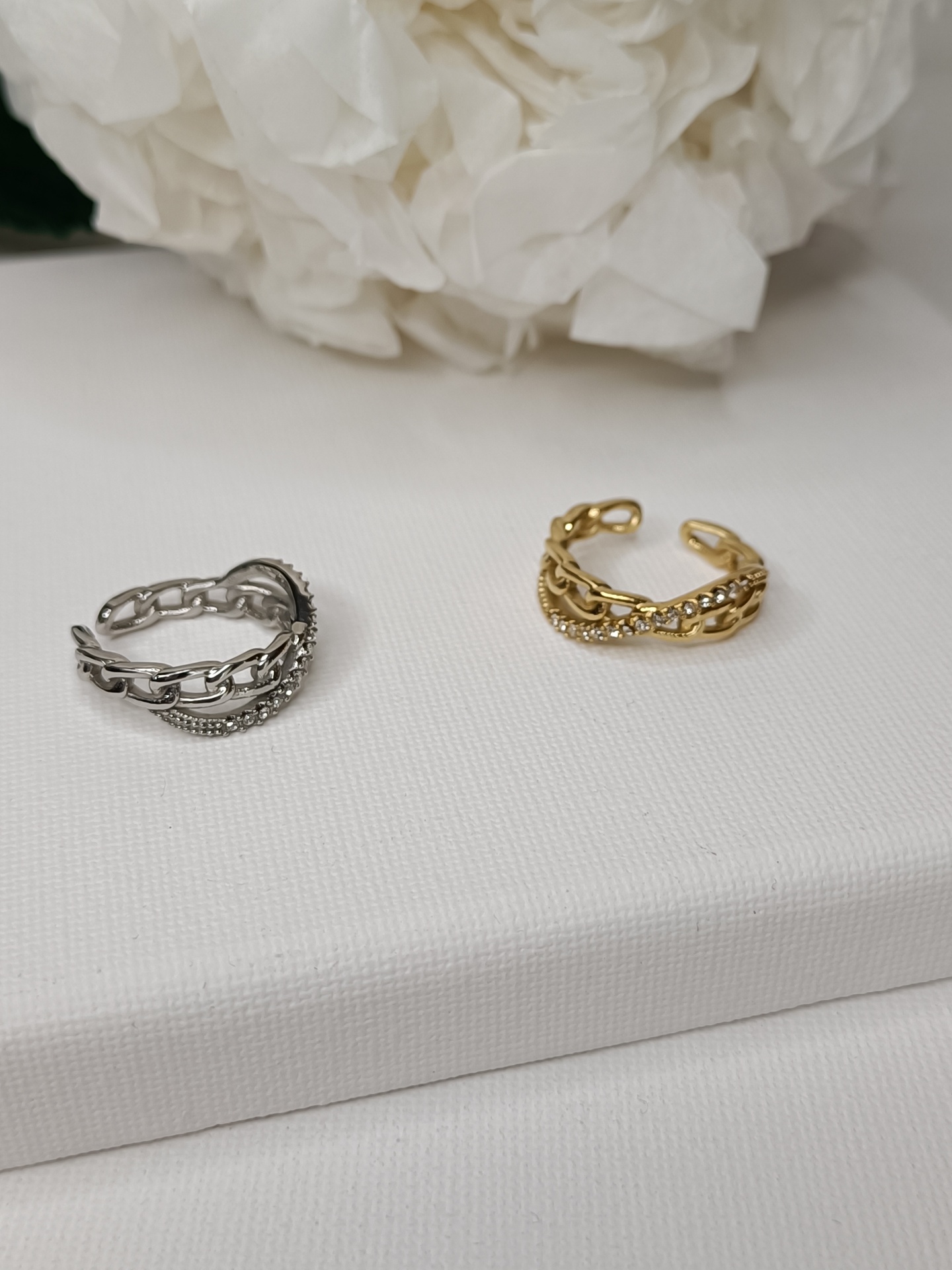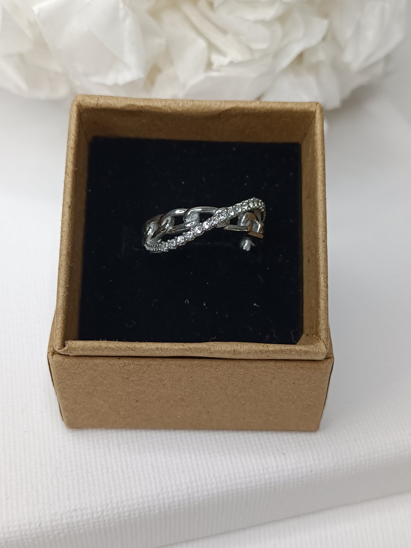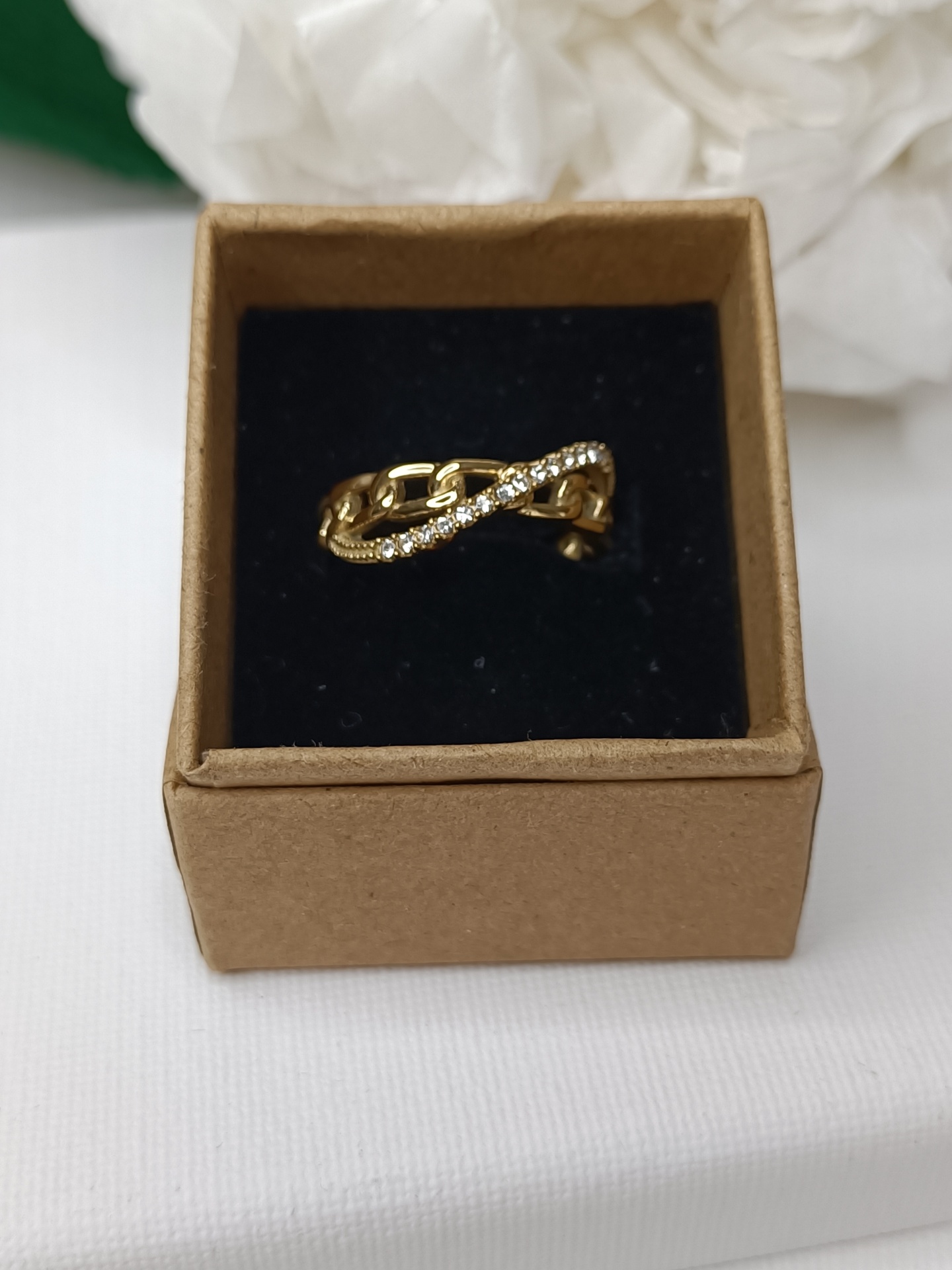 Anel Londres 11,90 € Desconto de %. Partilhar Cor Dourado Prateado Comprar Contactar SKU: MB113 Anel com sobreposição de faixa cravejada de zirconias sobre elos. 🔸 Material: Aço inoxidável 🔸 Tamanho: ajustável (recomendo para tamanho 12 ao 17)