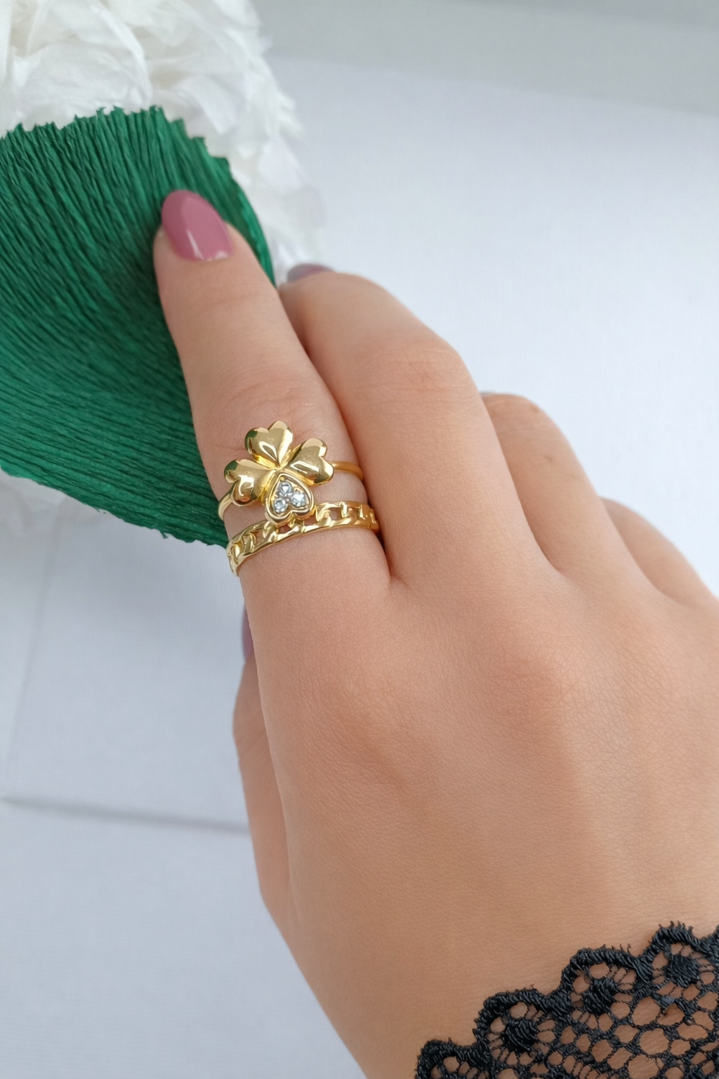 • Mão com dois anéis dourados, folha verde artificial e renda preta