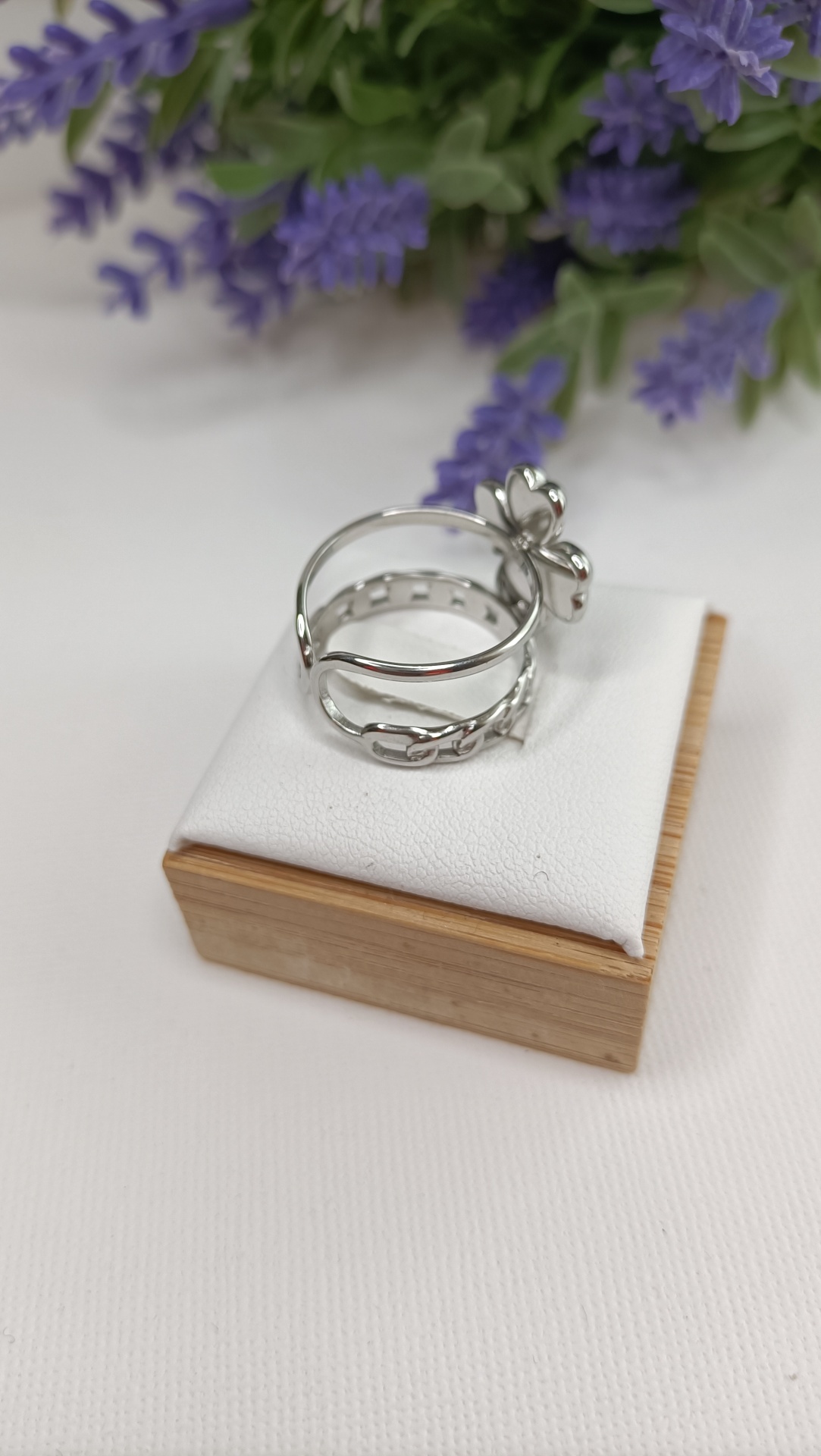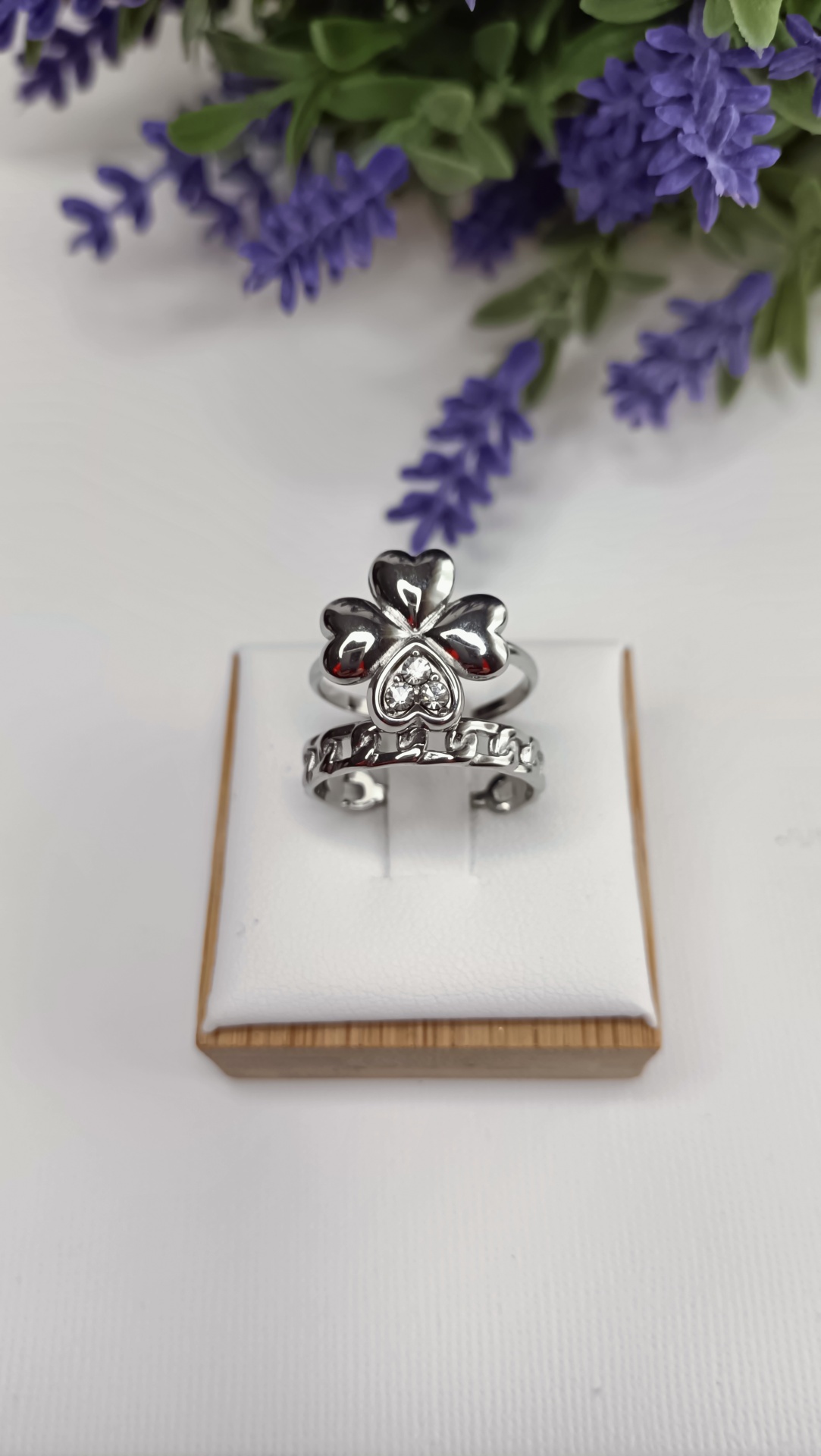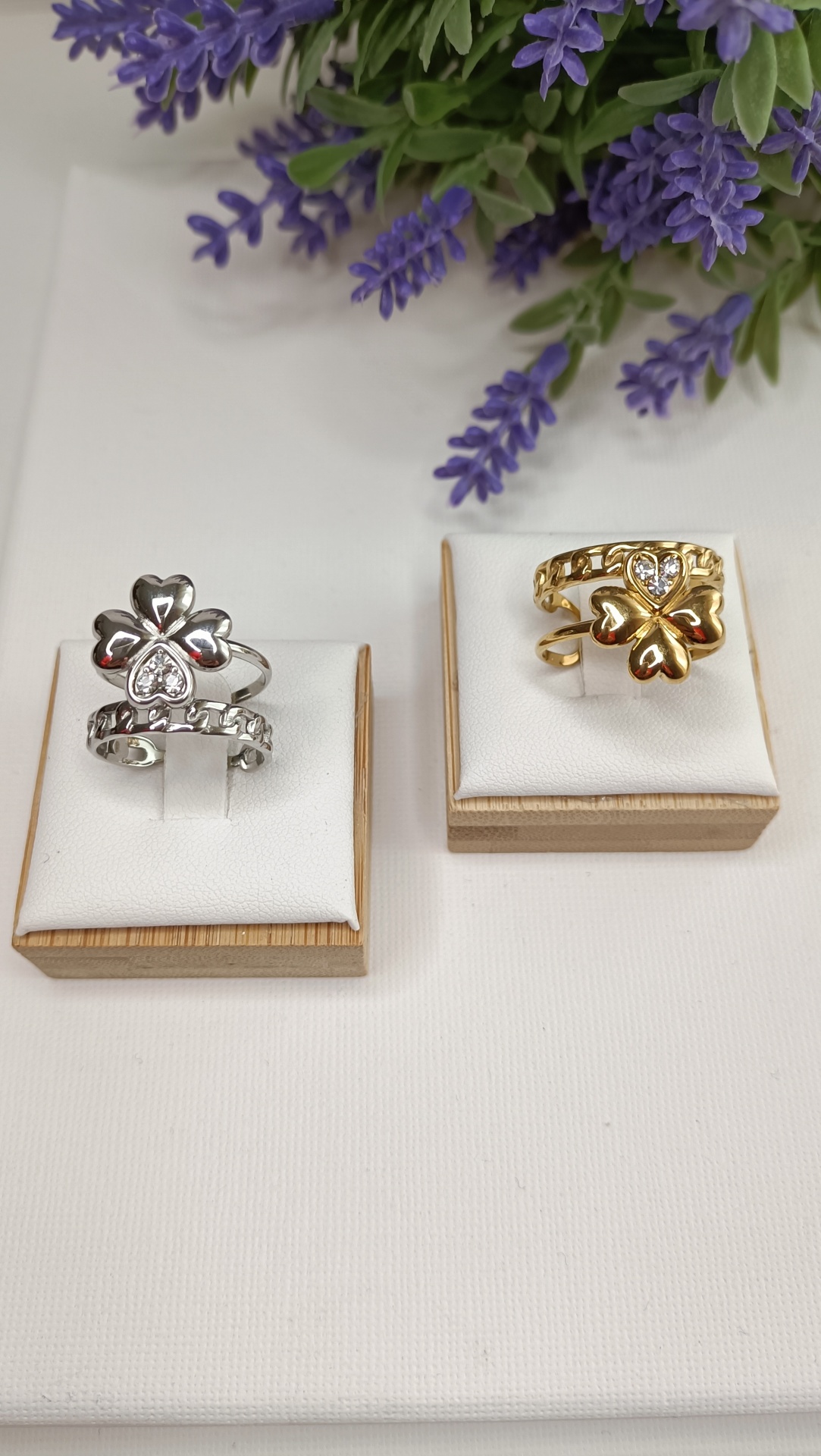 • Dois anéis com trevo, um prateado e outro dourado, expostos em suportes brancos e base de madeira com flores lilases ao fundo