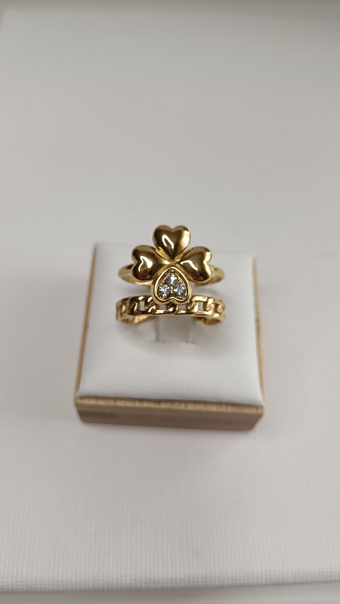 Este nosso anel duplo com um trevo de 4 folhas, uma das quais com zirconias e uma corrente. O trevo de quatro folhas é mundialmente reconhecido como um símbolo de boa sorte, raridade e prosperidade.