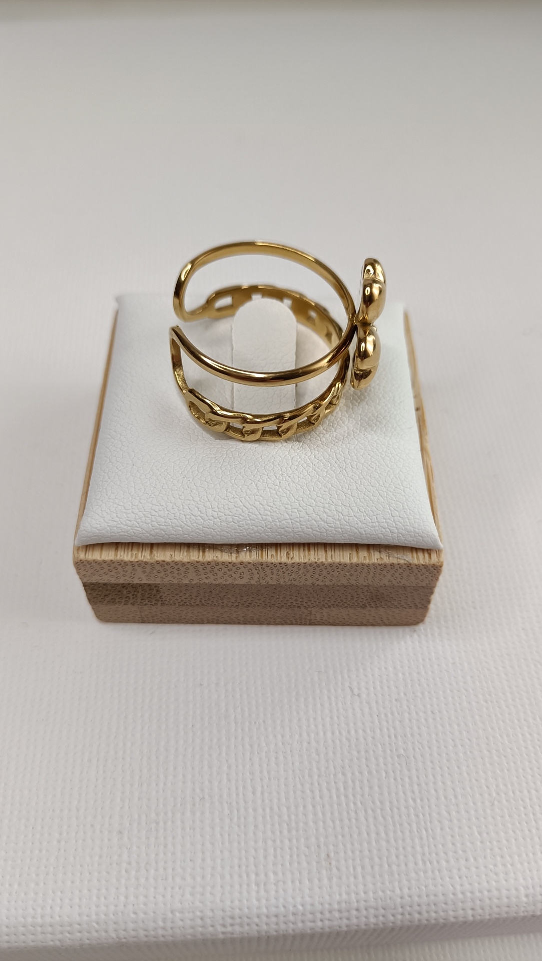 • Anel dourado com laço e padrão de elos sobre almofada branca e base de madeira