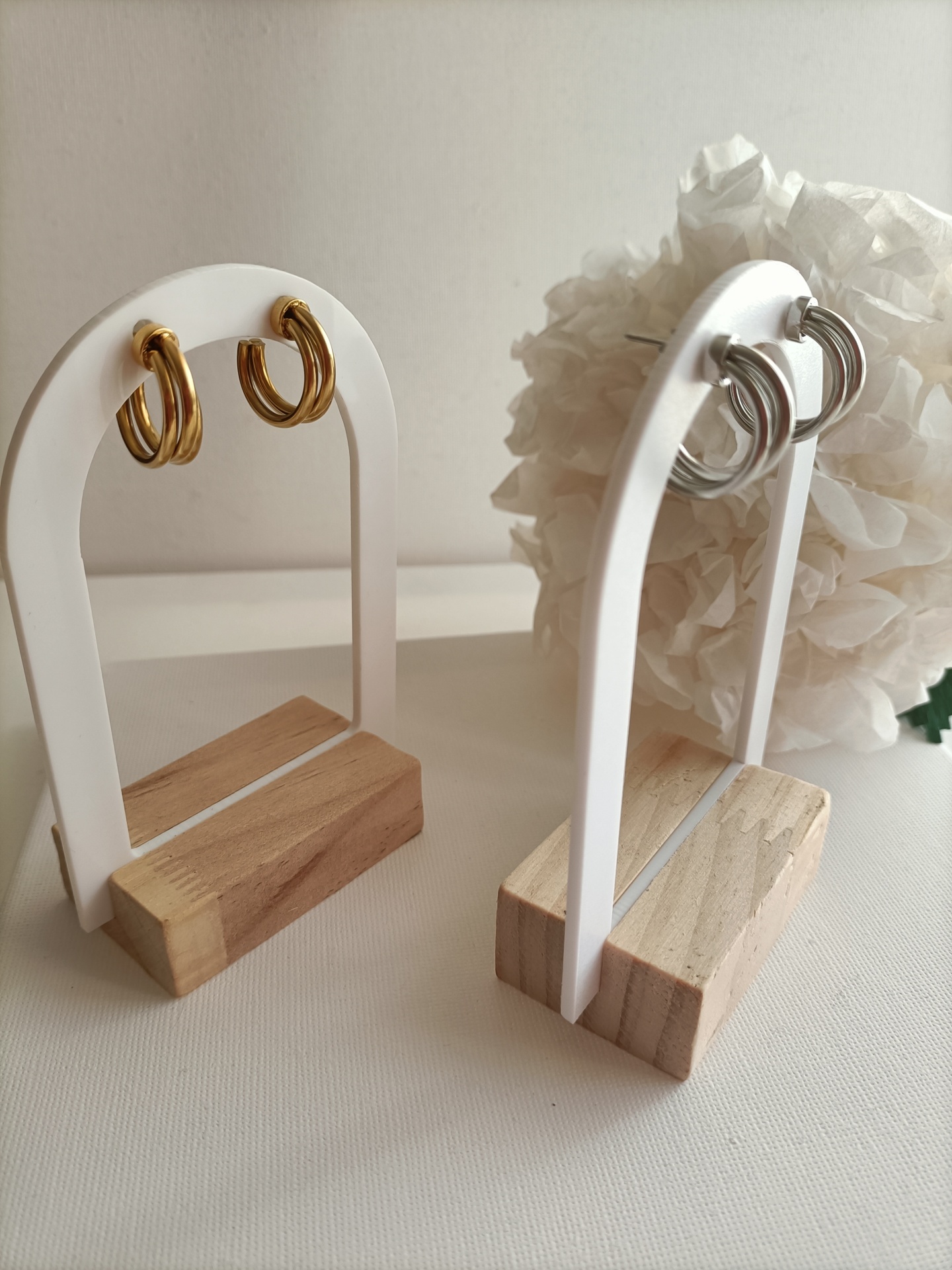 • Brincos de argola duplos dourados e prateados em suportes brancos com base de madeira