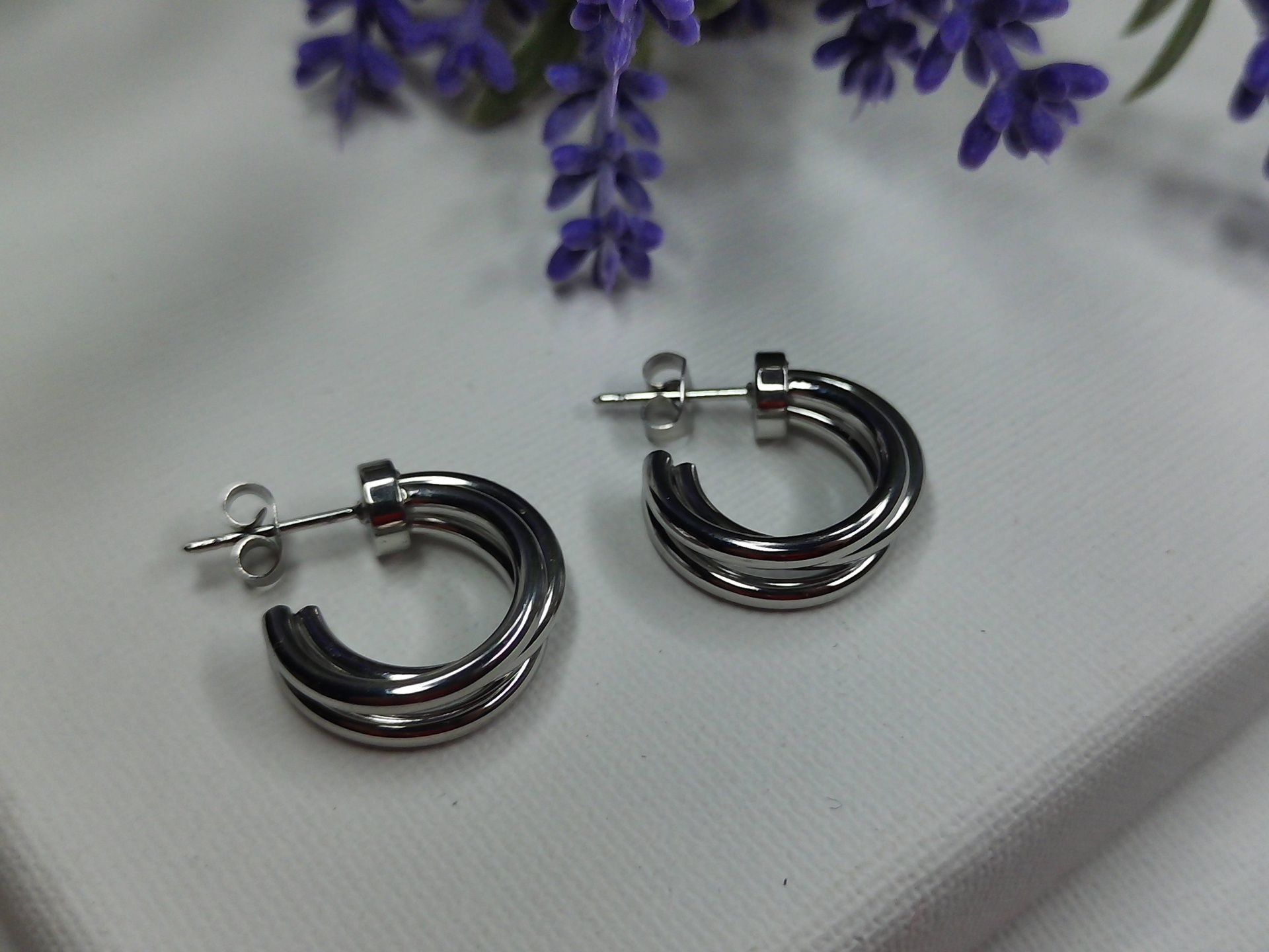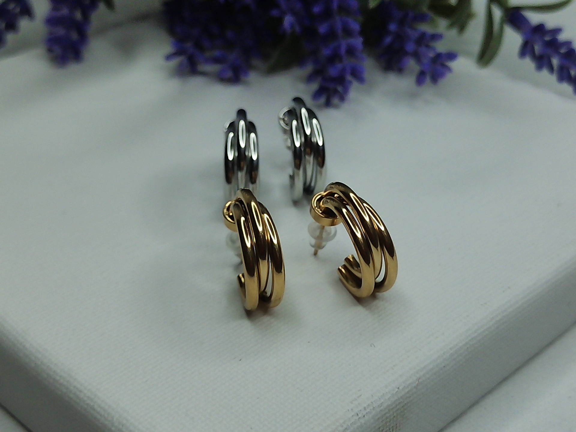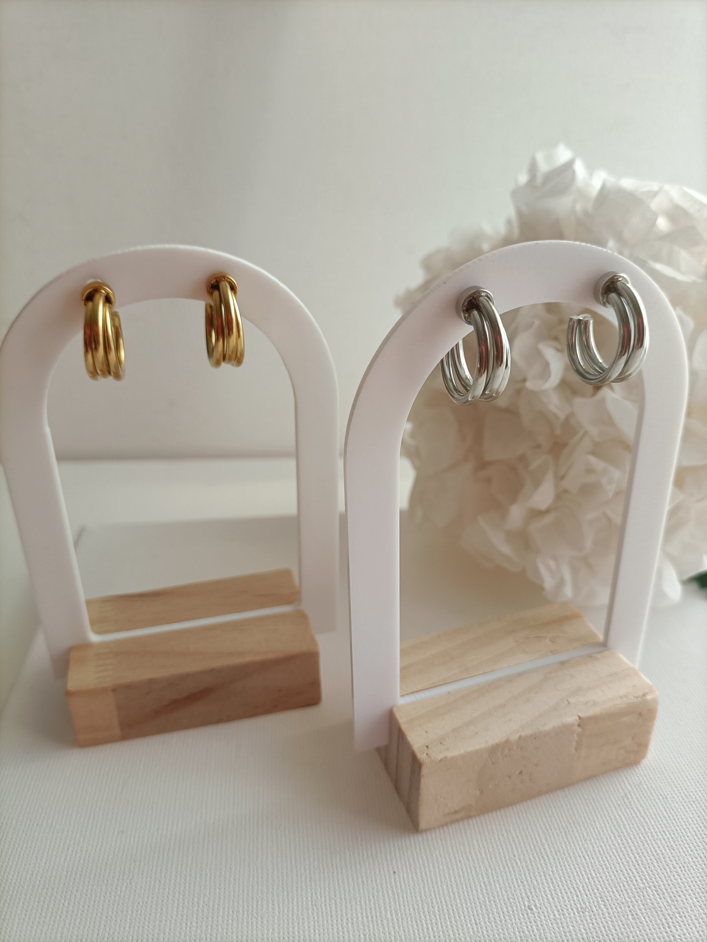 Um design moderno e marcante para quem procura um acessório versátil e cheio de estilo. Estas argolas triplas em aço inoxidável estão disponíveis em dourado ou prateado, oferecendo brilho e sofisticação ao look.