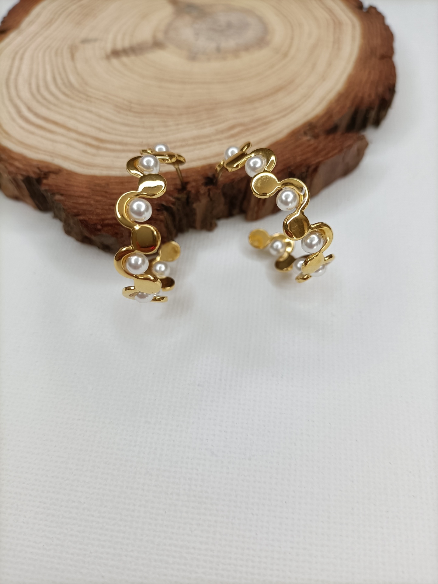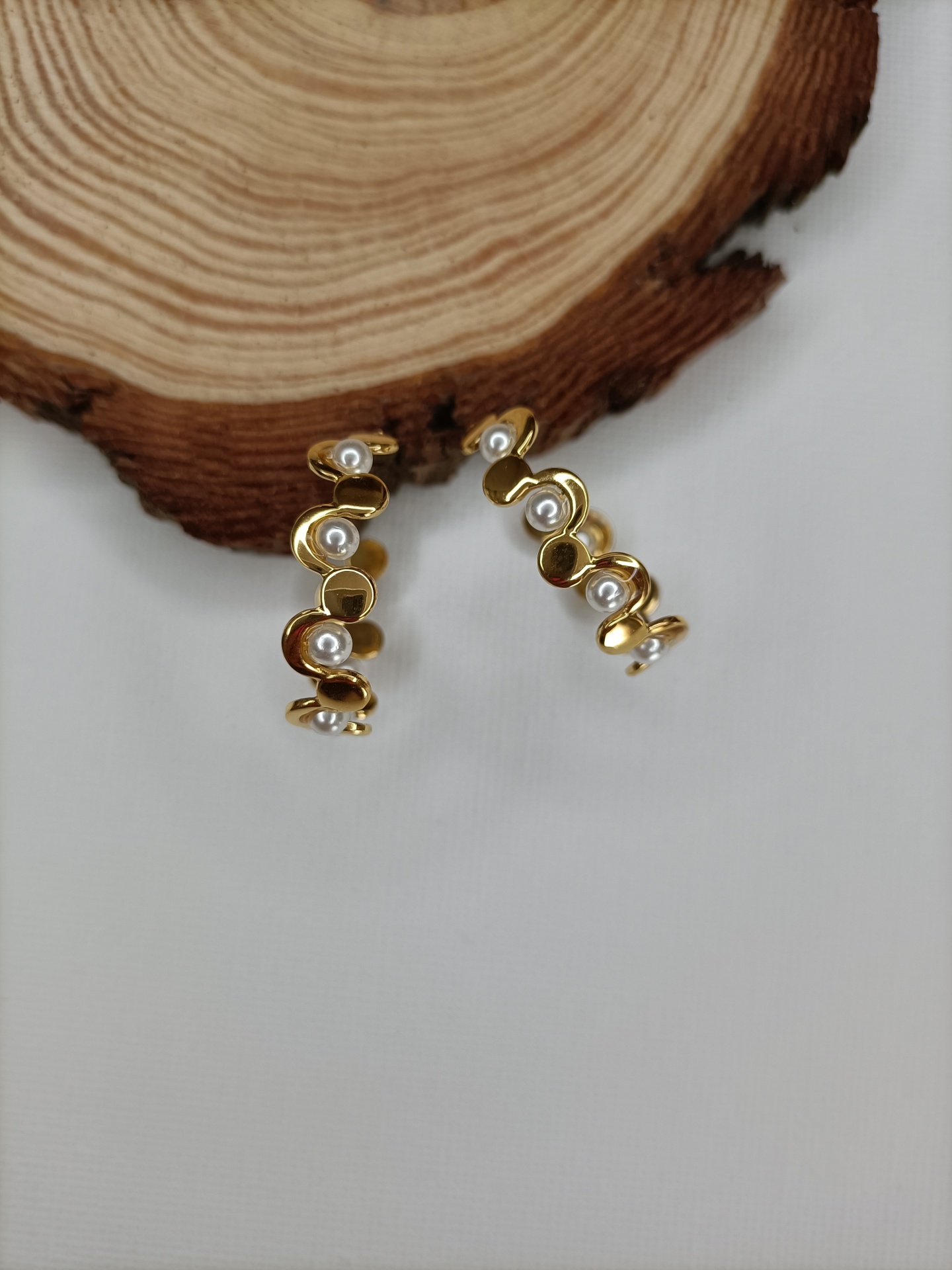 • Brincos dourados com pérolas e fundo branco com madeira