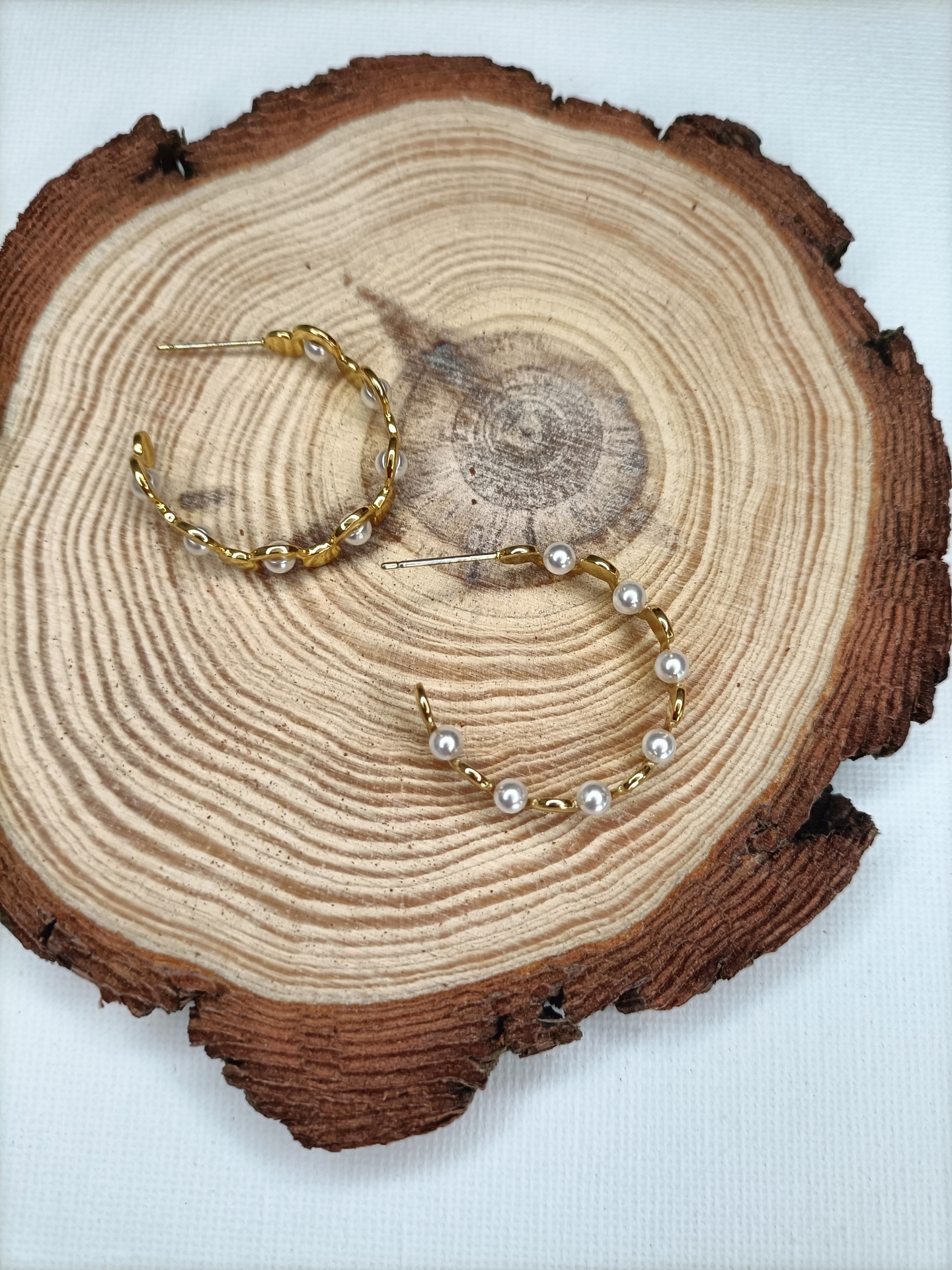 • Brincos argola dourados com pérolas numa base de madeira sobre tecido branco