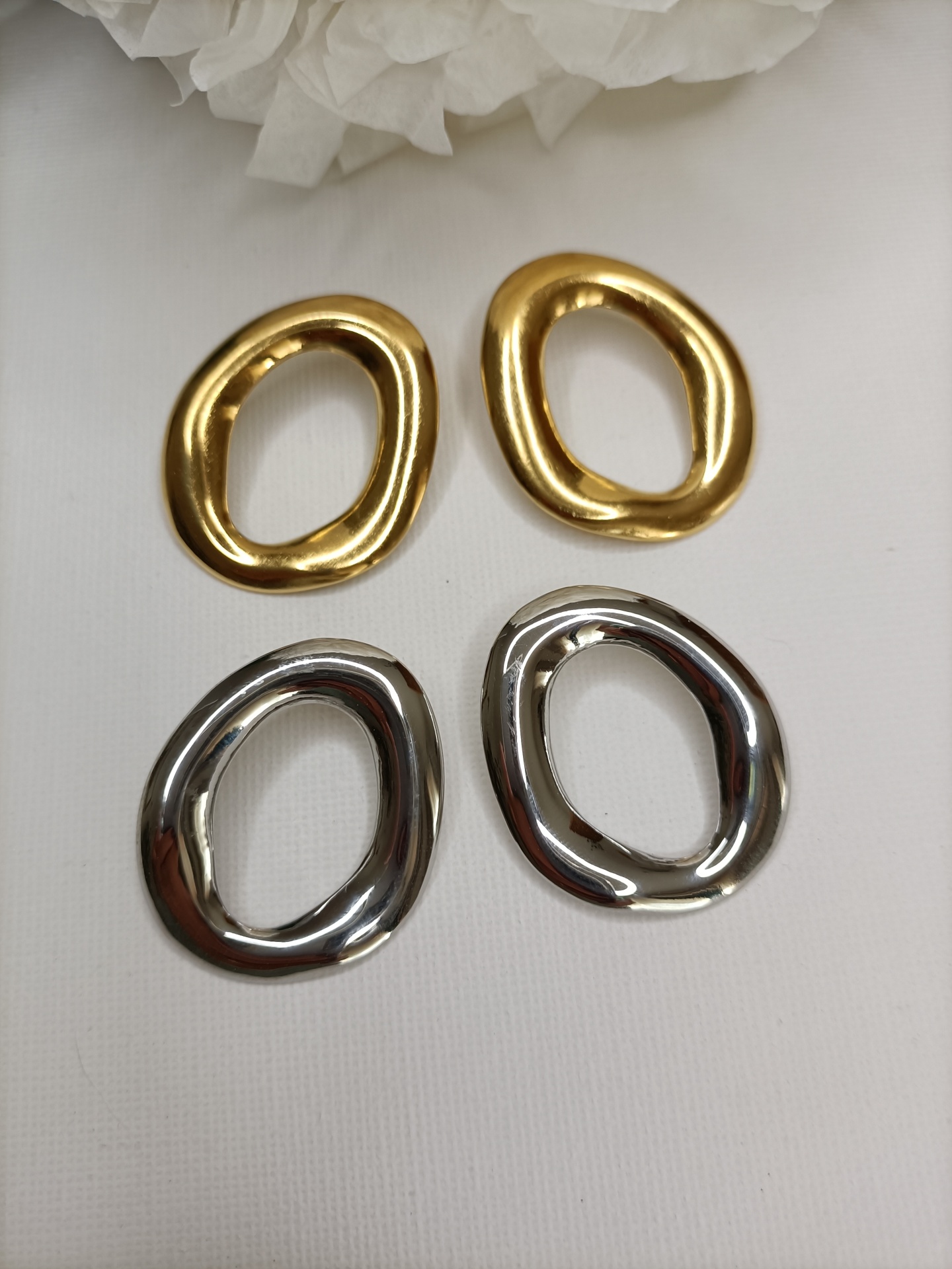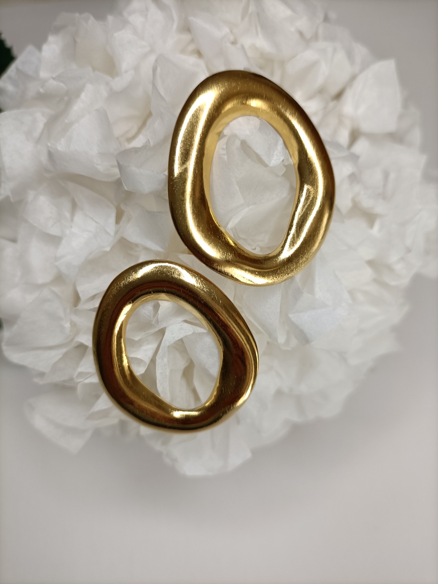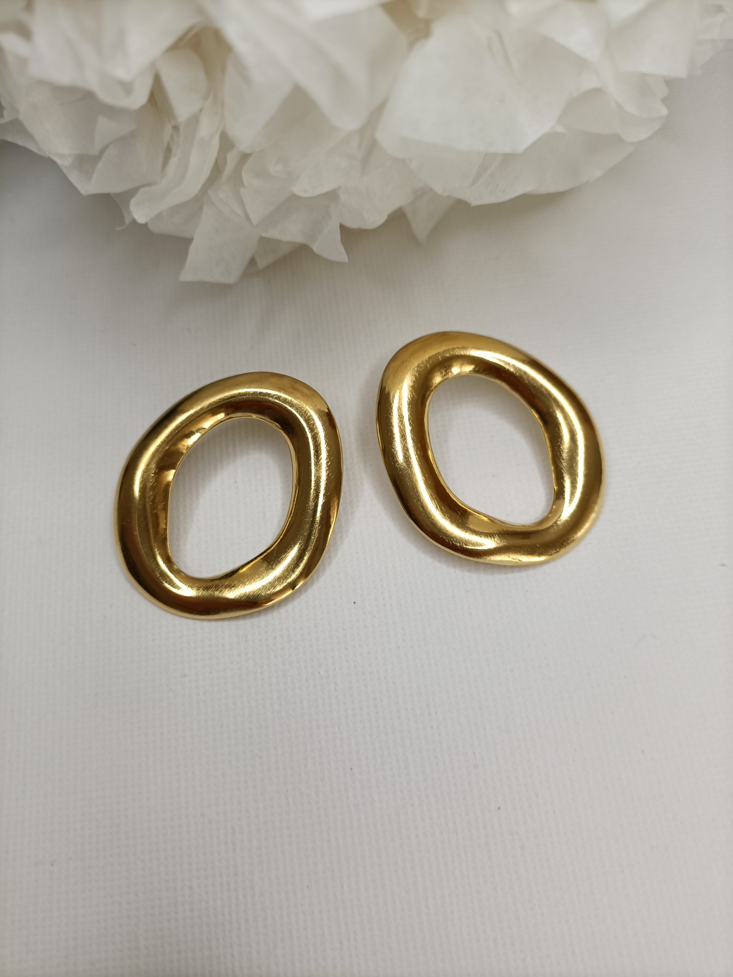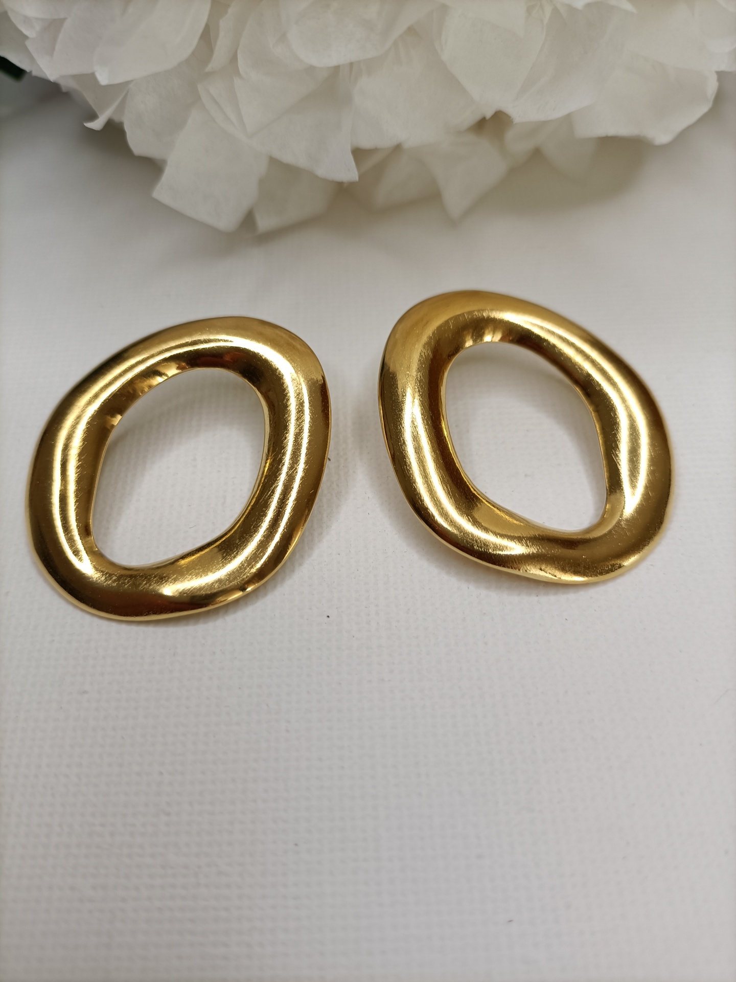 • Brincos dourados ovais irregulares sobre fundo branco com flor branca ao fundo