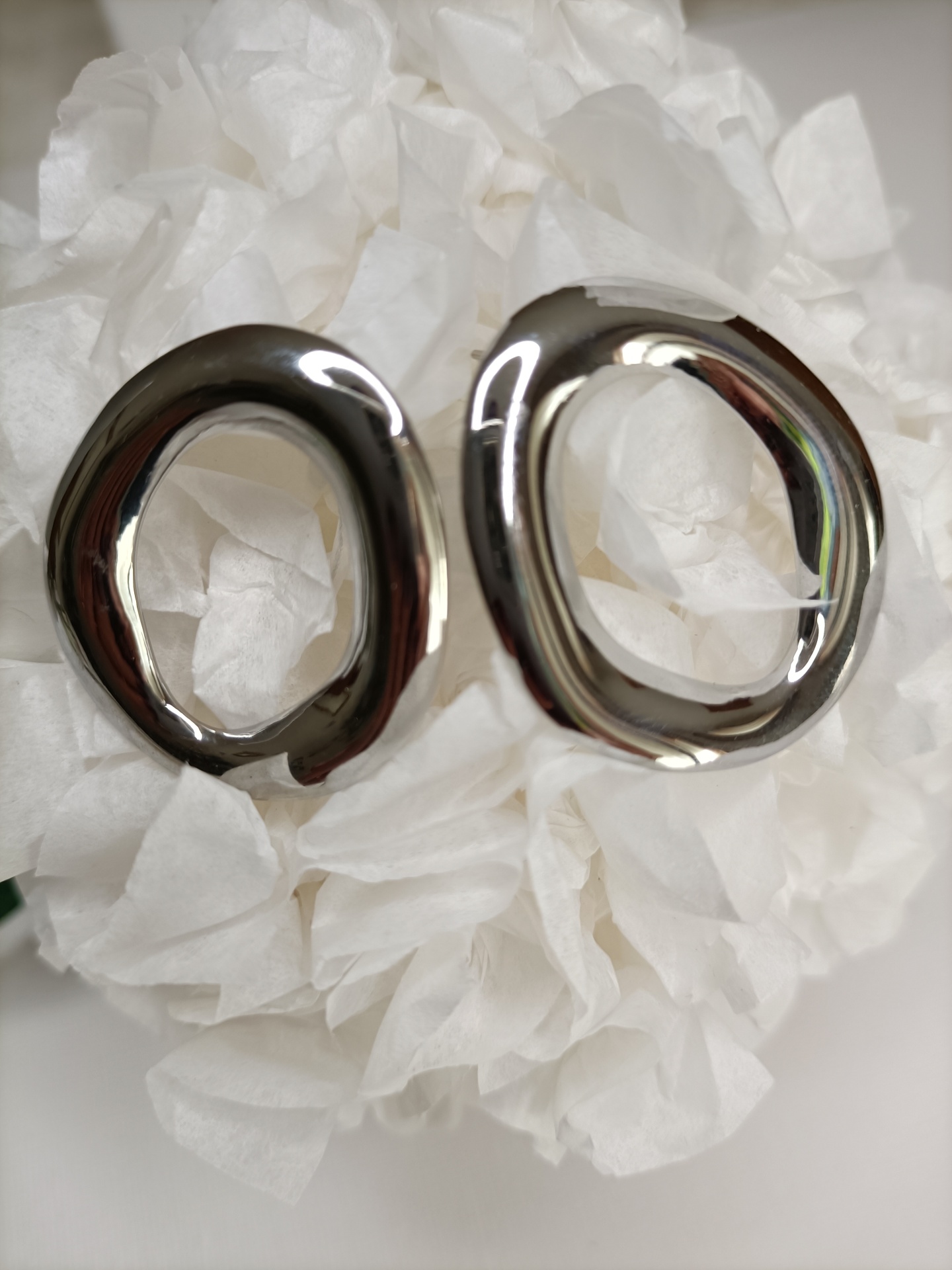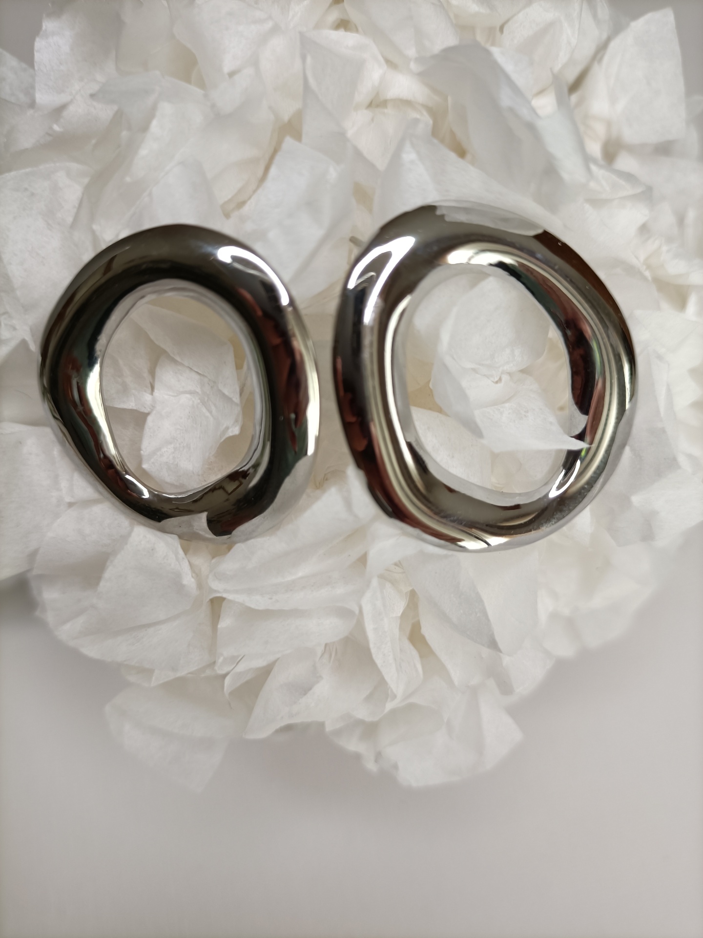 • Quatro argolas metálicas irregulares, duas douradas e duas prateadas, com fundo branco e flor branca