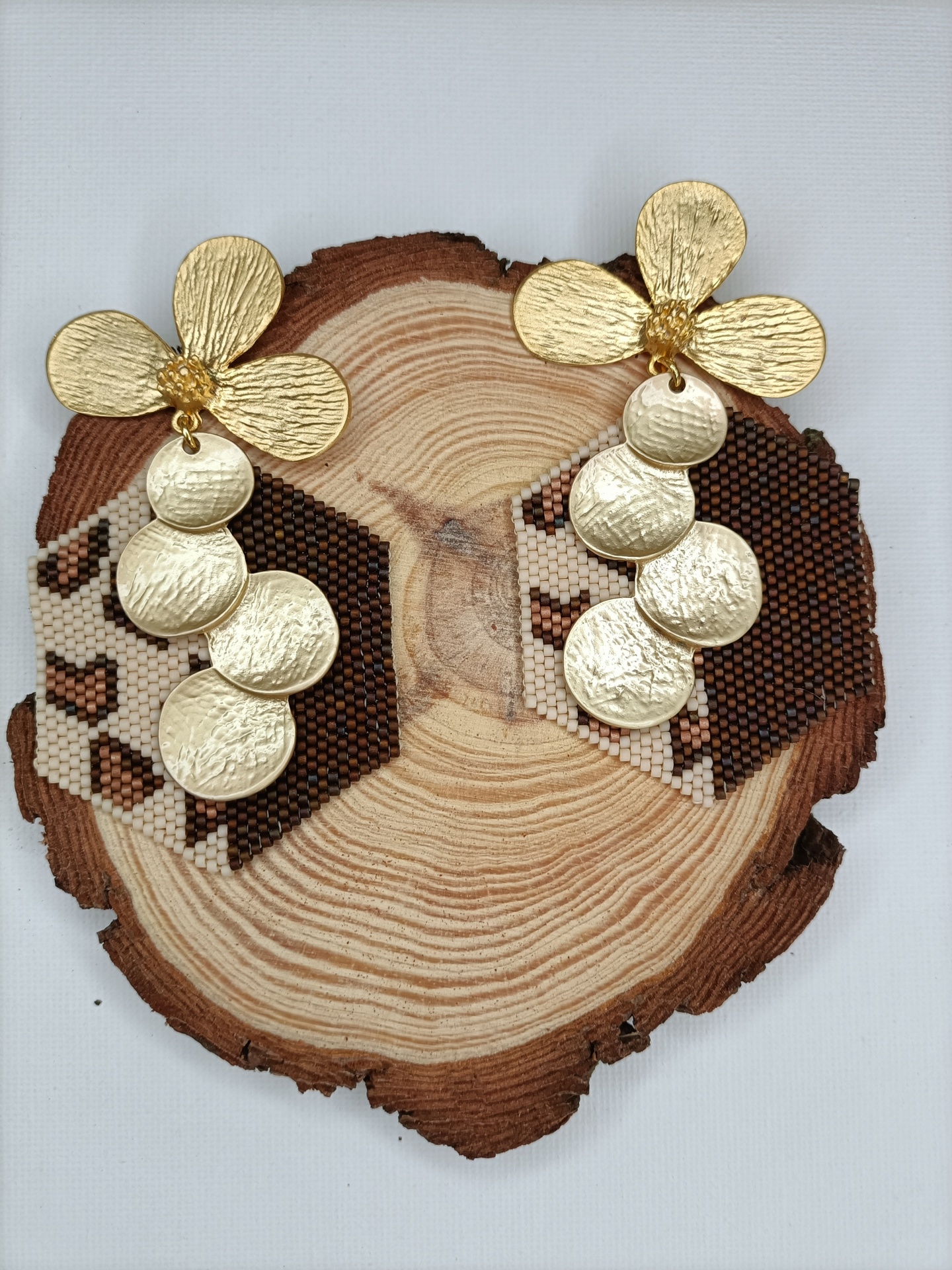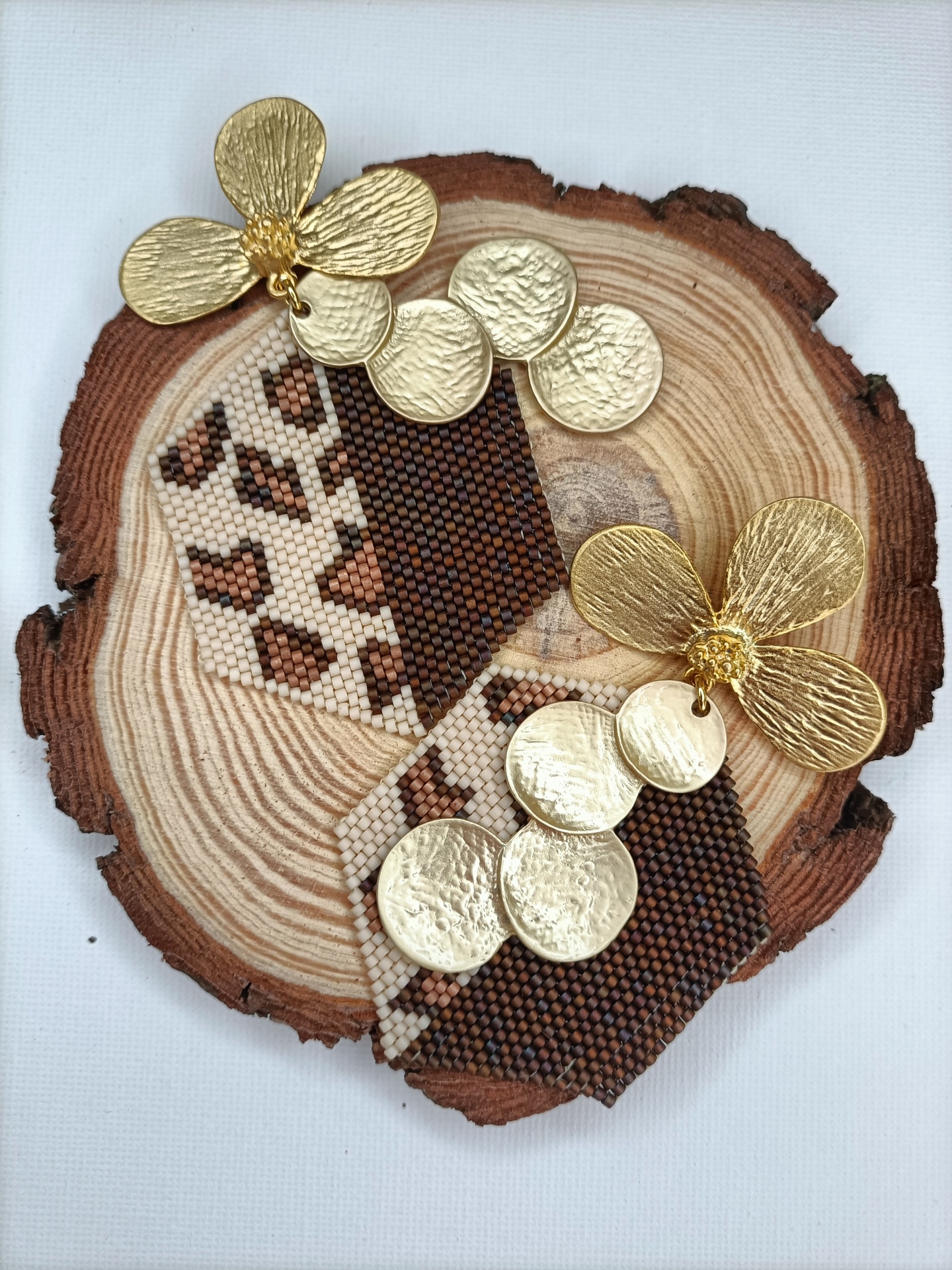 Esses brincos artesanais são uma peça única, confeccionada à mão com missangas delicadamente entrelaçadas. O design em formato geométrico em duas partes, uma lisa e outra padrão tigre em tons terrosos — bege, caramelo, cobre e marrom — que se fundem em um padrão elegante e orgânico.
