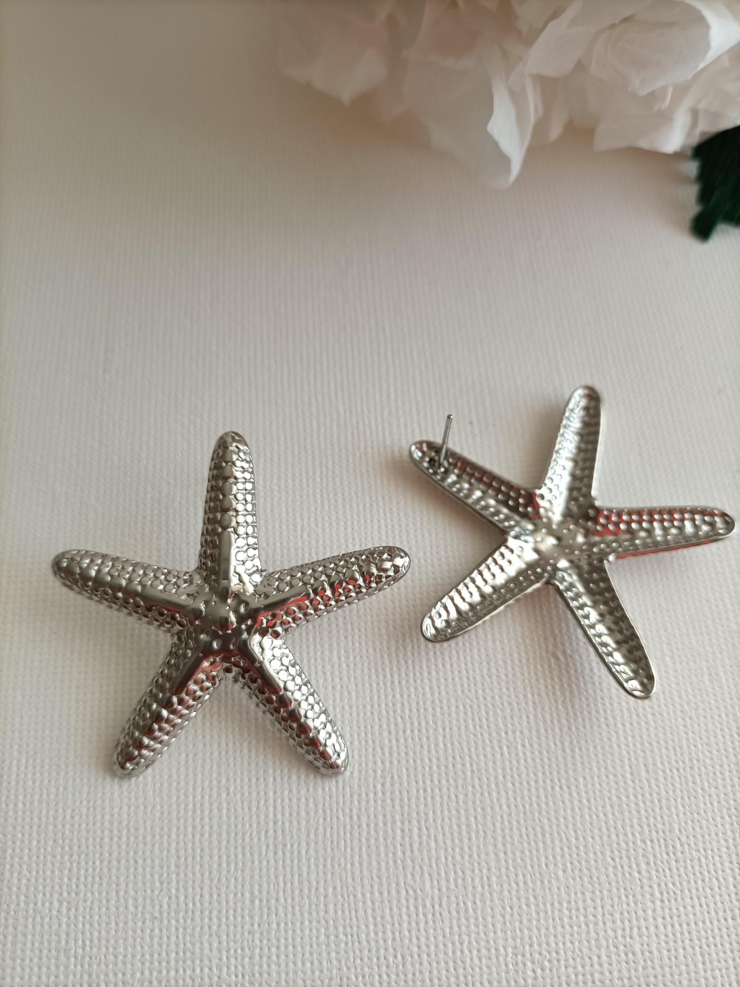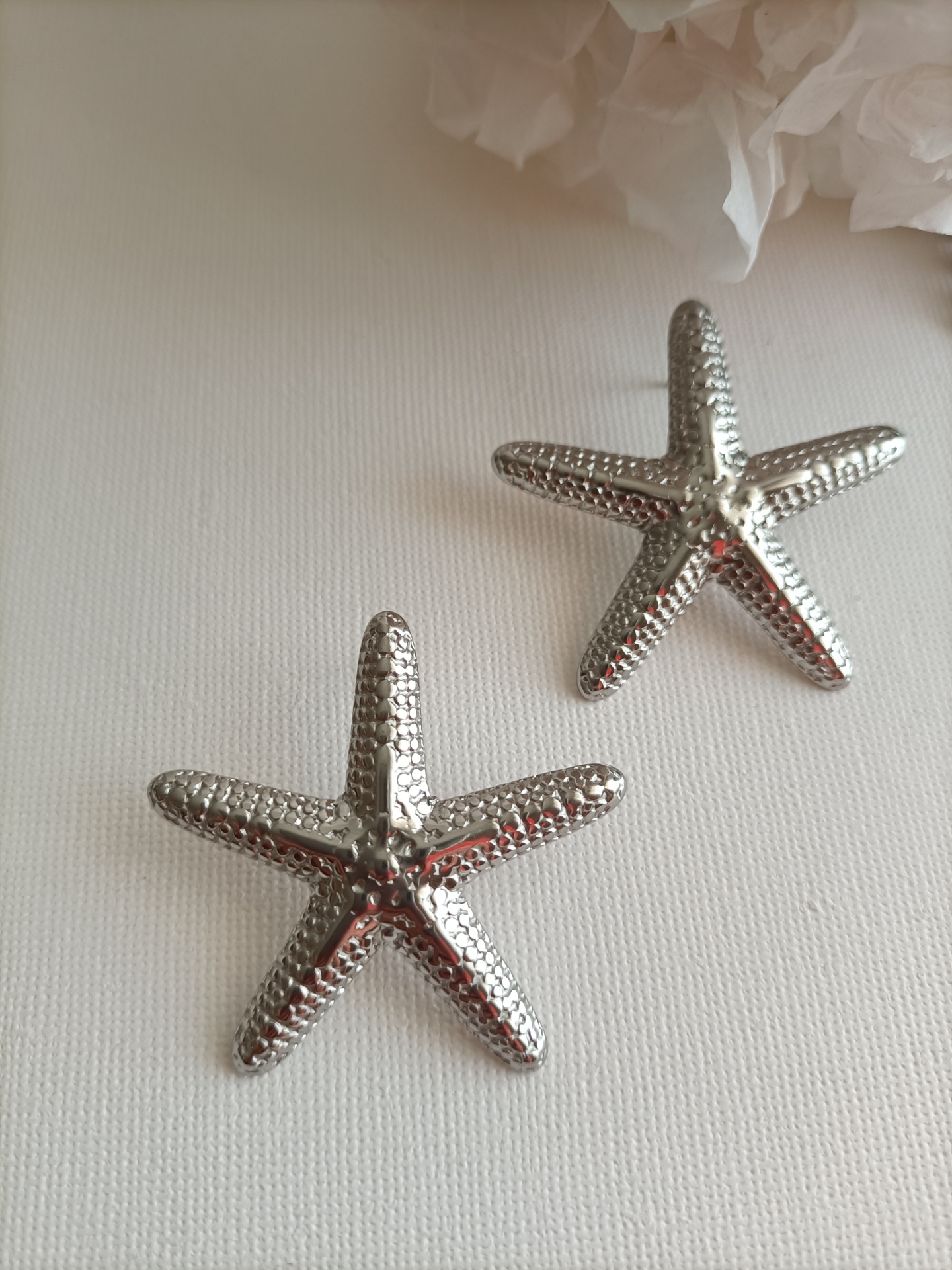 • Brincos estrela do mar prateados com textura sobre superfície branca