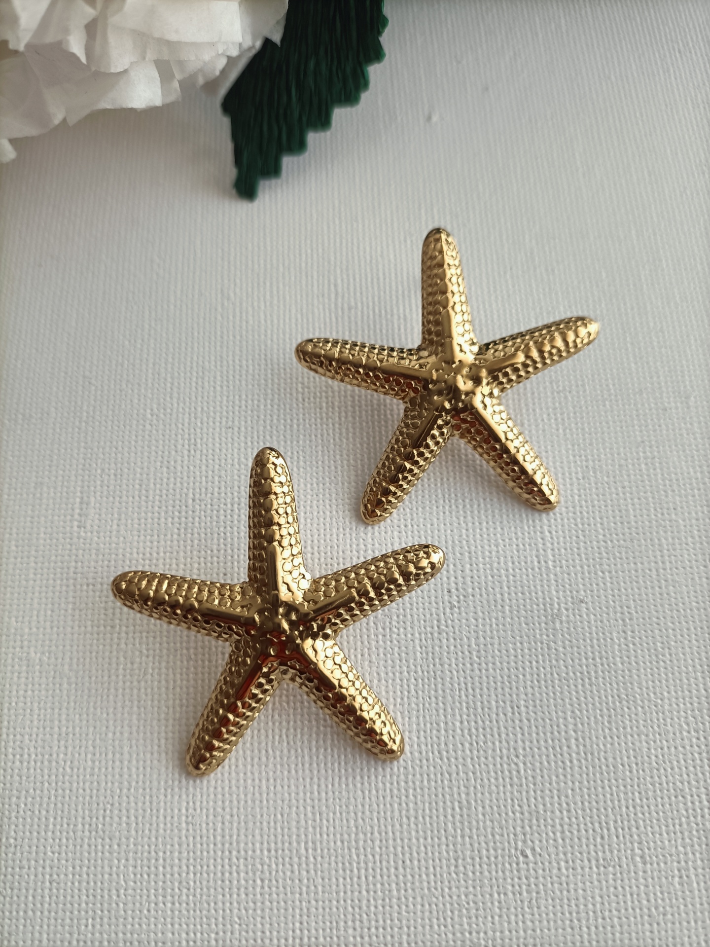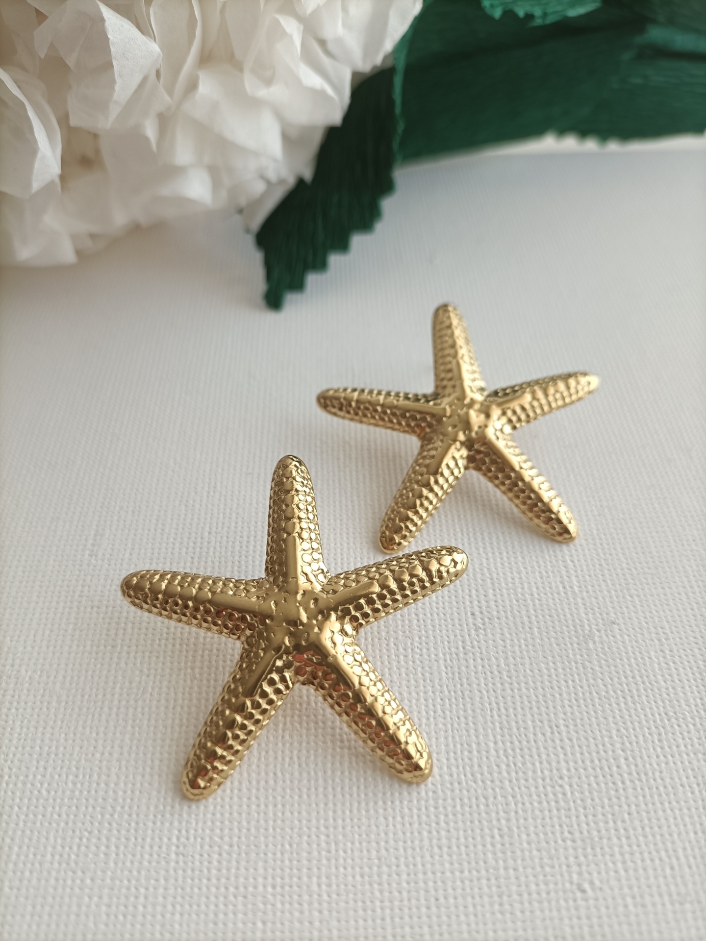 • Brincos dourados em forma de estrela do mar sobre fundo branco com decoração branca e verde