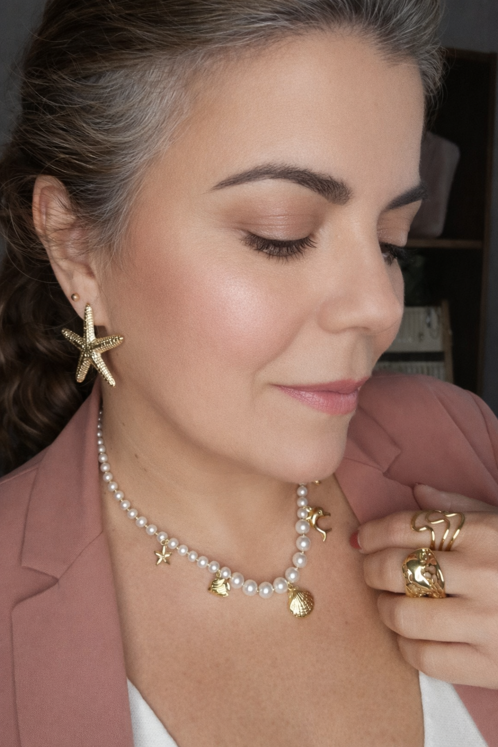 Mulher a usar brincos estrela do mar, colar de pérolas com pendentes dourados e anéis dourados