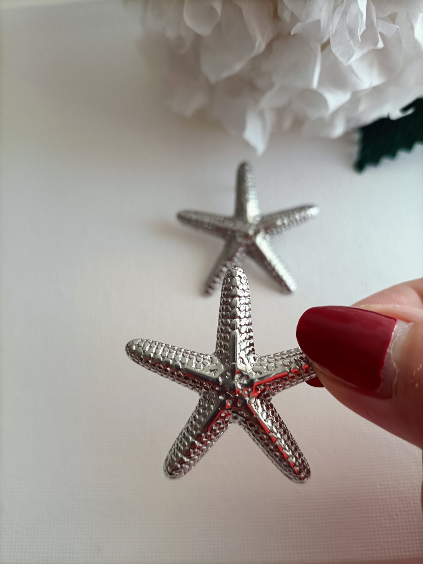 • Brincos prateados em forma de estrela do mar segurados por mão com unhas vermelhas