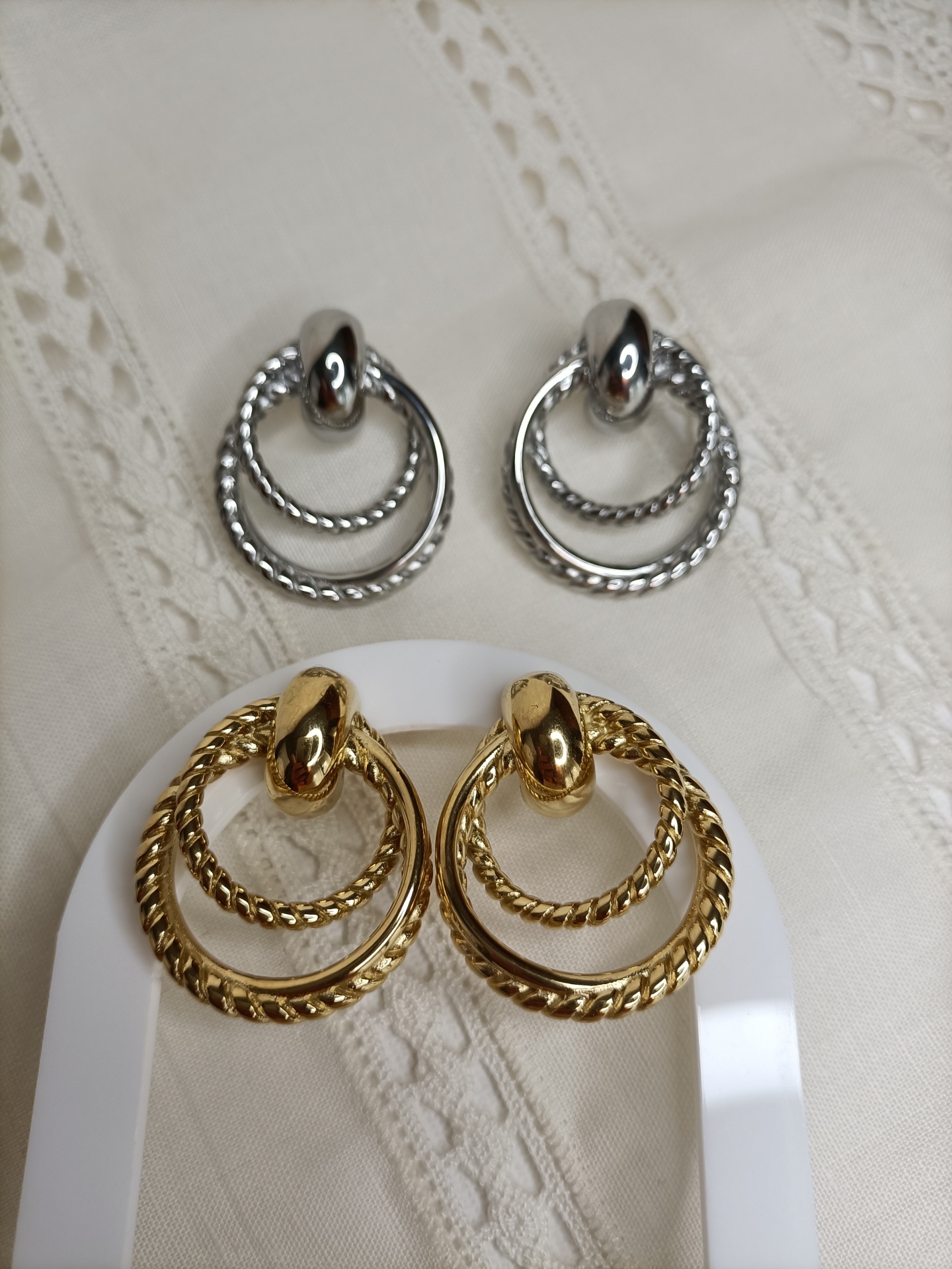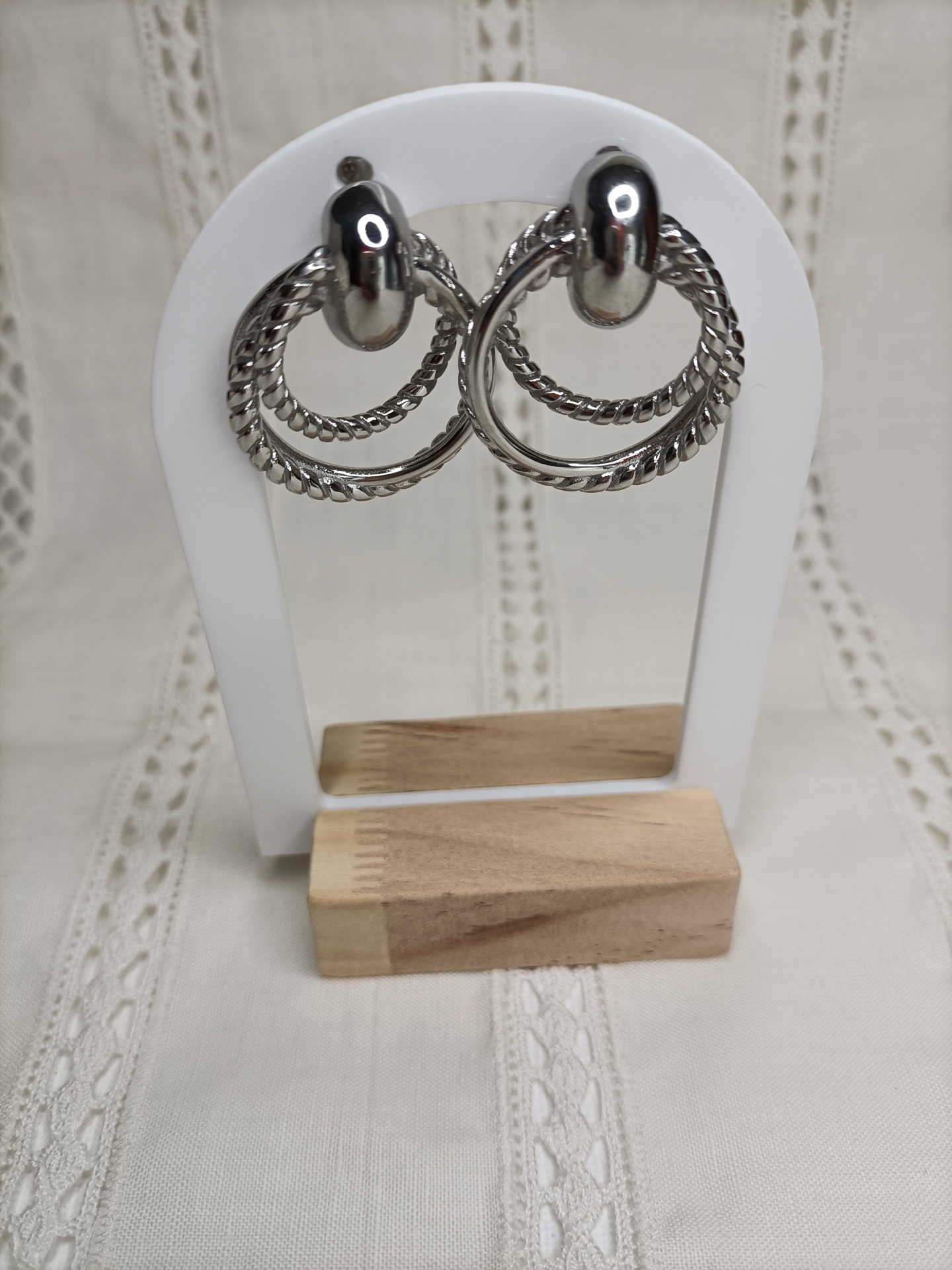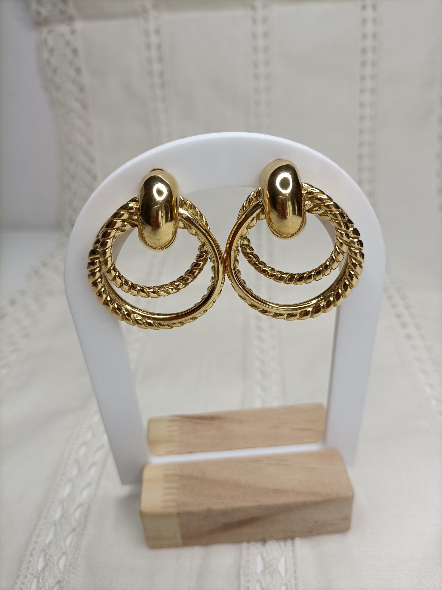 Brincos Luanda 11,00 € 17,90 € Desconto de %. Partilhar Cor Dourado Prateado Comprar Contactar SKU: MB72 Brincos com três argolas fixas. 🔸 Material: Aço inoxidável 🔸 Comprimento: 3cm