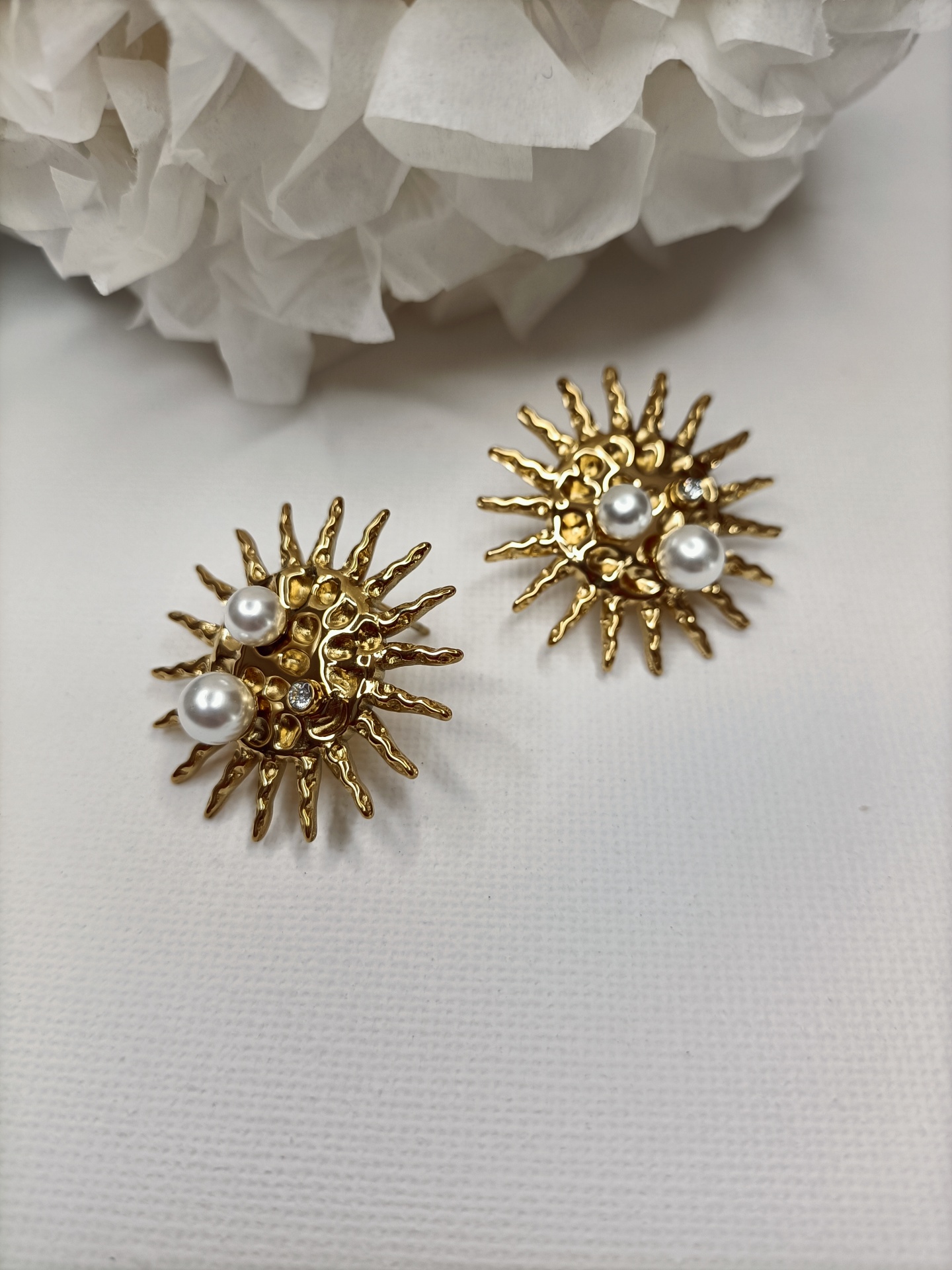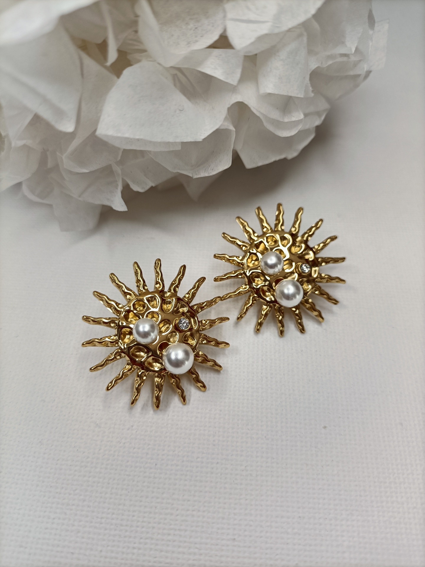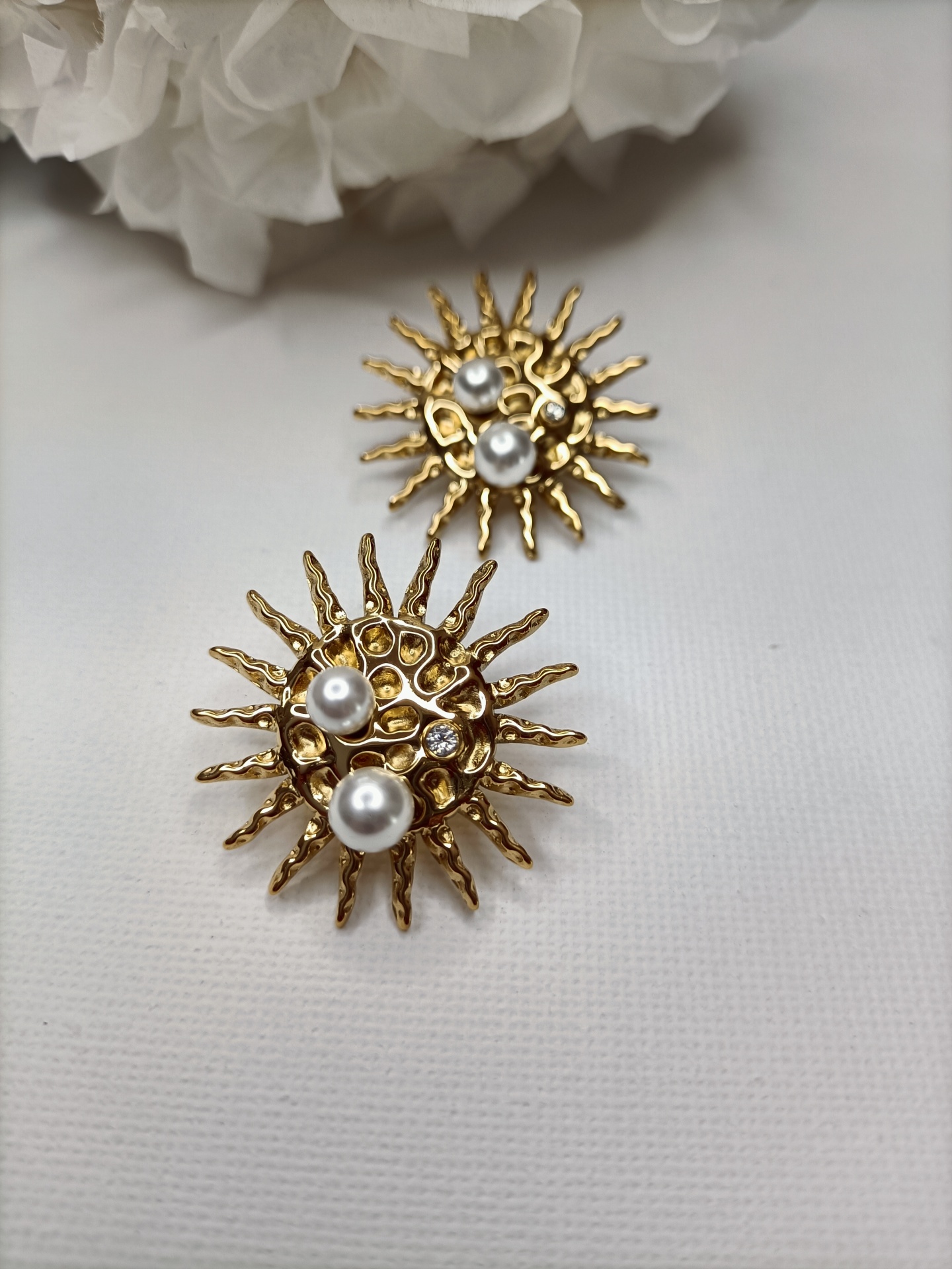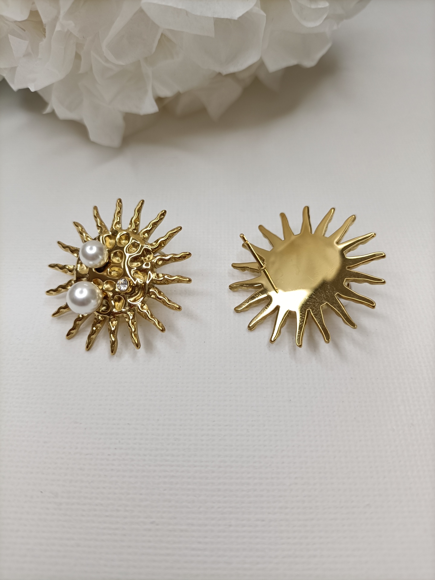 Ilumine o seu visual com estes brincos em formato de sol. Produzidos em aço inoxidável dourado, combinam resistência e elegância, garantindo brilho duradouro. O design detalhado em raios irregulares transmite força e estilo, enquanto as delicadas pérolas e pequenos cristais adicionam um toque sofisticado e feminino.