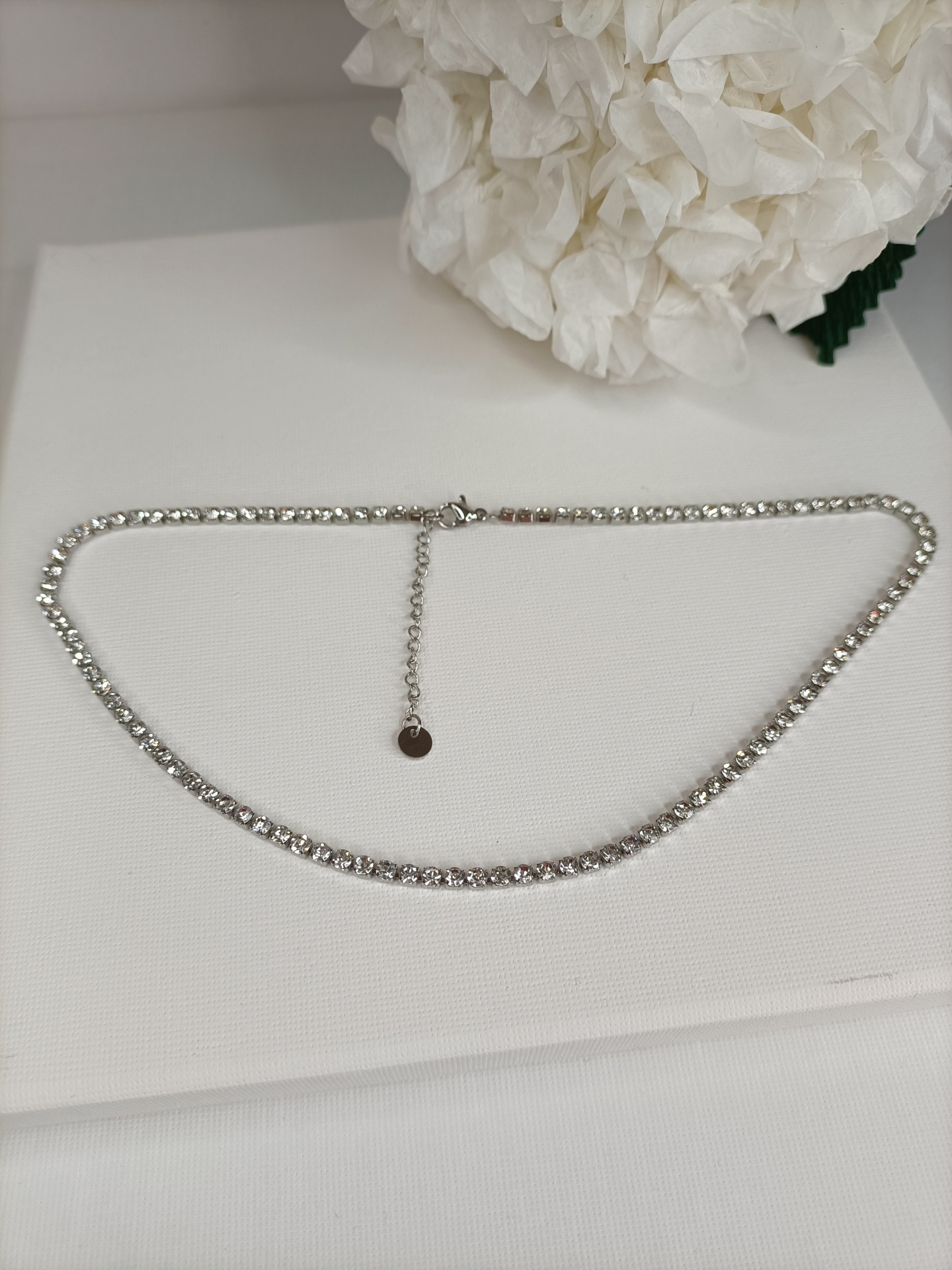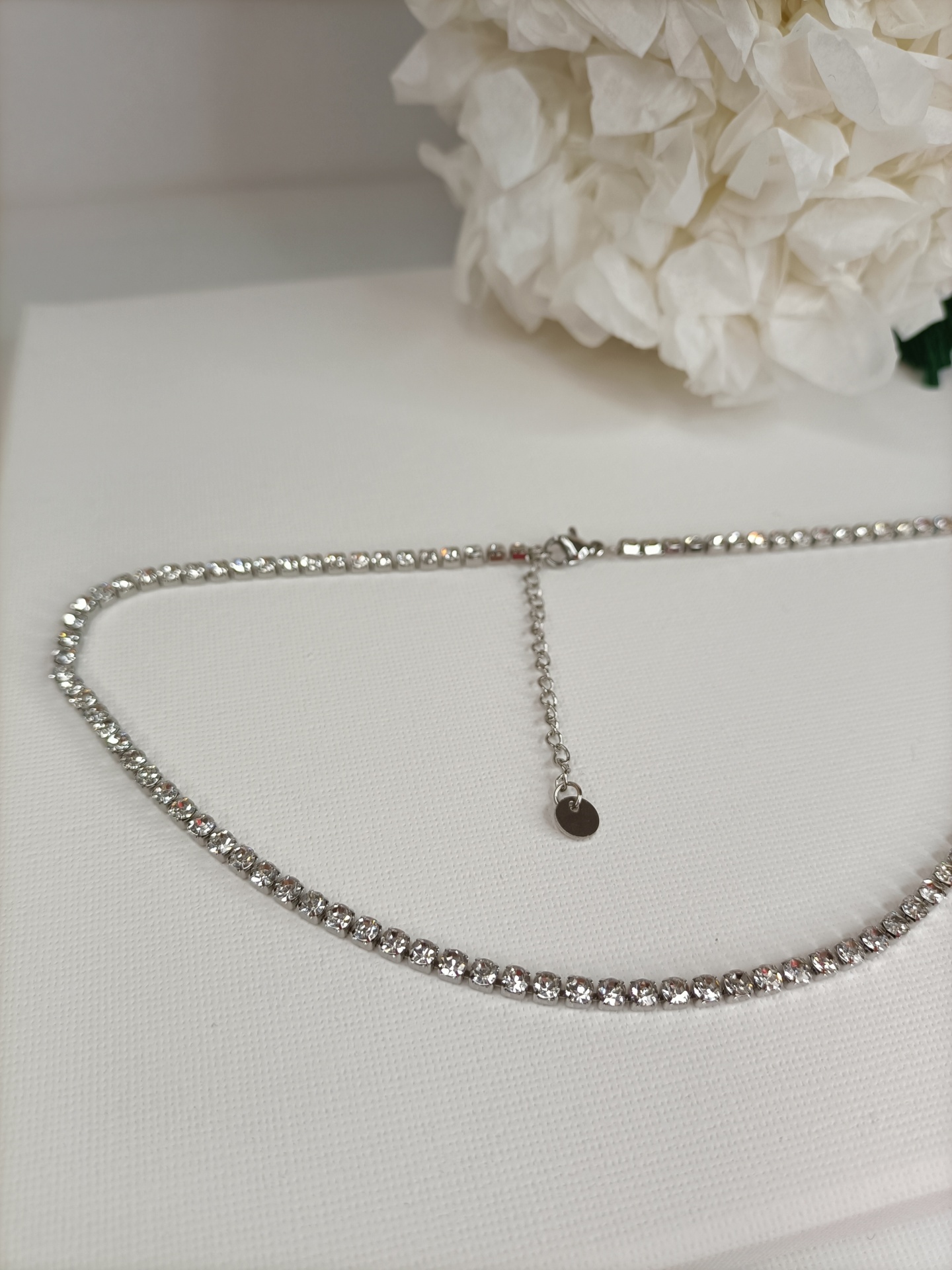 • Colar tipo tornozeleira prateado com pedras brilhantes sobre superfície branca