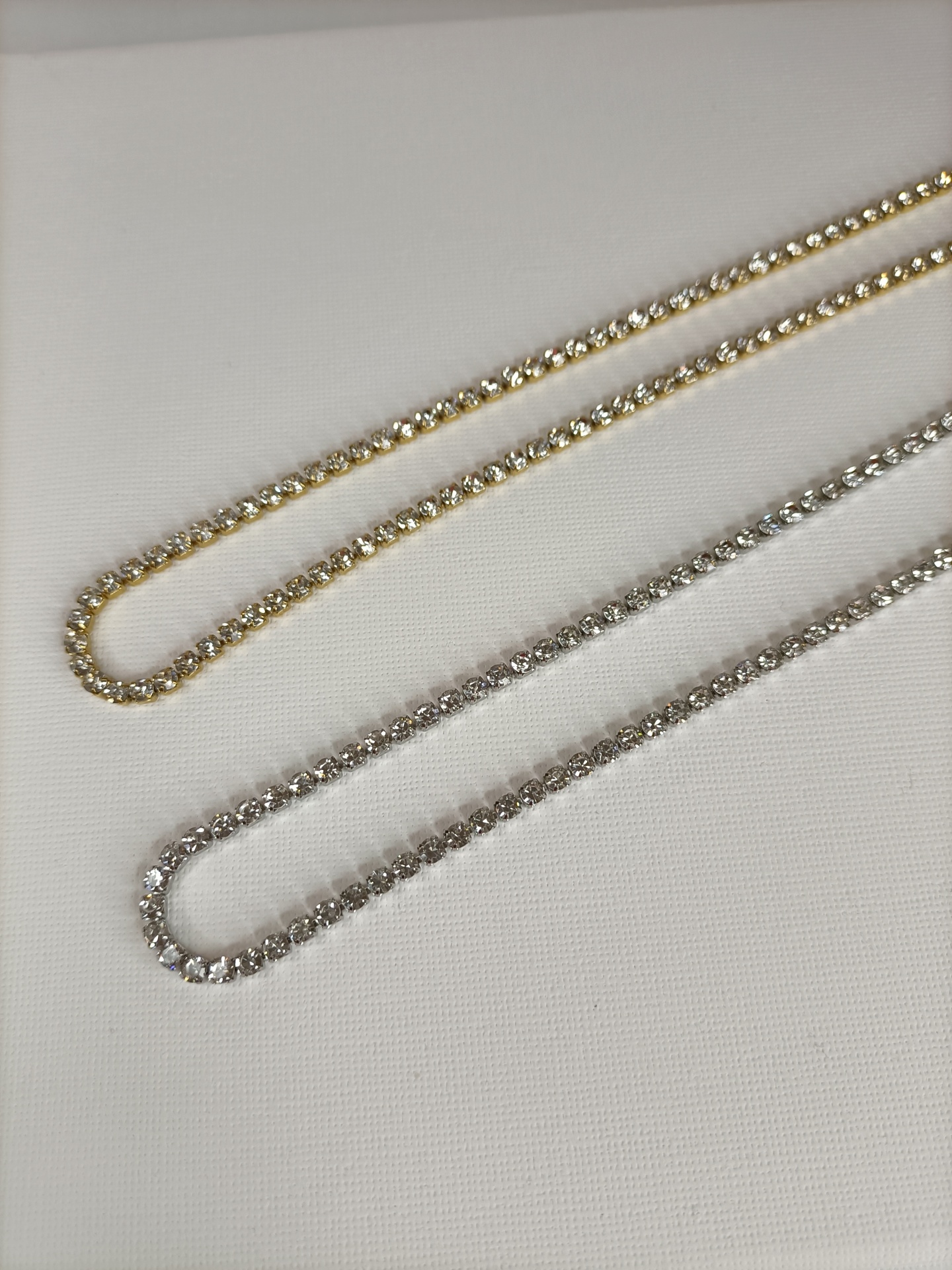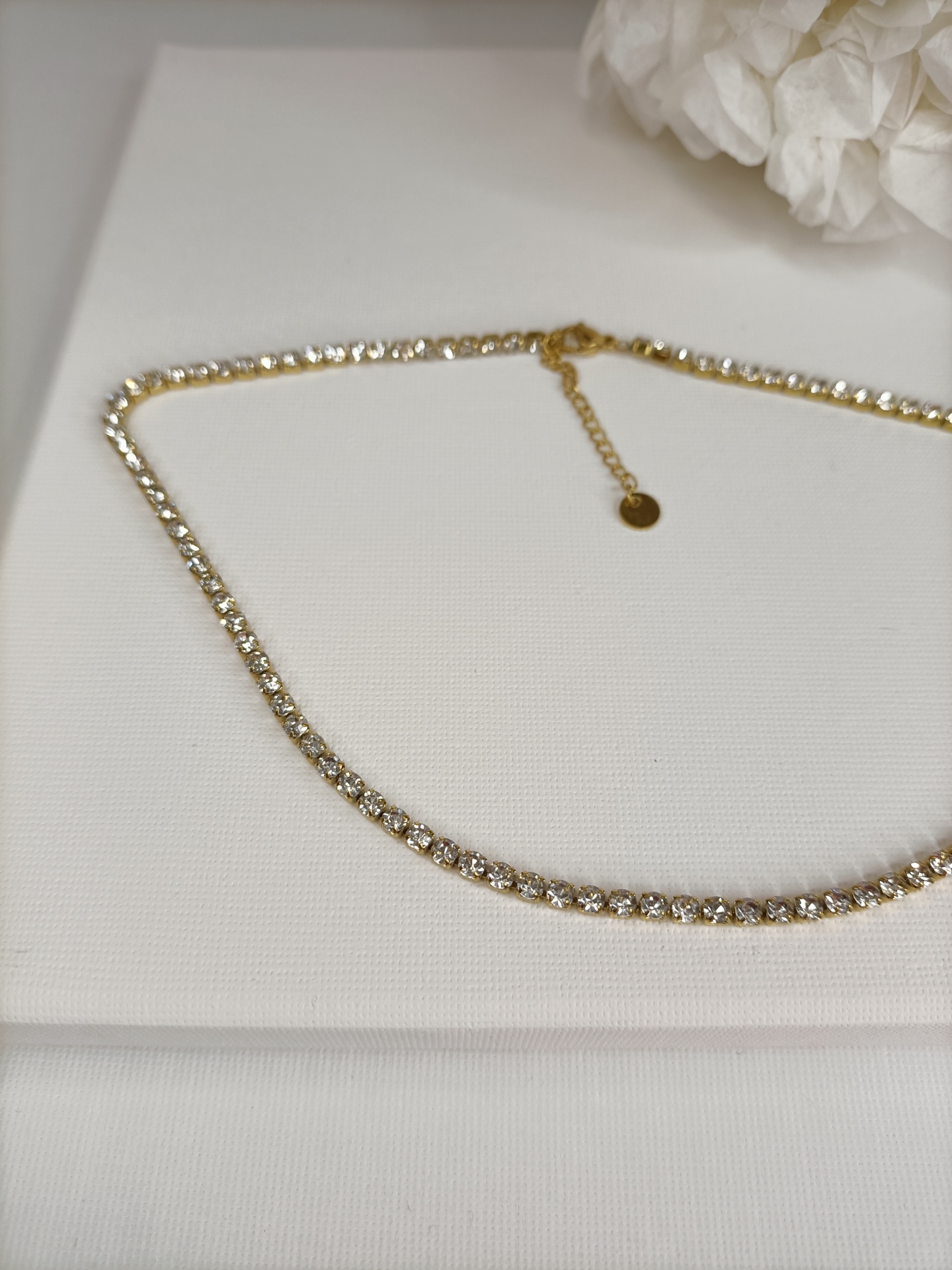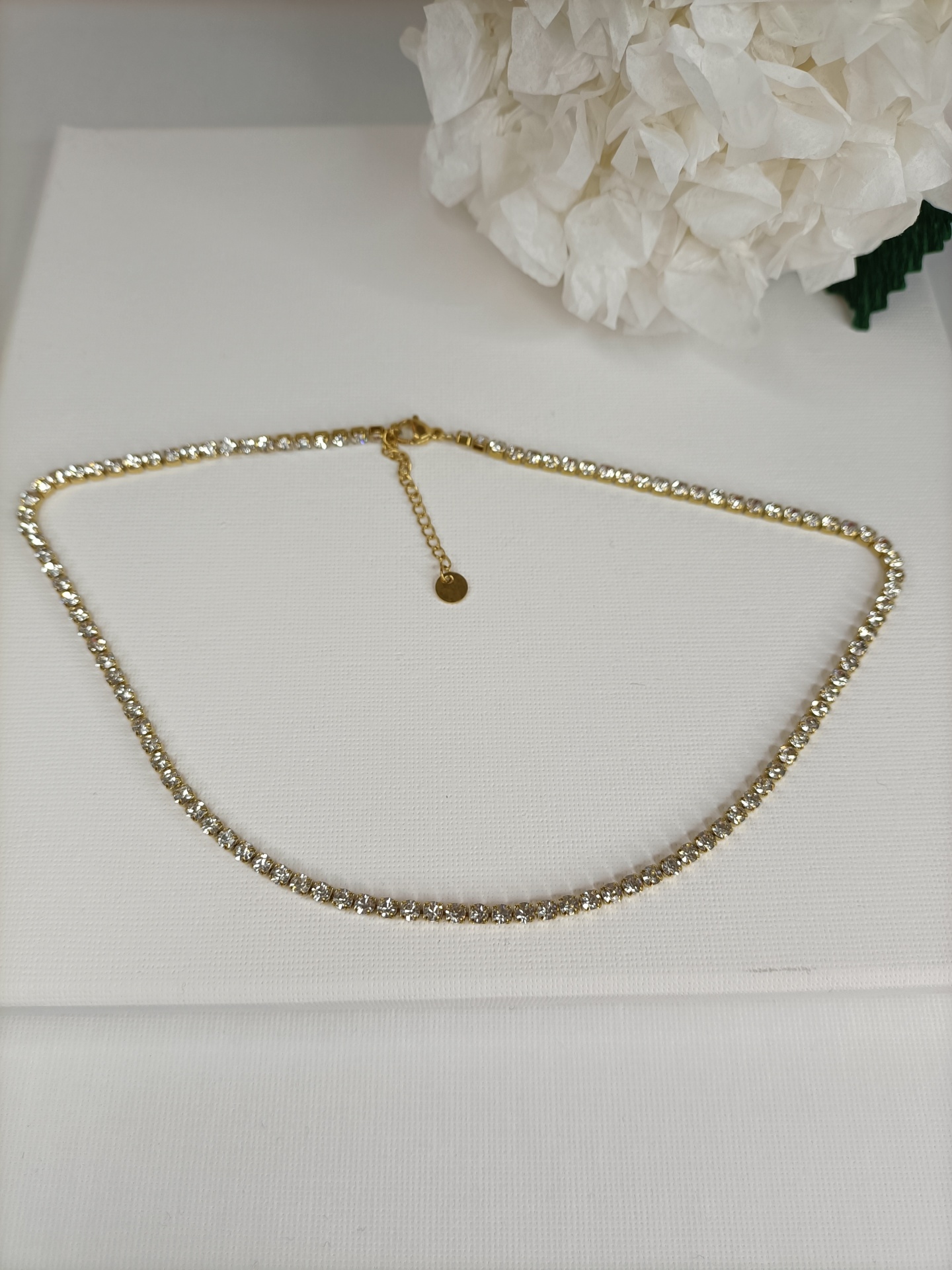 • Colar tennis dourado com pedras brilhantes sobre fundo branco