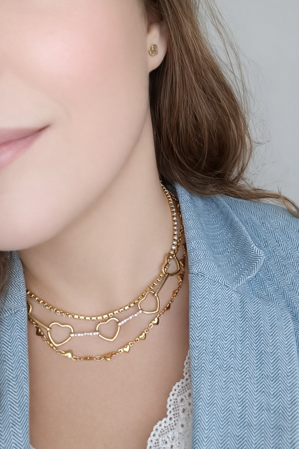 • Colares dourados com corações usados numa mulher com blusa azul e detalhe em renda branca
