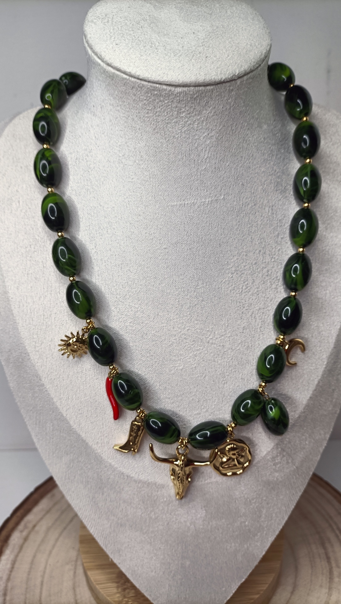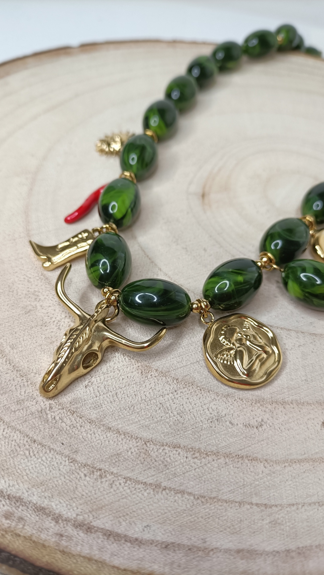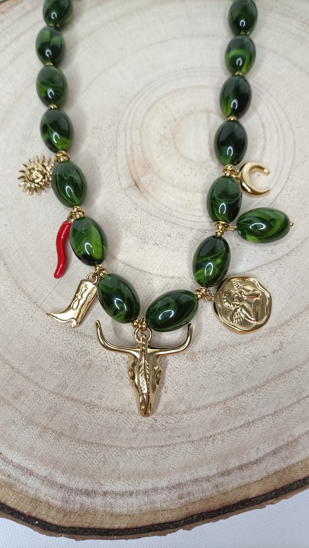 Colar em contas verdes marmorizadas com detalhes dourados e pingentes simbólicos, tendo como destaque central a caveira de boi. Uma peça forte, boho e cheia de personalidade.
