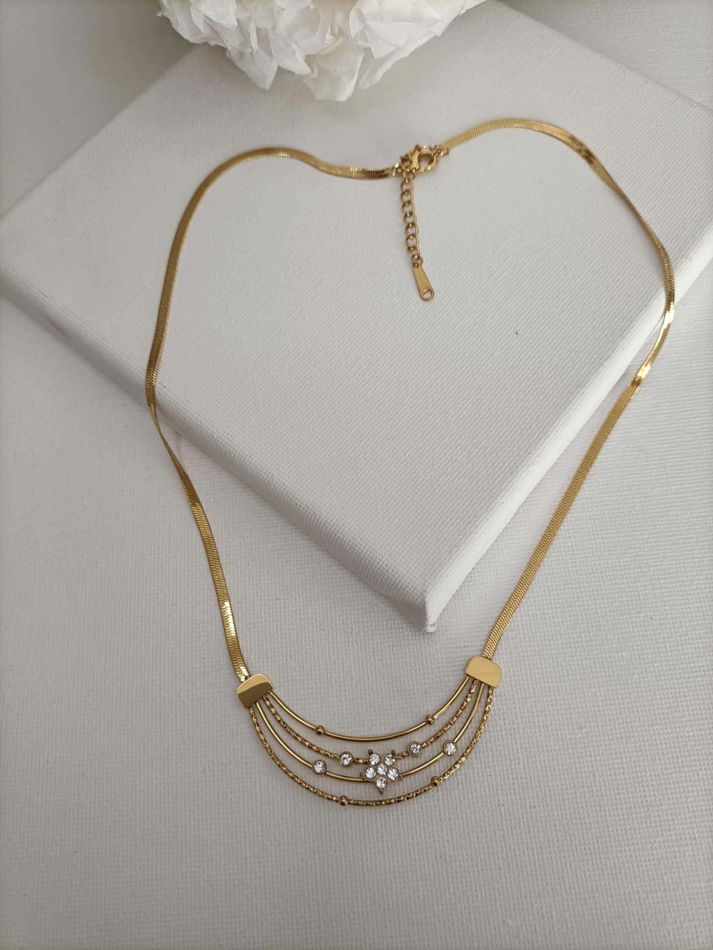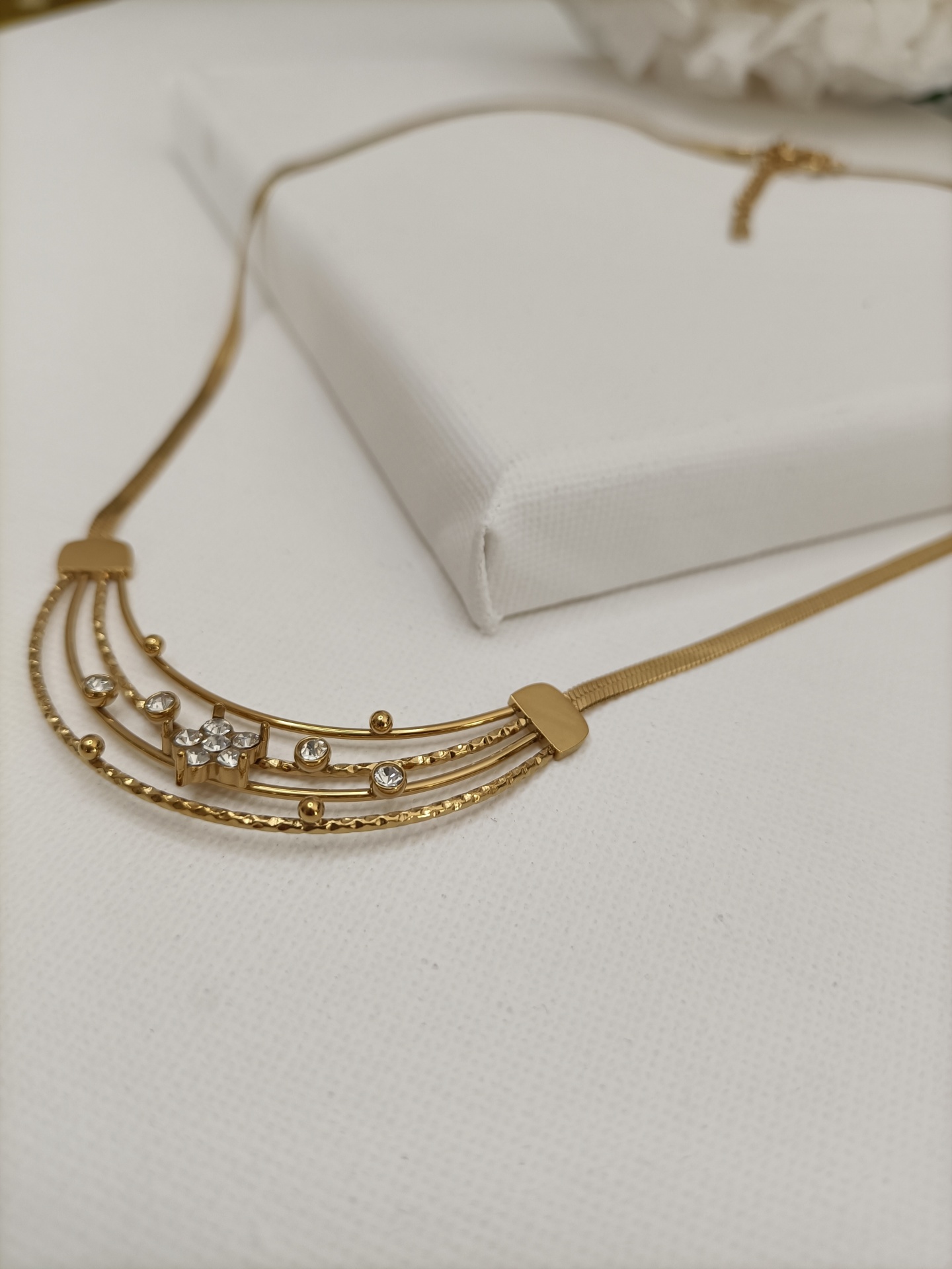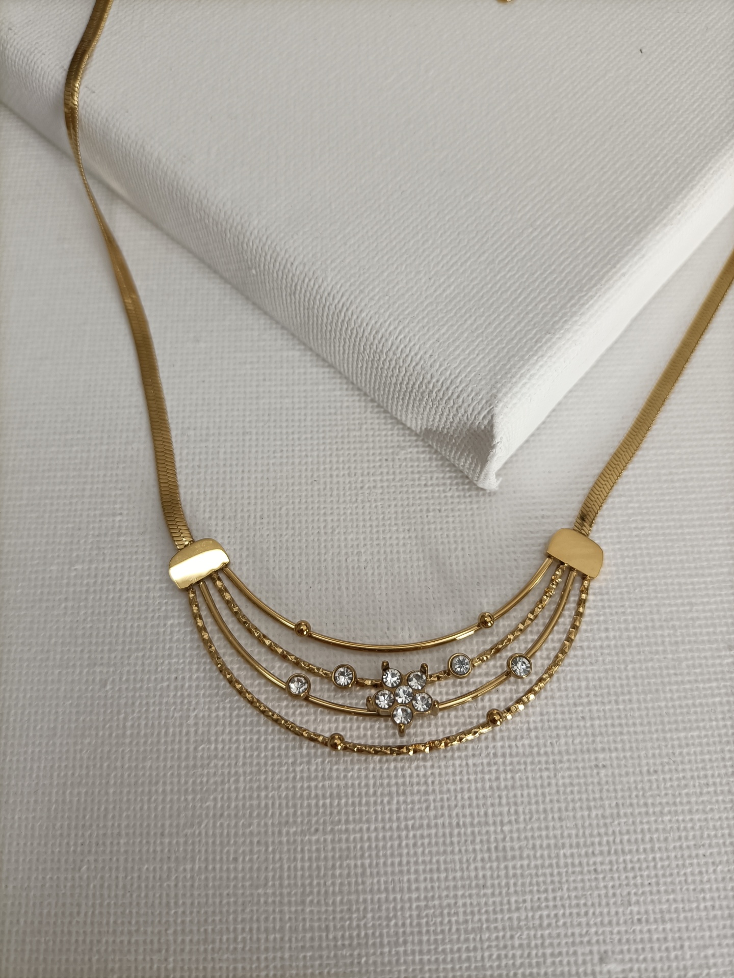 Colar Carmo 15,90 € Desconto de %. Partilhar Comprar Contactar SKU: MB47 Colar com corrente serpente com pendente de quatro fiadas rígidas adornadas com brilhos e perlas lisas. 🔸 Material: Aço inoxidável 🔸 Comprimento: ajustável (41cm + 5cm de extensão)