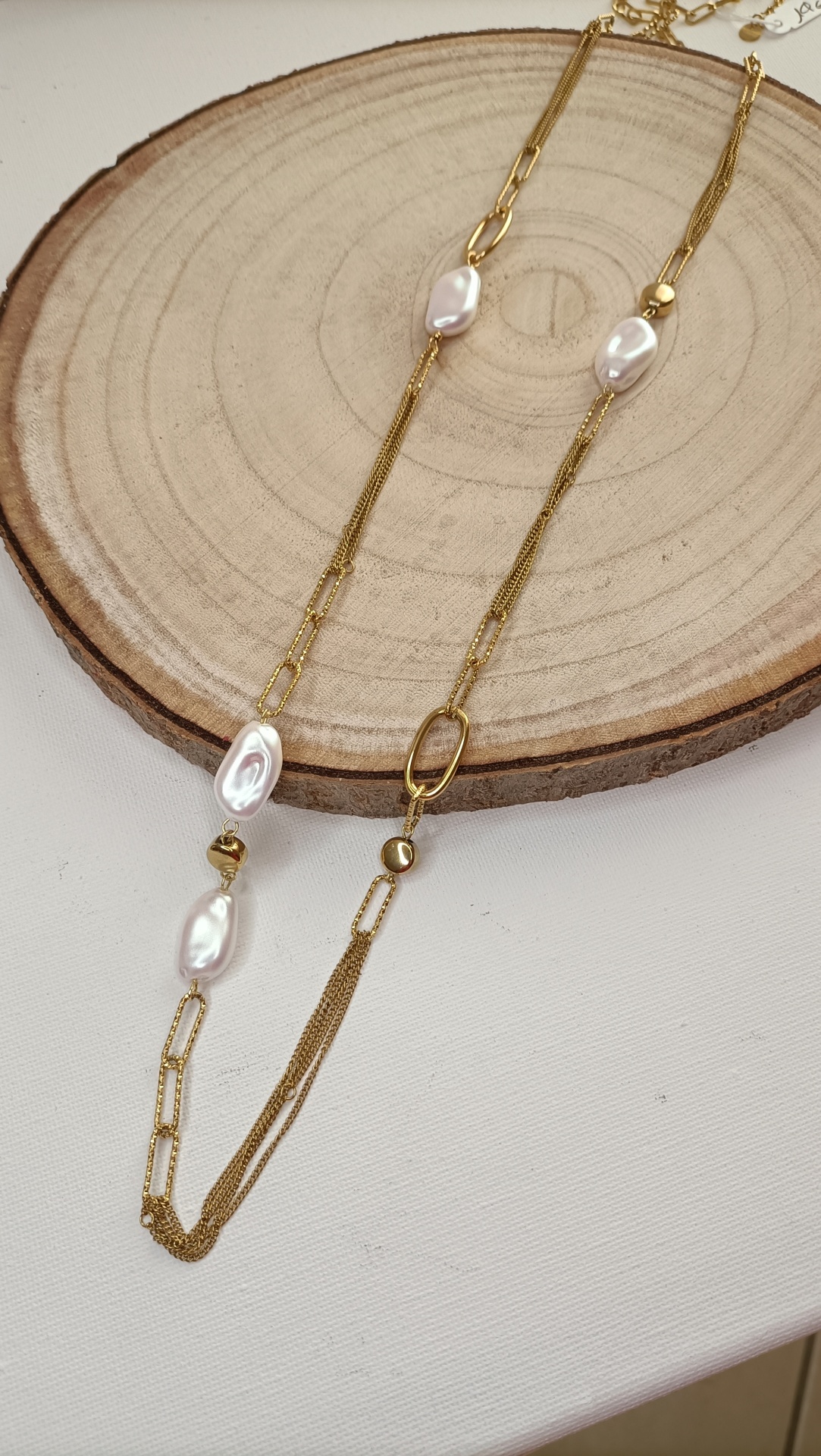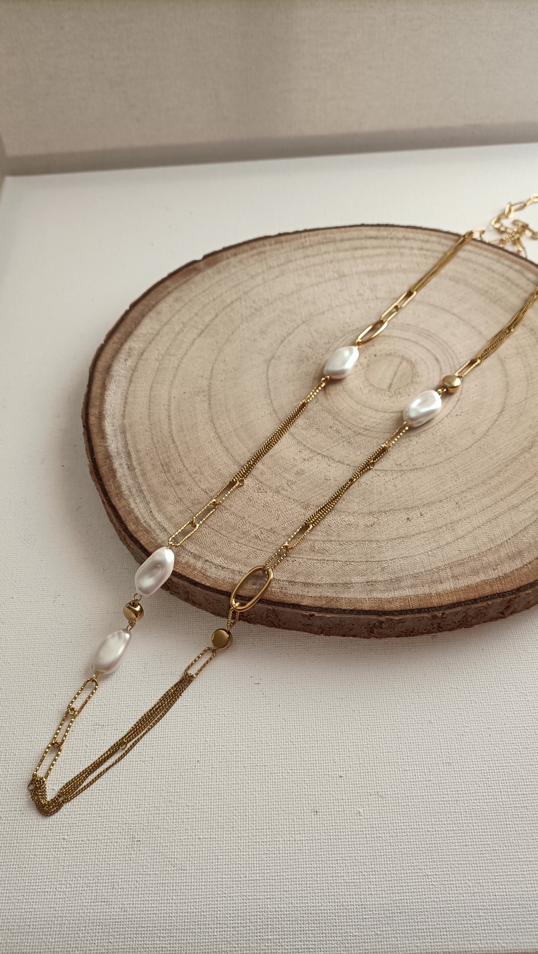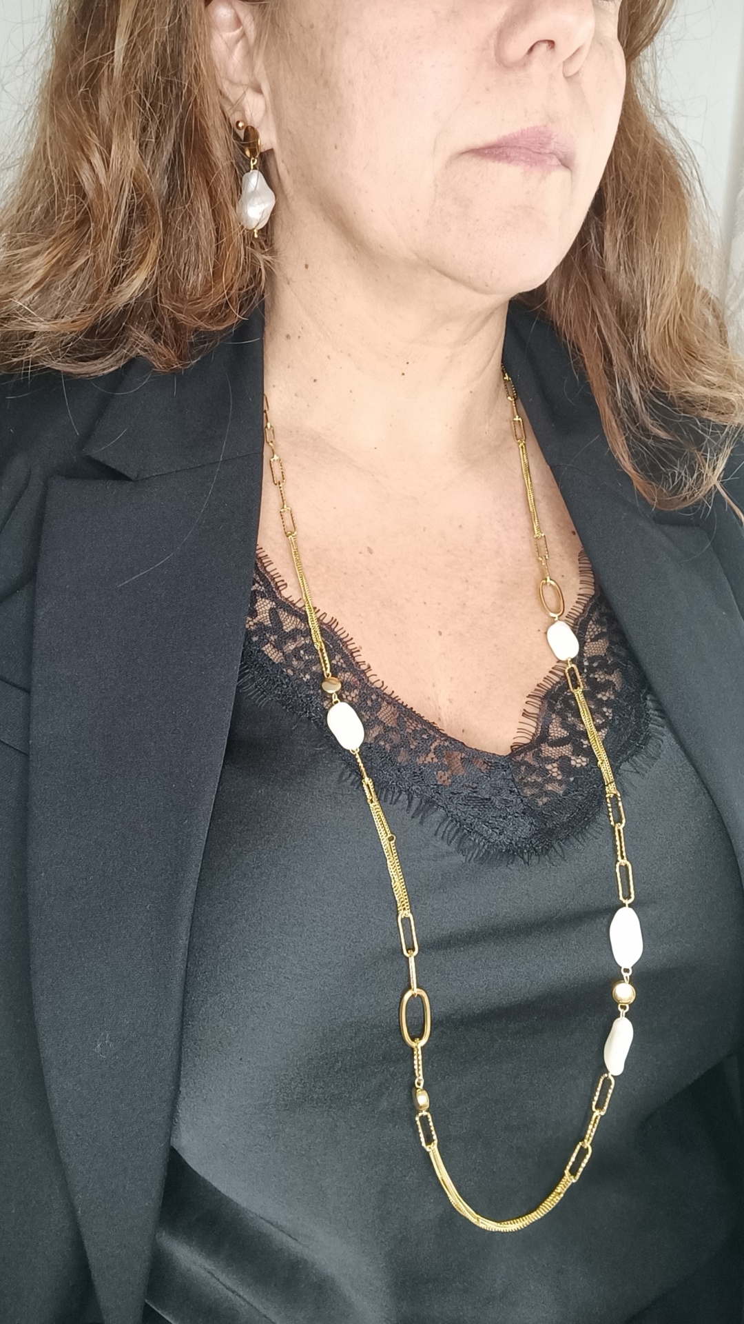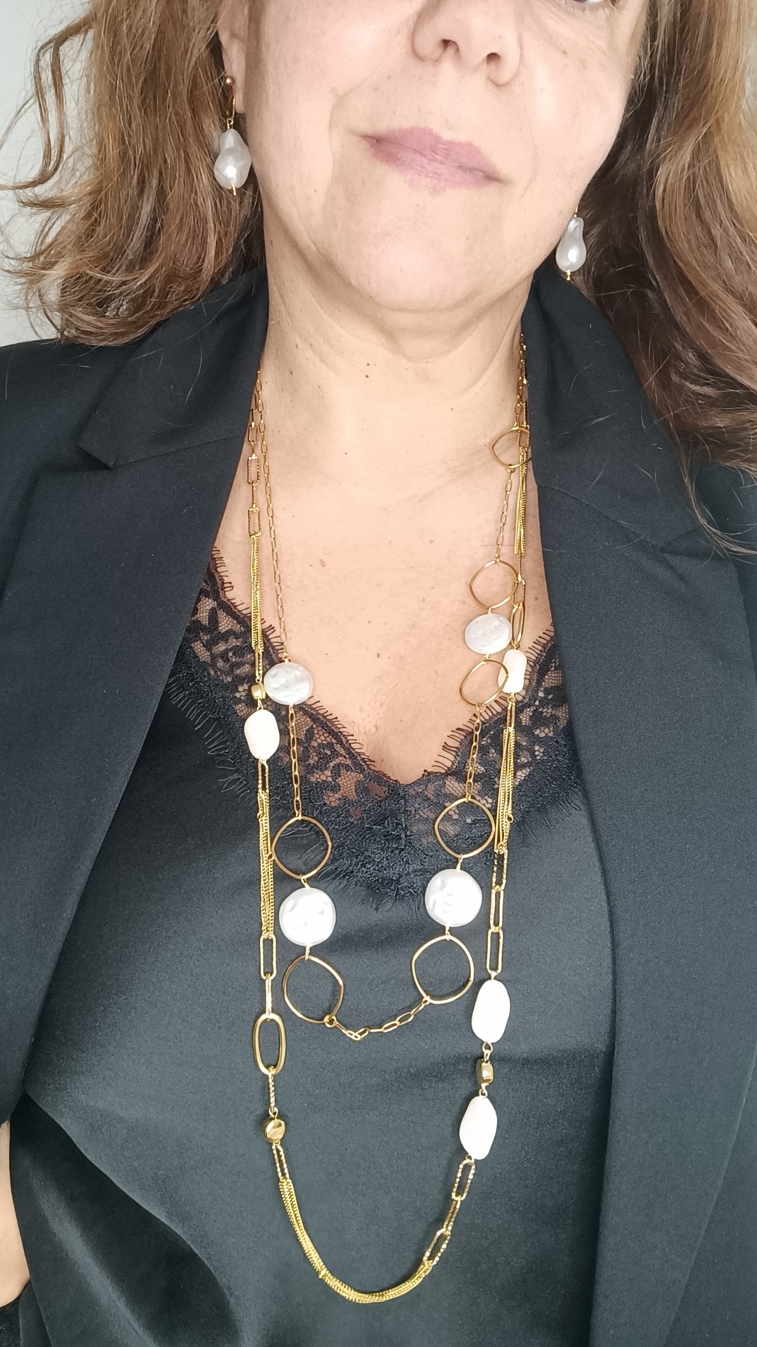 Colar comprido 19,00 € Desconto de %. Partilhar Comprar Contactar SKU: MB159 Um colar que ficará perfeito nos conjuntos mais clássicos! Com pedras de água doce e elos. Pode usá-lo de diferentes formas. 🔸 Material: Aço inoxidável e pedra de água doce. 🔸 Comprimento: ajustável (98cm + 5cm de extensão)
