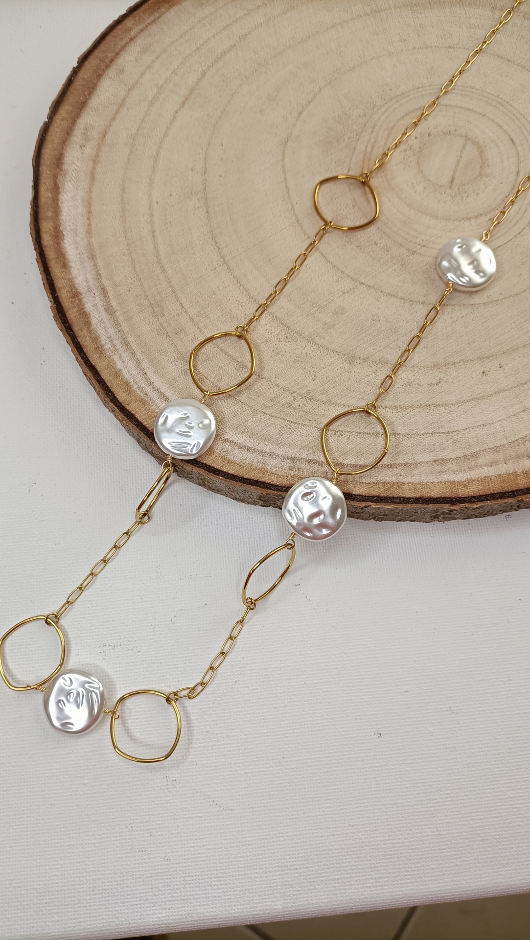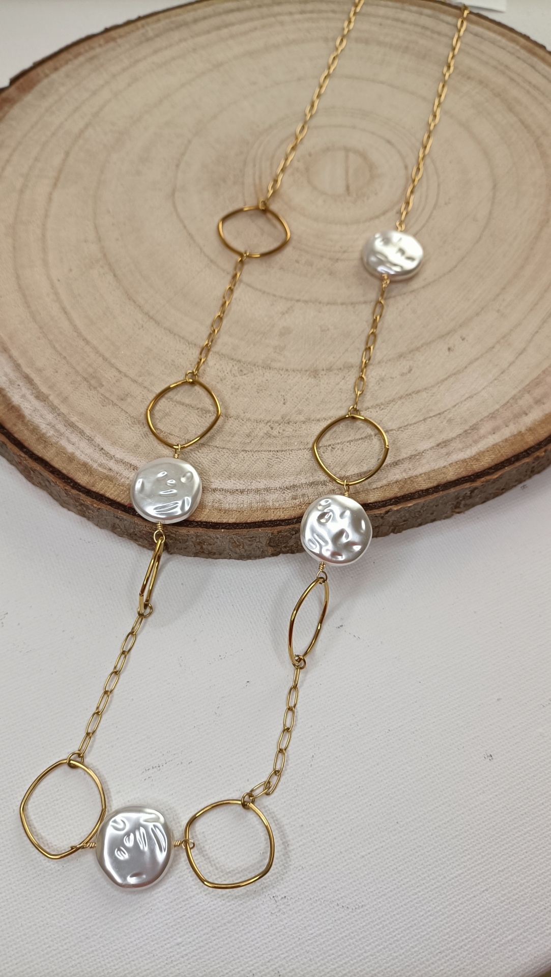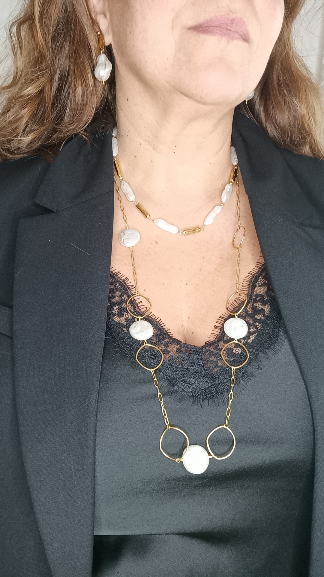 Colar Manuela 15,00 € Desconto de %. Partilhar Comprar Contactar SKU: MB160 Um colar versátil e moderno que se adapta ao seu estilo. Este modelo com pedra barroca e aros com corrente de elos. Pode usá-lo de diferentes formas. 🔸 Material: Aço inoxidável e pedra barroca 🔸 Comprimento: ajustável (79cm + 5cm de extensão)