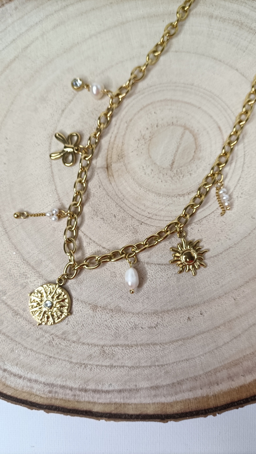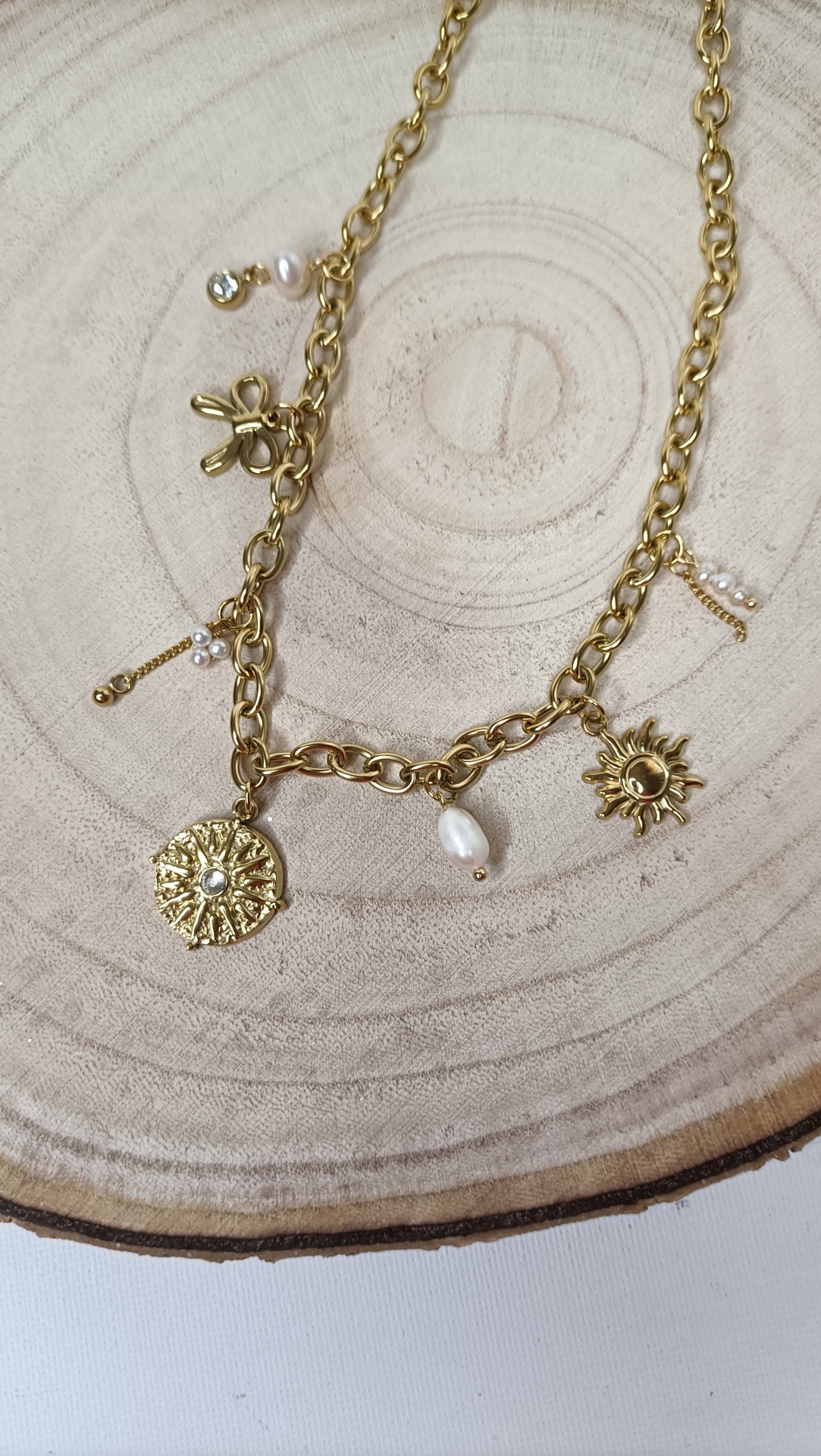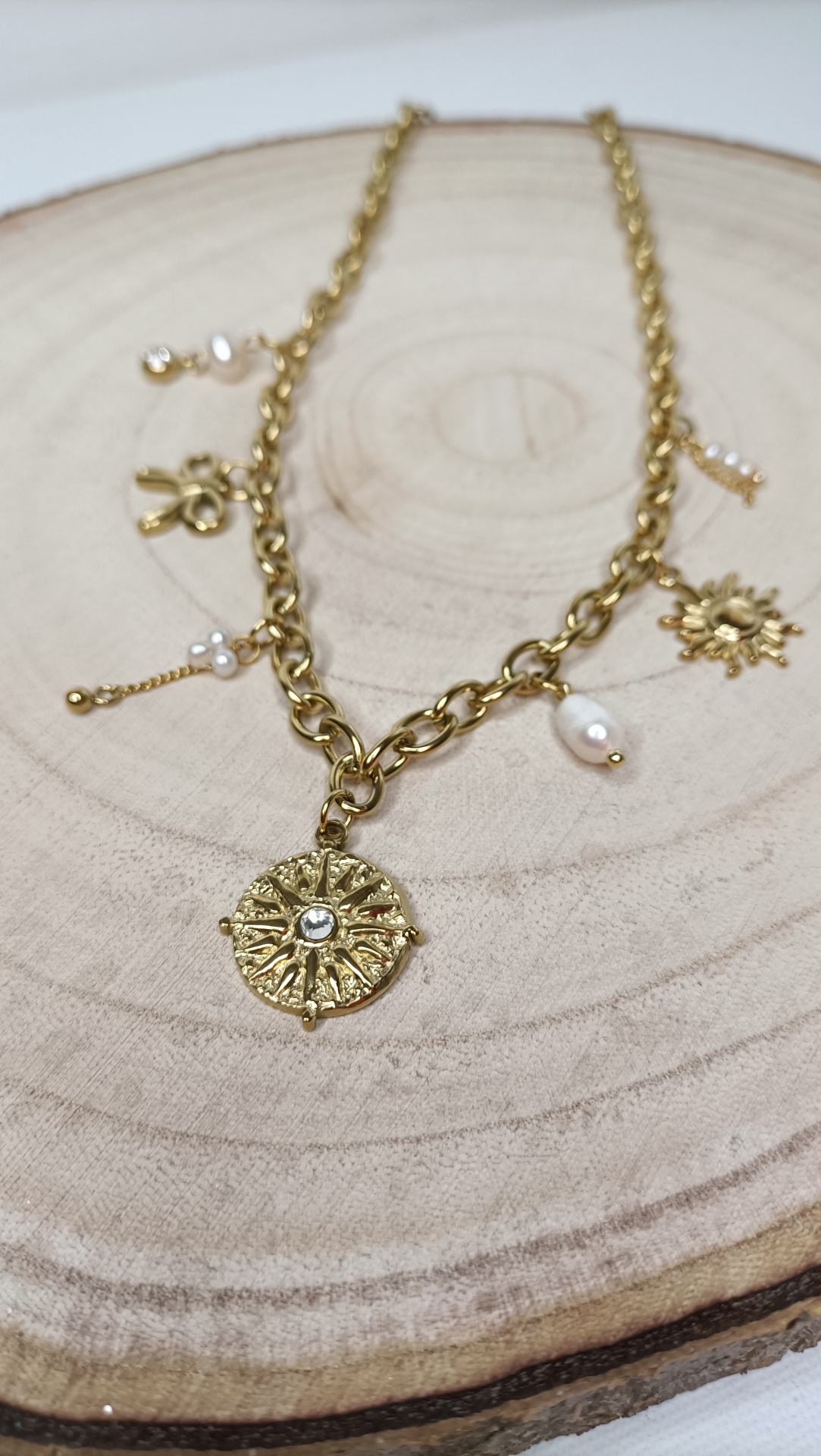 Colar Silvia 16,00 € Desconto de %. Partilhar Comprar Contactar SKU: MB157 Colar com medalhão de sol e detalhes em pérolas. Uma peça delicada e elegante, ideal para dar um toque de luz e sofisticação a qualquer look. 🔸 Material: Aço inoxidável 🔸 Comprimento: ajustável (41cm + 5cm de extensão)