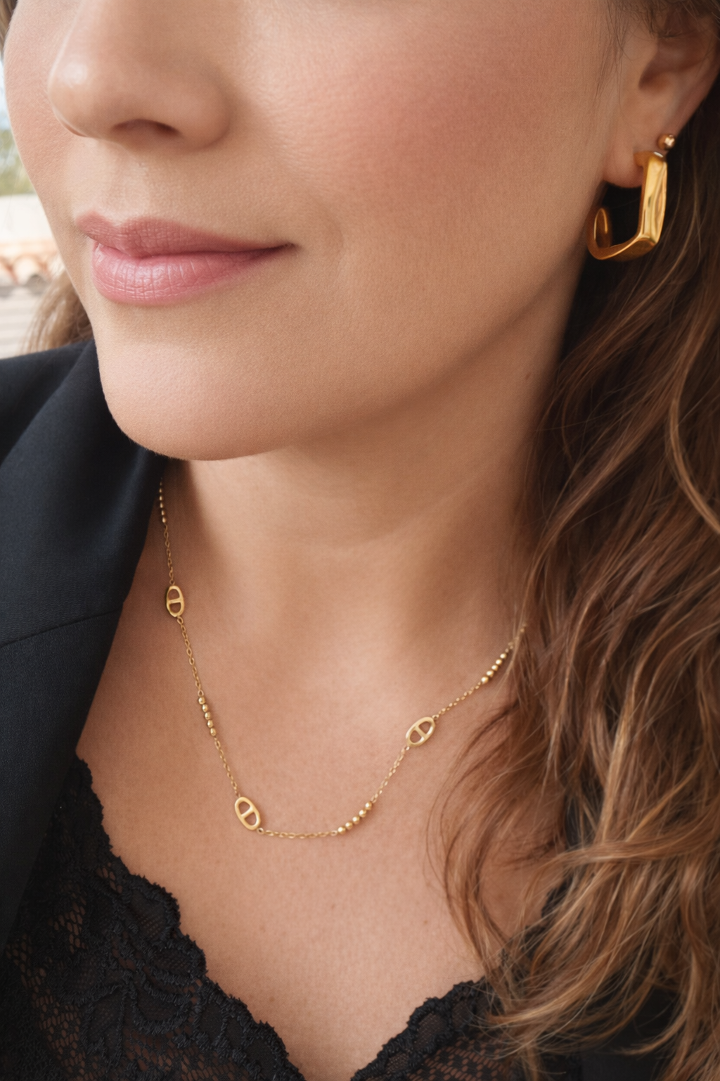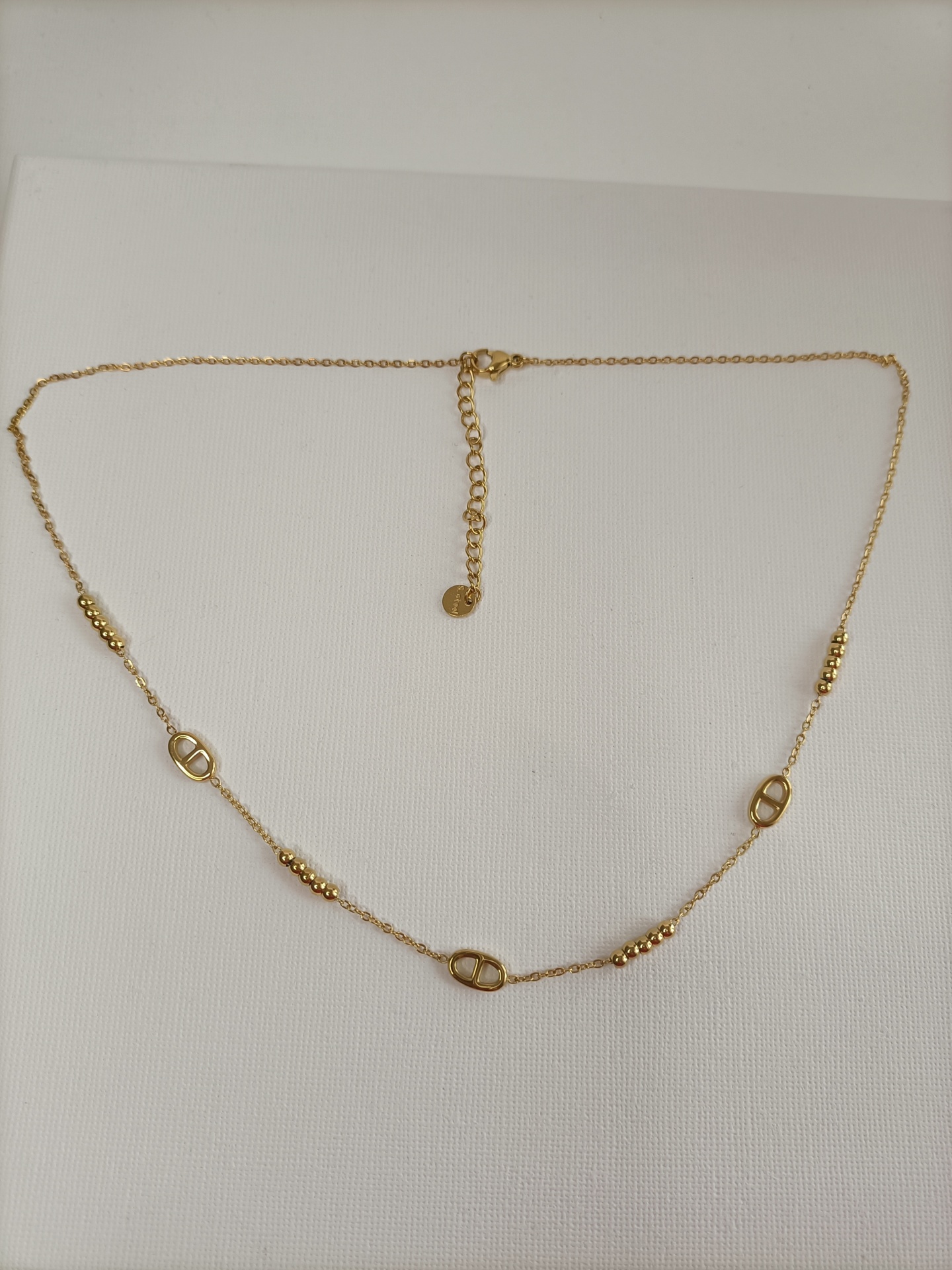 Um colar delicado com pequenas contas e elos náuticos. Ideal para usar sozinho ou acompanhado de outros.  É a escolha perfeita para quem aprecia elegância discreta com um toque contemporâneo