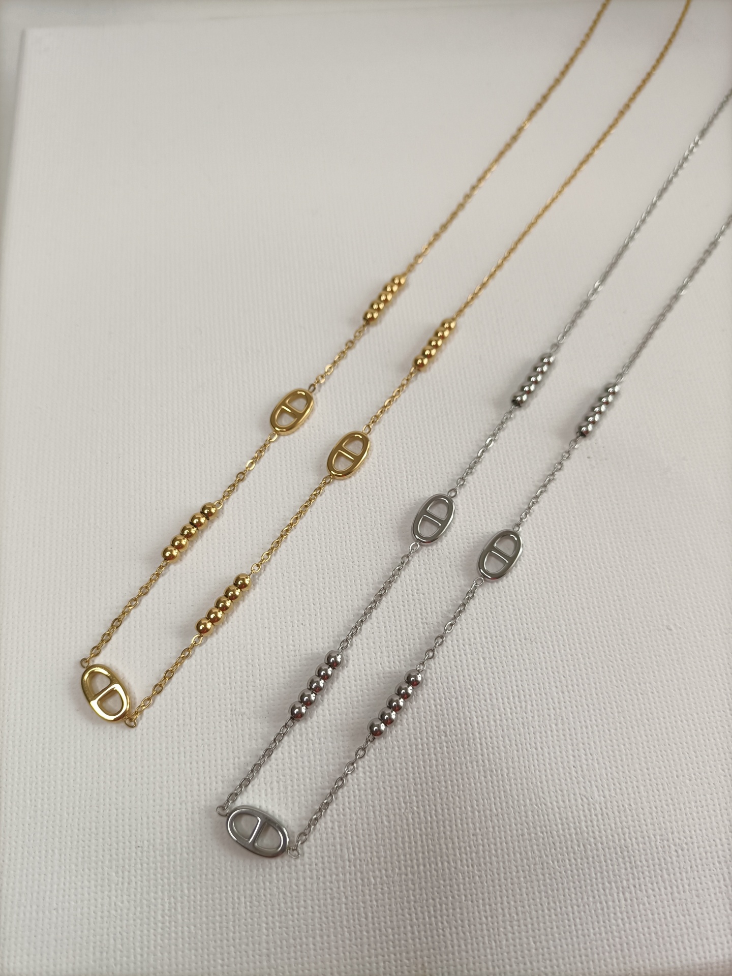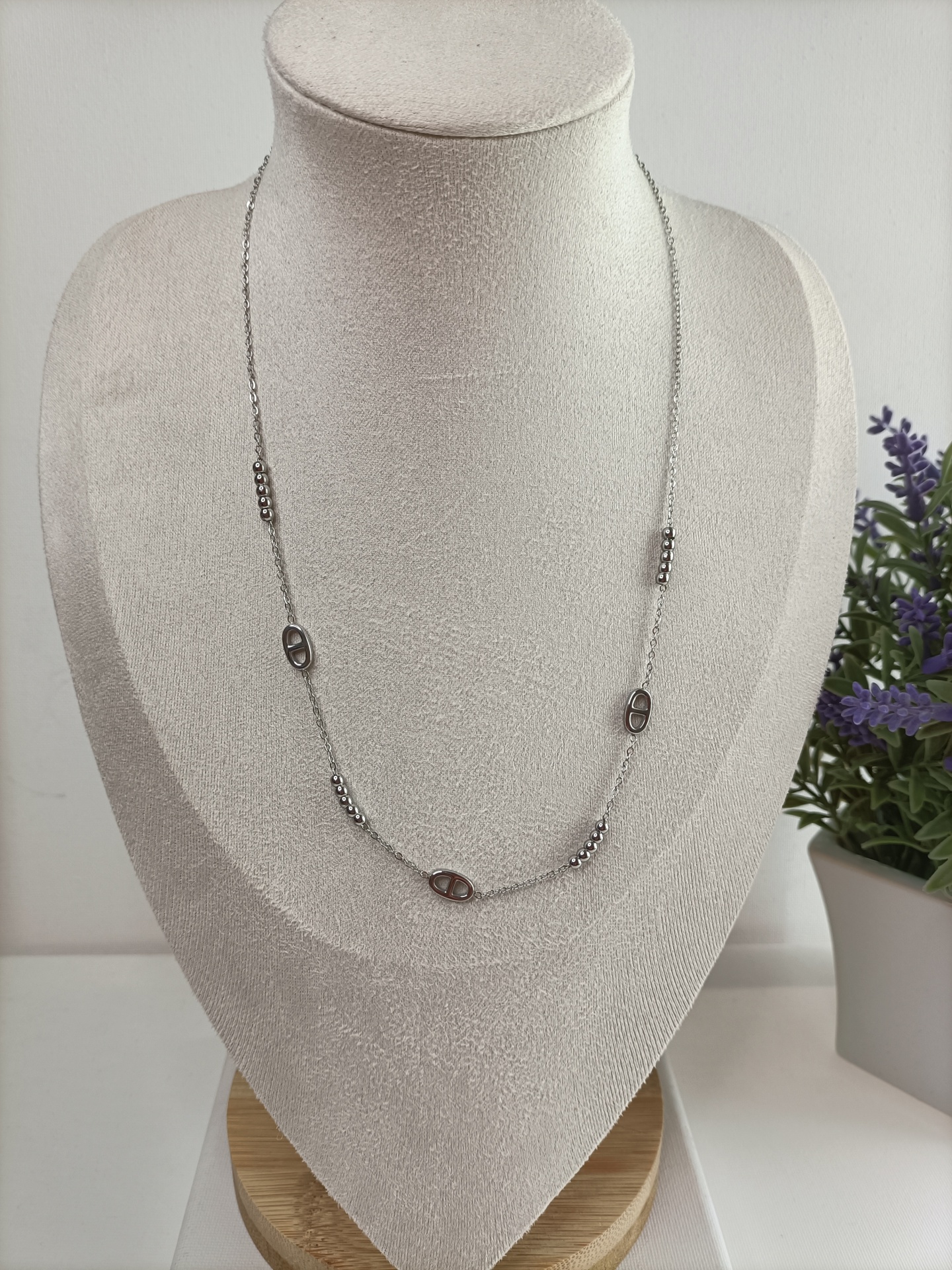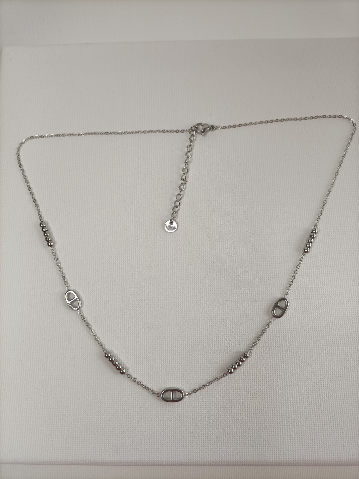 • Colar prateado com elos ovais e contas de bola em fundo branco.