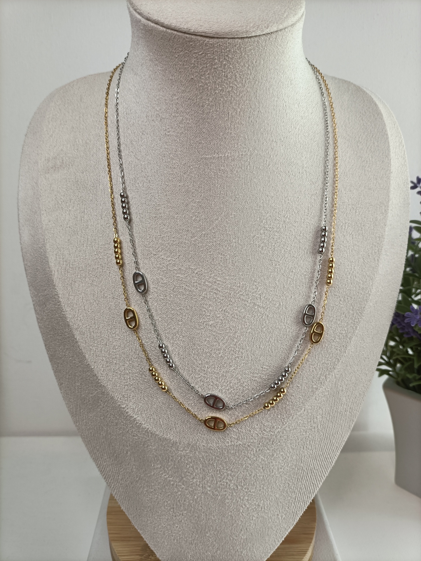 • Colar duplo dourado e prateado com contas e elos ovais em busto bege