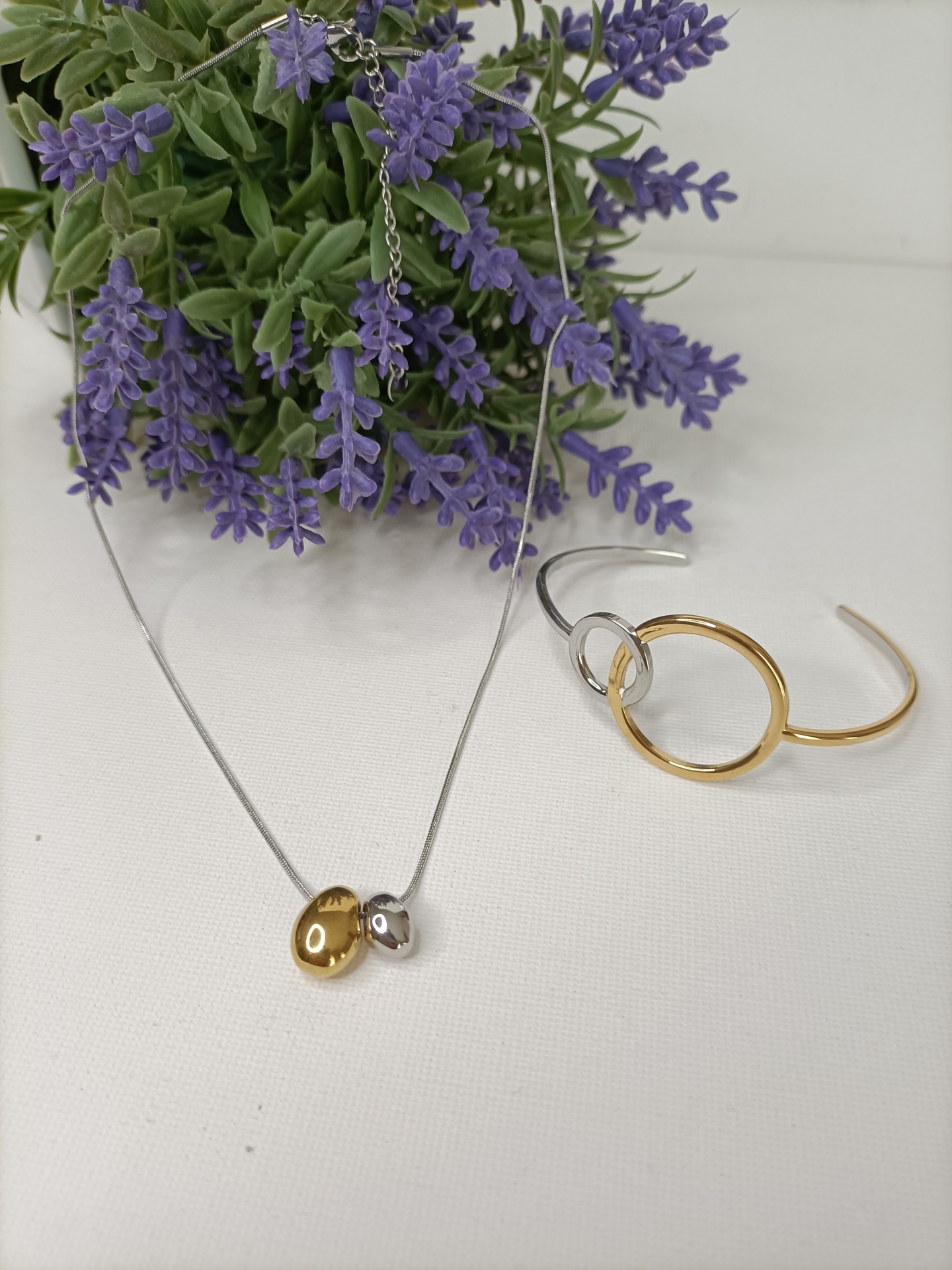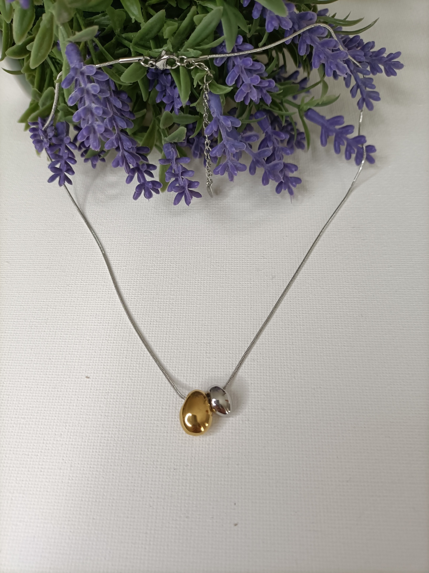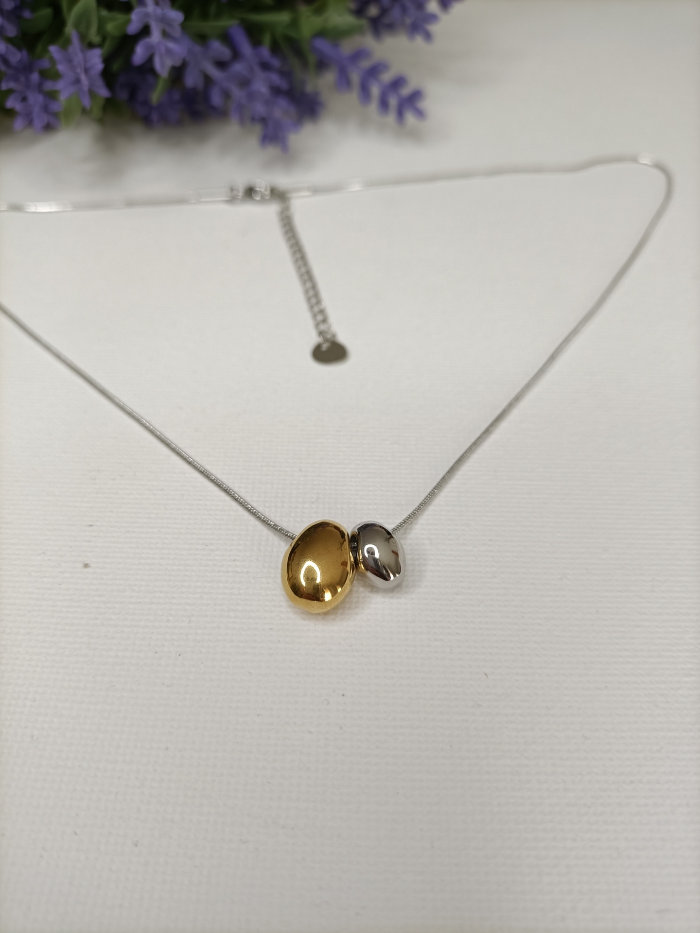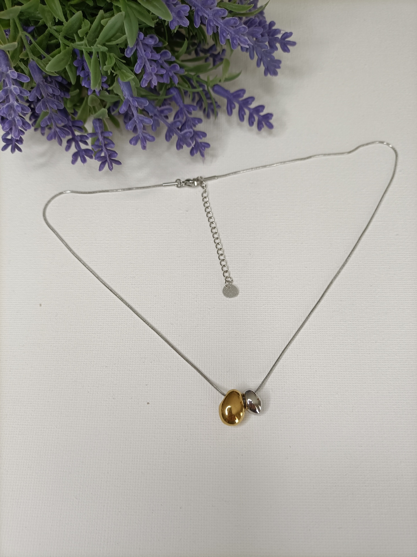 Colar Duo 10,90 € Desconto de %. Partilhar Comprar Contactar SKU: MB48 Colar com corrente fina redonda, pendentes com formas arredondadas e abobadadas, efeito espelho na cor prateado e dourado. 🔸 Material: Aço inoxidável 🔸 Comprimento: ajustável (42cm + 5cm de extensão)