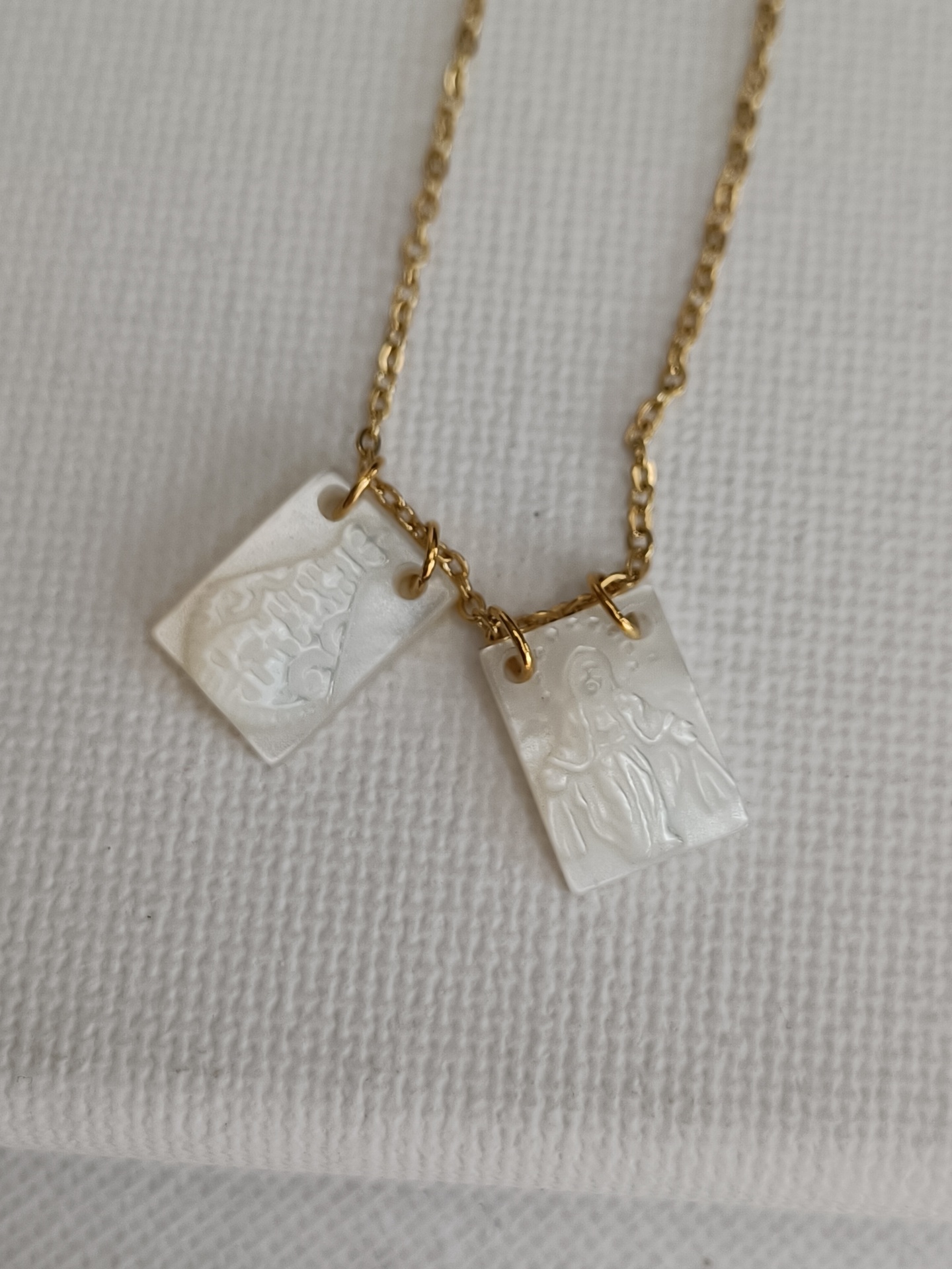 Corrente fininha com 2 medalhas em madre pérola da Nª Srª da Aparecida e o Sagrado Coração de Jesus. Pose ser usado como escapulário ou como colar. Tem fecho.