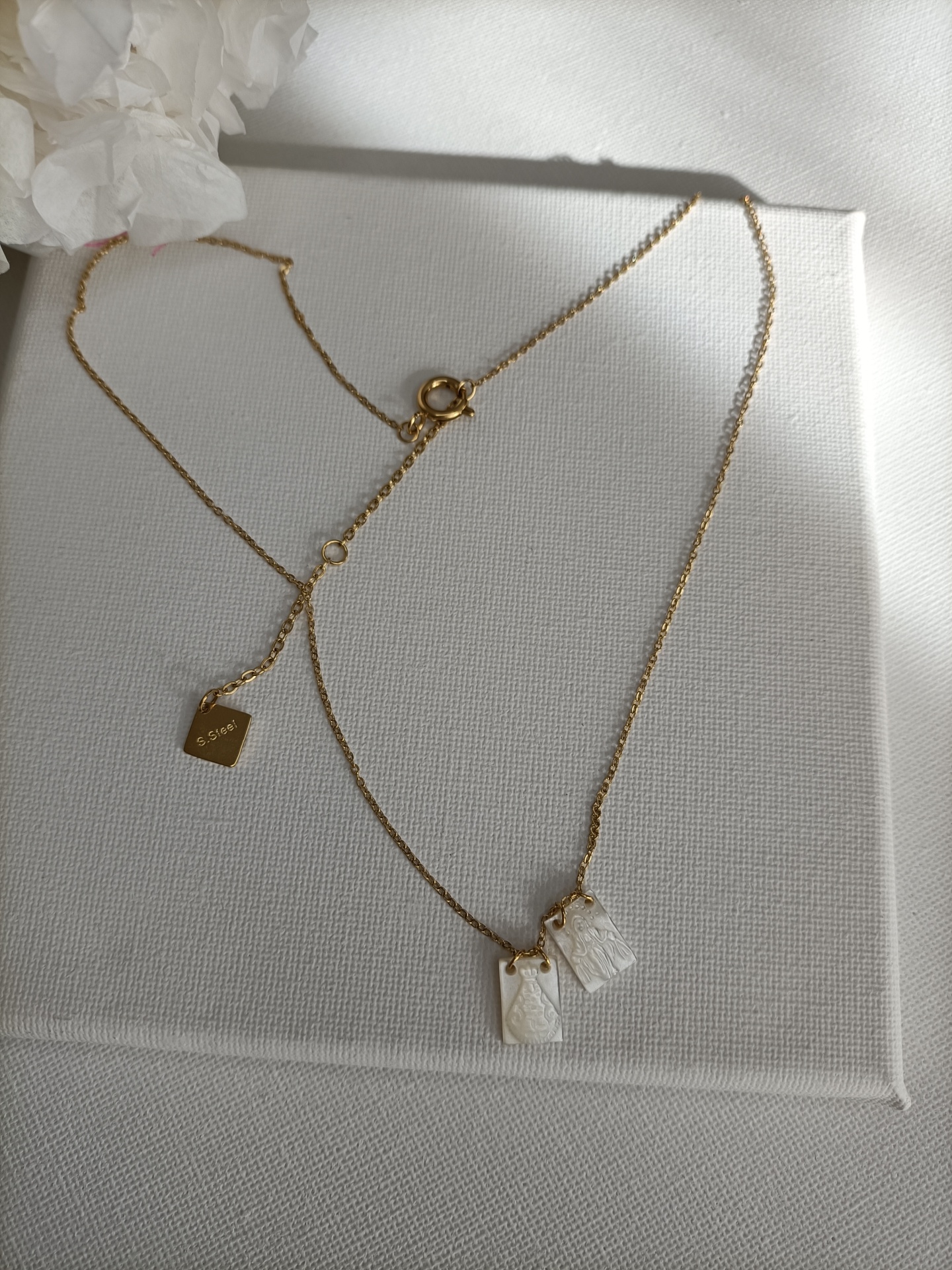 • Colar com dois pendentes retangulares em madrepérola e corrente dourada sobre tecido branco