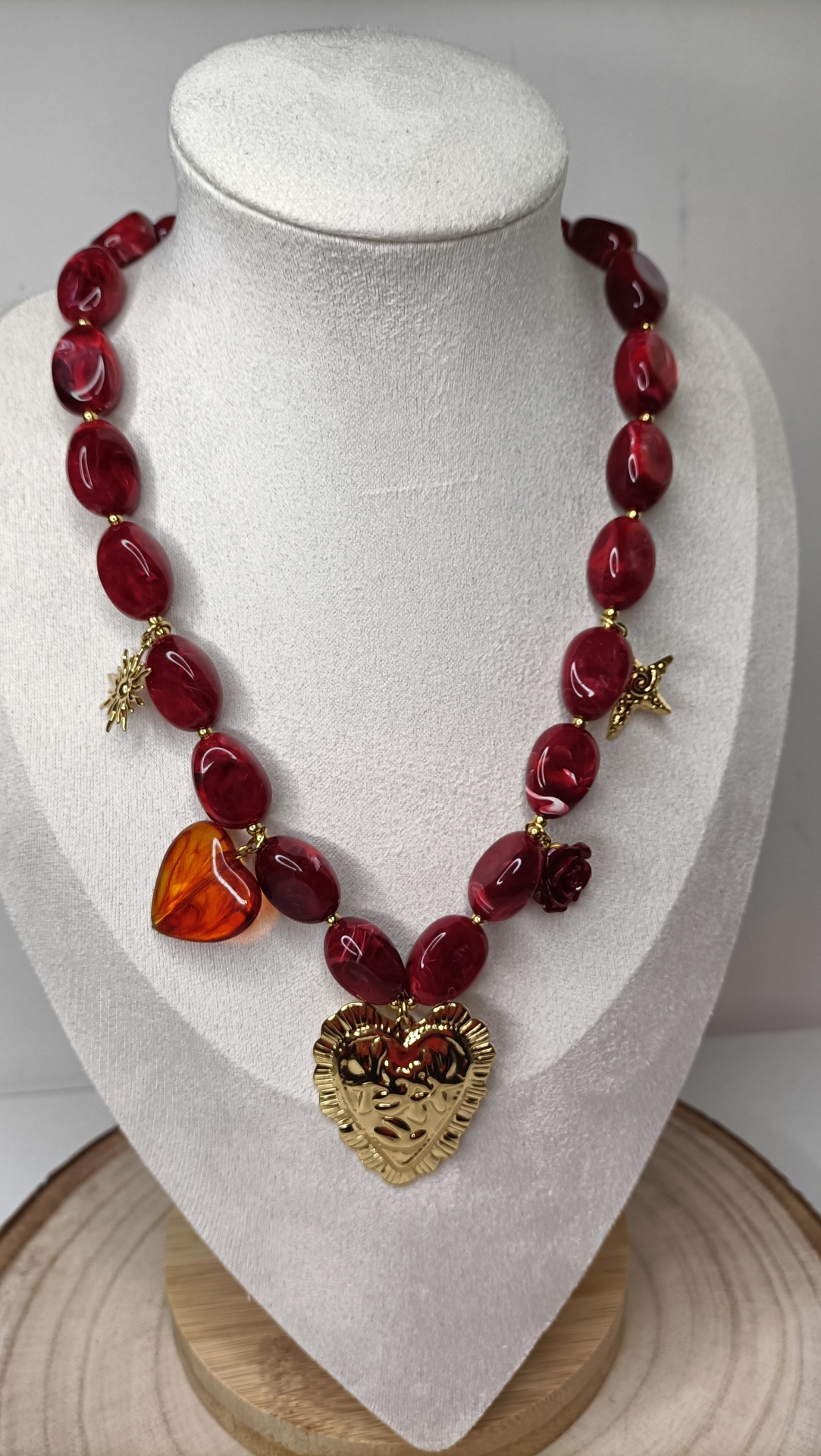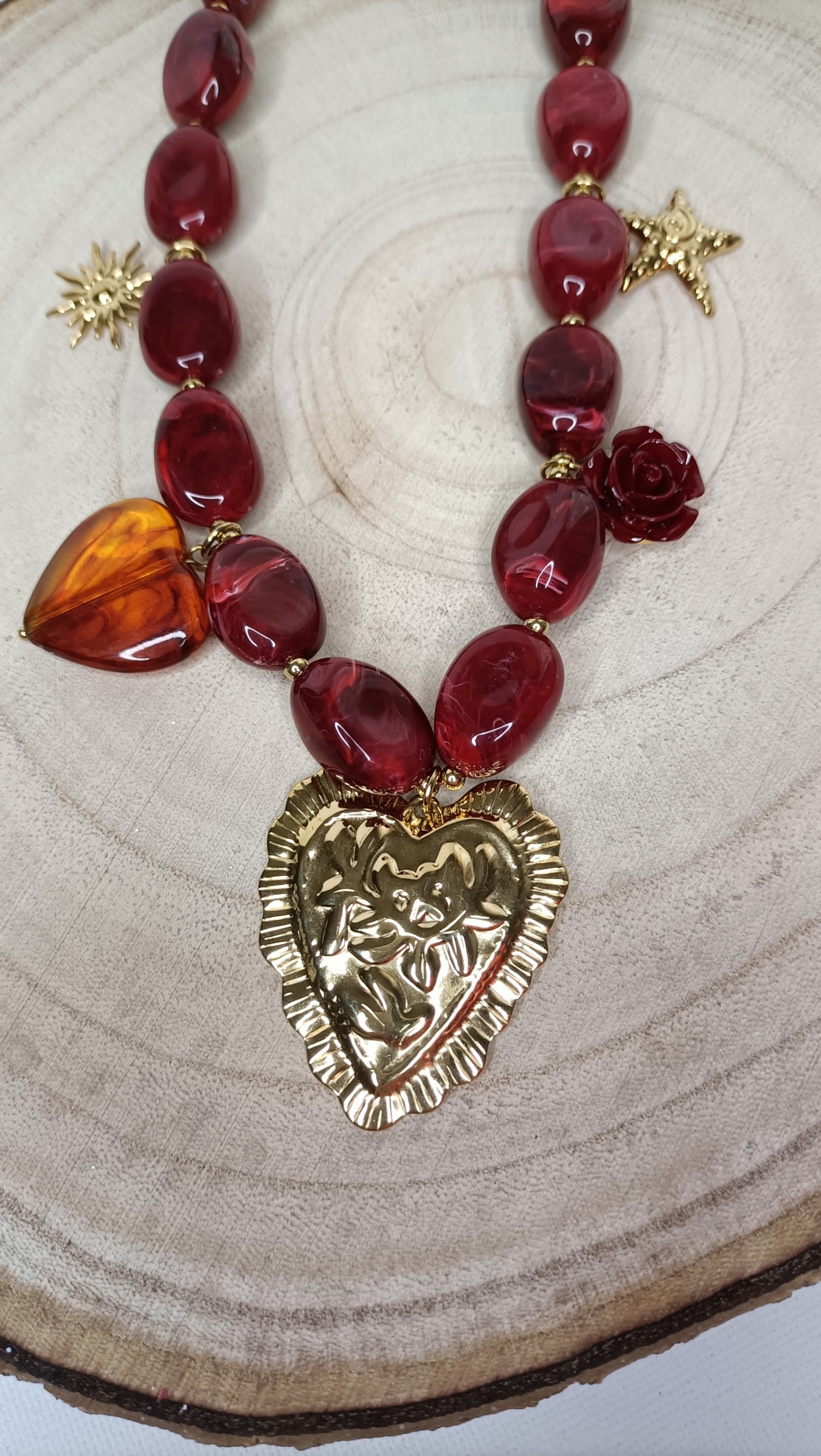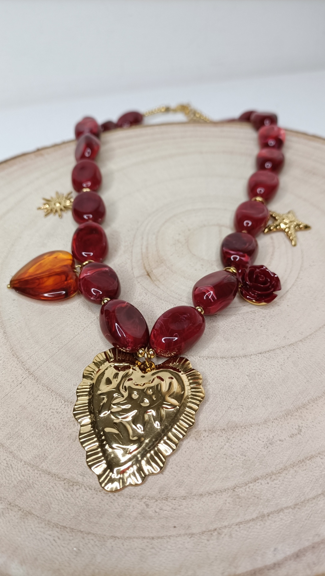 Colar em contas bordeaux marmorizadas com detalhes dourados e pingentes simbólicos, tendo como destaque o coração. Uma peça forte e cheia de personalidade.