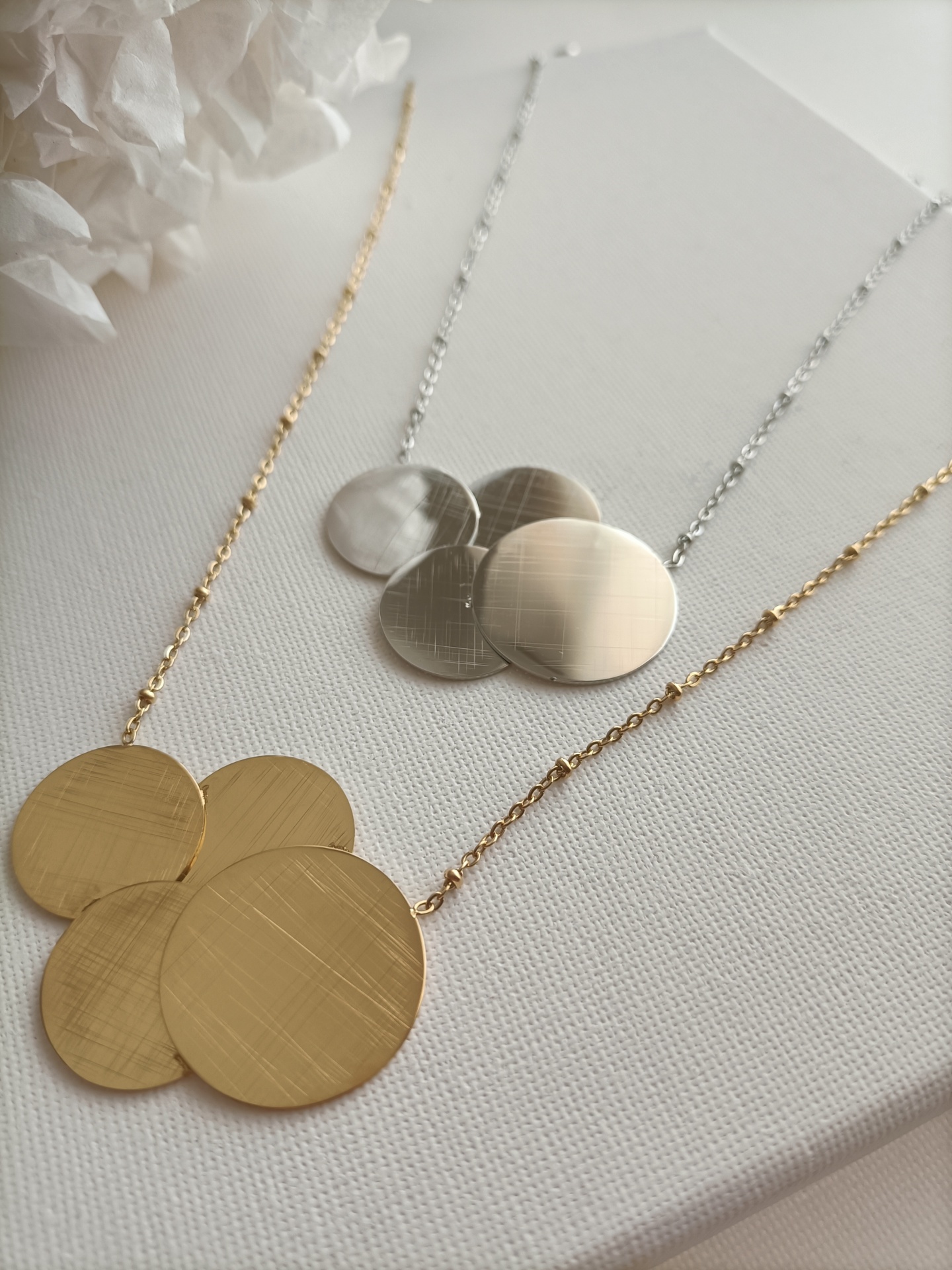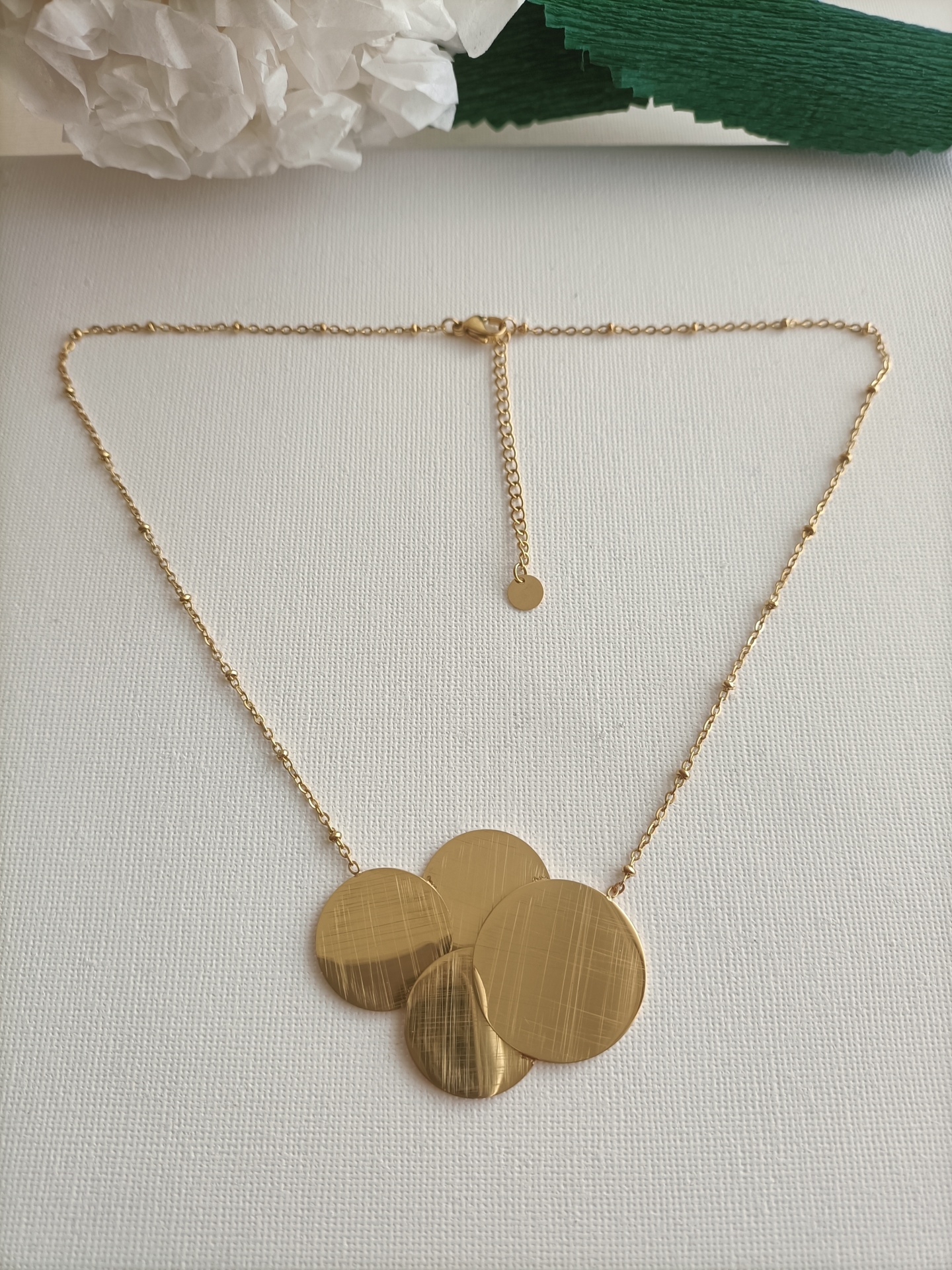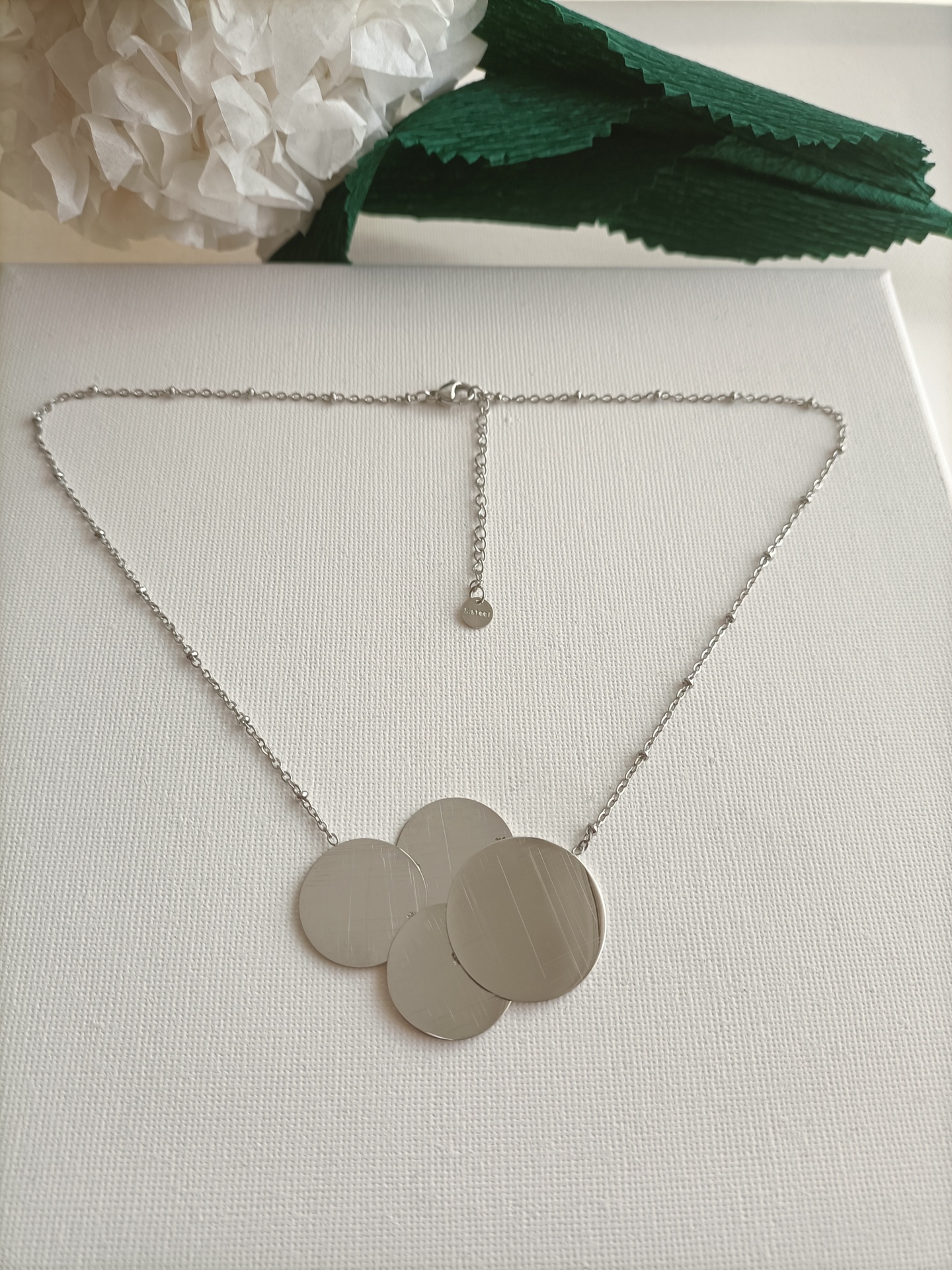 • Colar em aço inoxidável com quatre discos redondos prateados e corrente fina sobre fundo branco e decoração em papel verde e branco