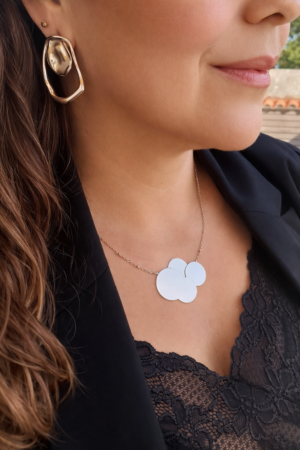 • Colar prateado com quatro círculos e brinco dourado irregular em pessoa com roupa preta.