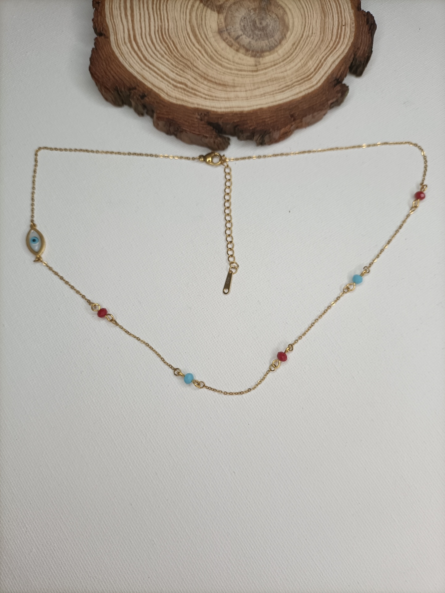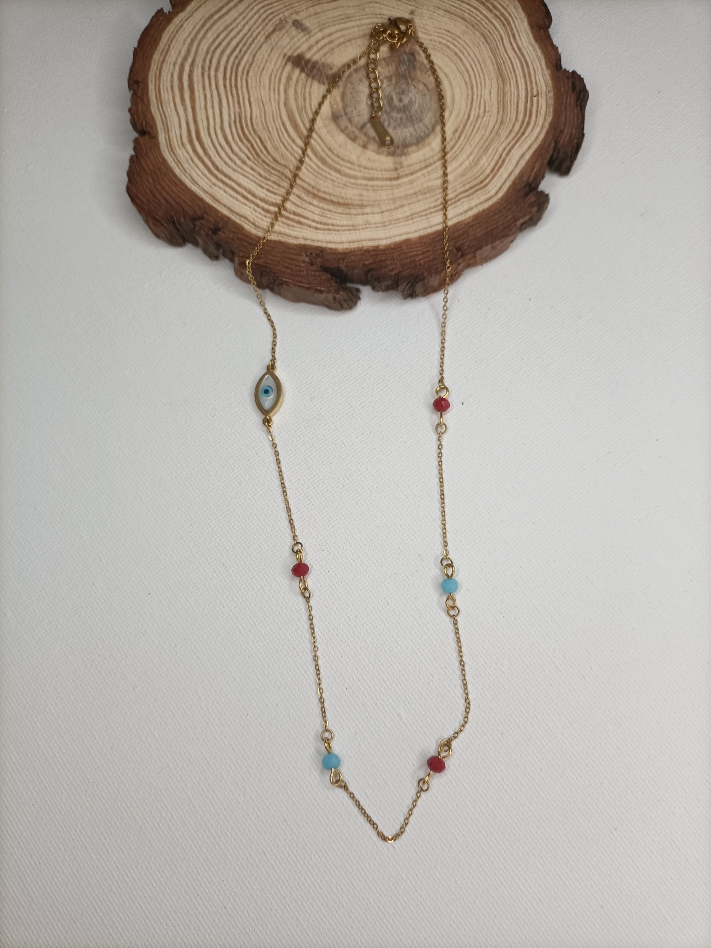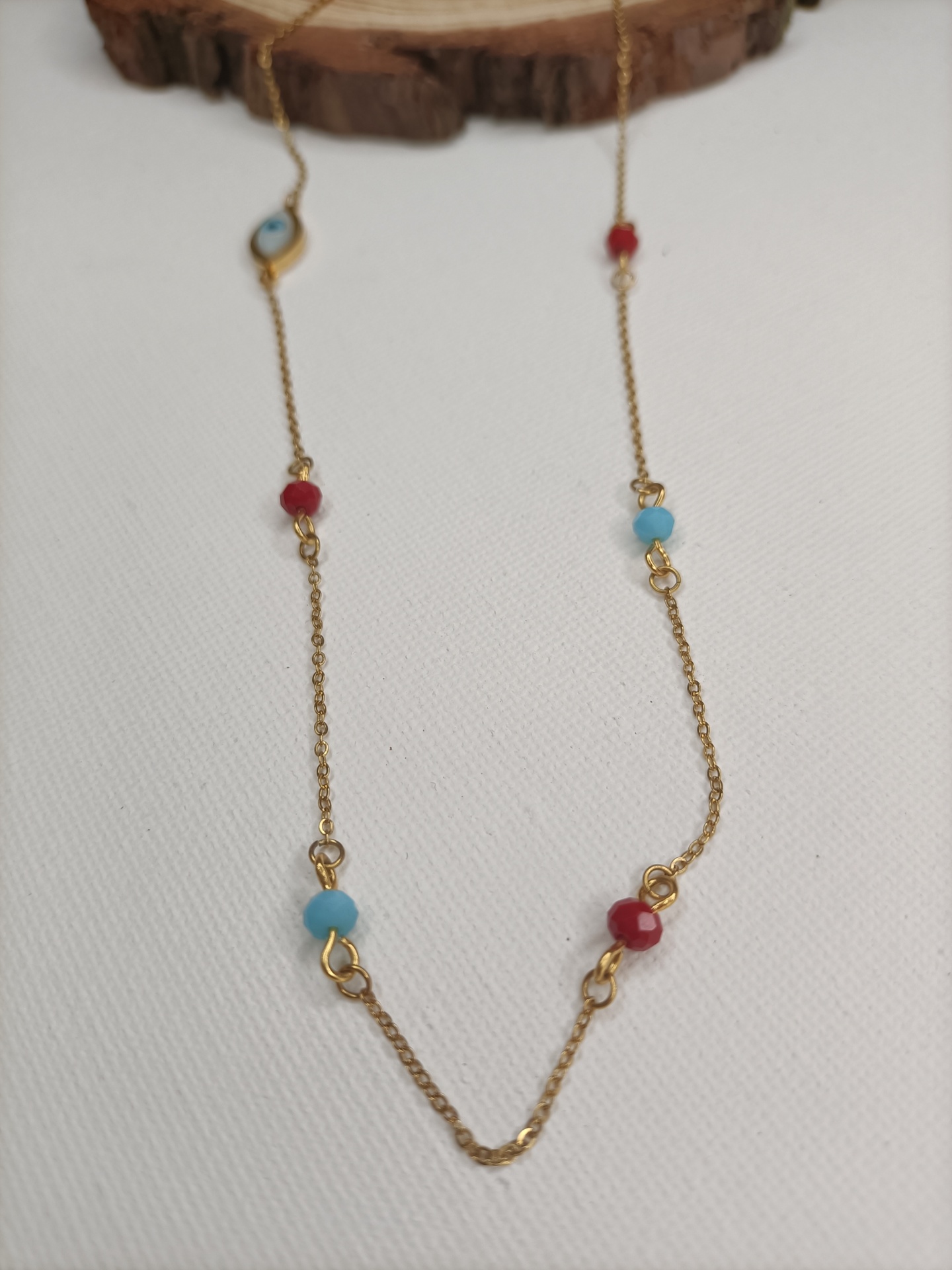 • Colar dourado com pingente olho grego e contas coloridas sobre suporte de madeira
