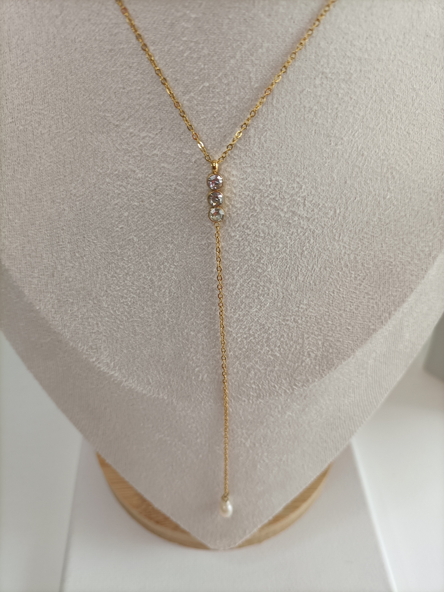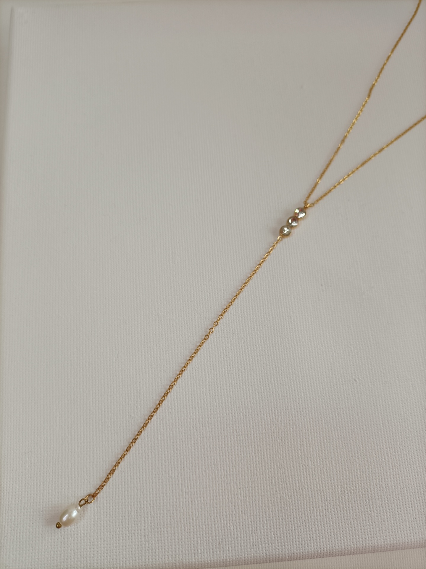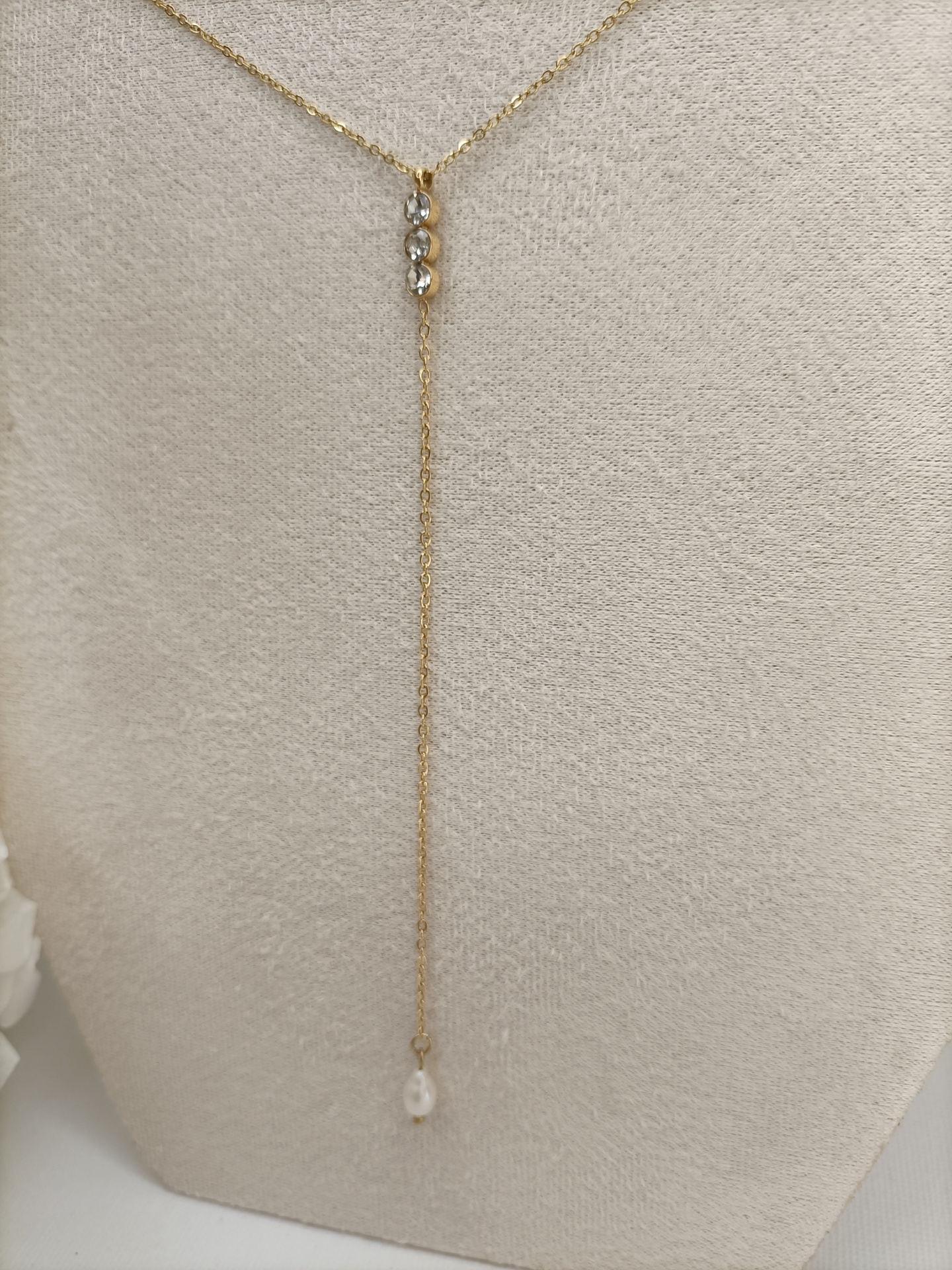 Colar Nice 9,90 € Desconto de %. Partilhar Comprar Contactar SKU: MB127 Colar em Y, corrente fininha com três zirconias e pérola. Nice a Deusa da Vitória. 🔸 Material: Aço inoxidável 🔸 Comprimento: ajustável (38cm + 4cm)