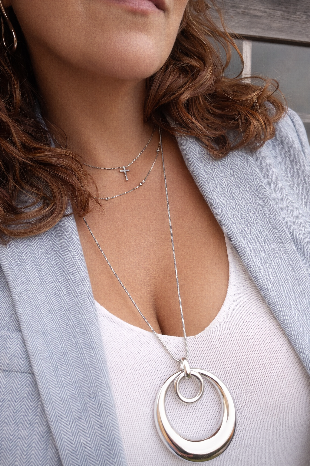 • Colares prateados com pendente duplo redondo em mulher com blazer cinza e blusa branca
