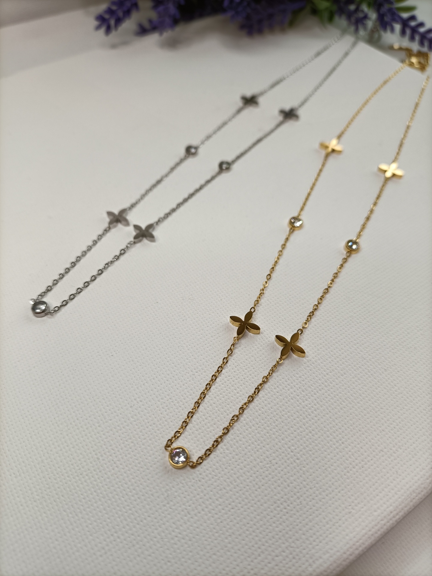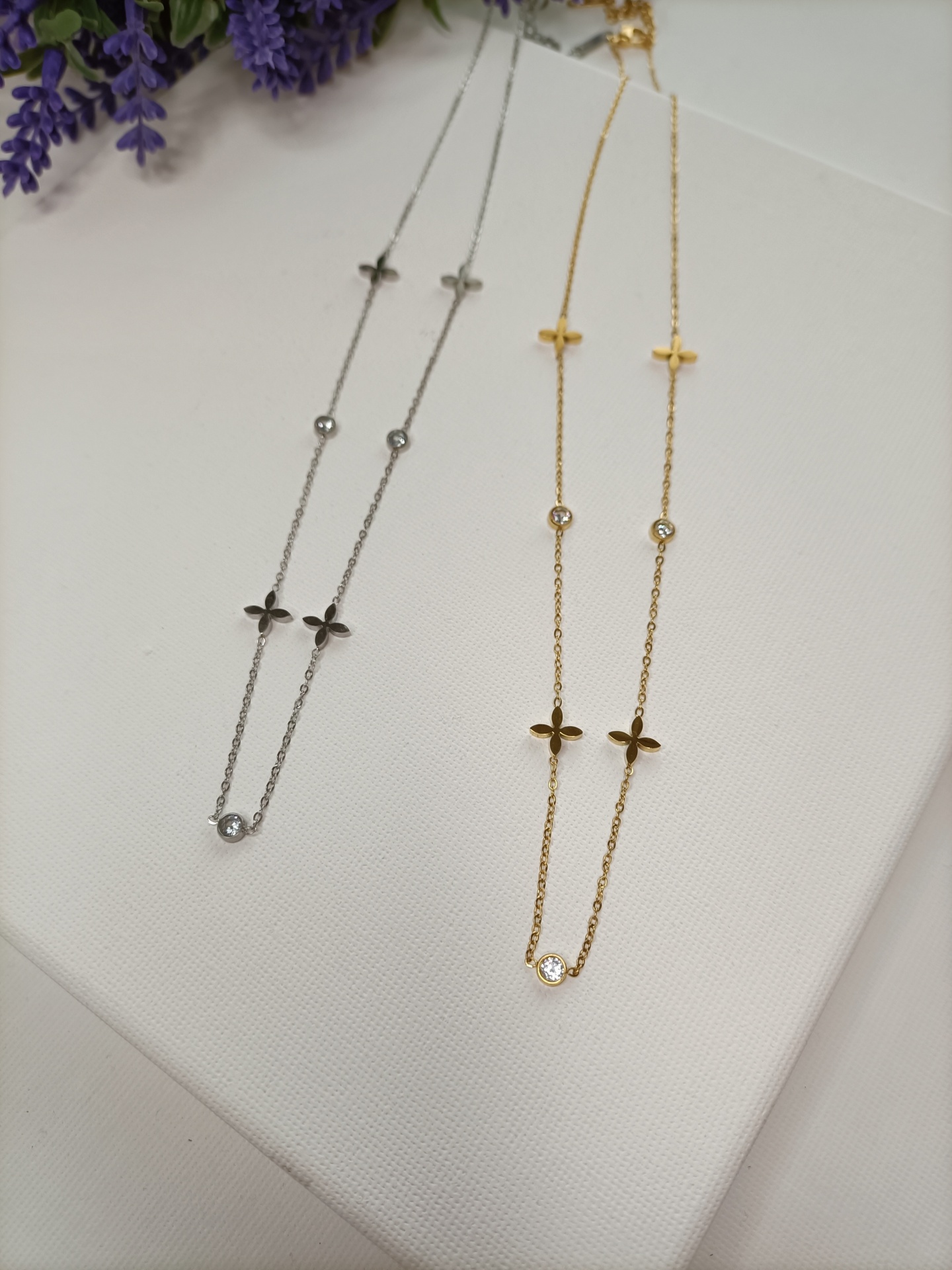 Colares finos prateado e dourado com flores e pedras em fundo branco