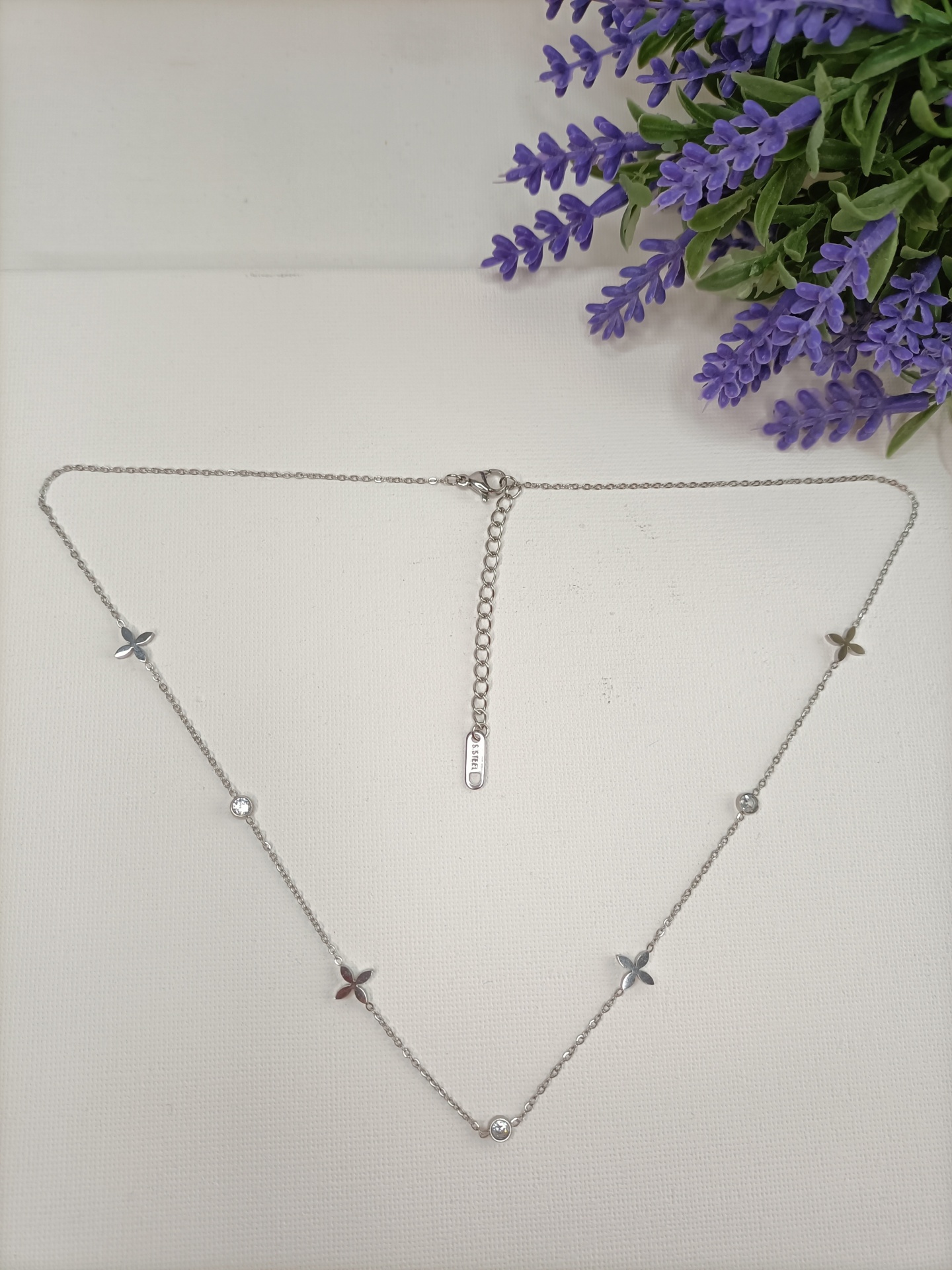 • Colar prateado com pedras e flores decorativas sobre fundo branco e flores roxas