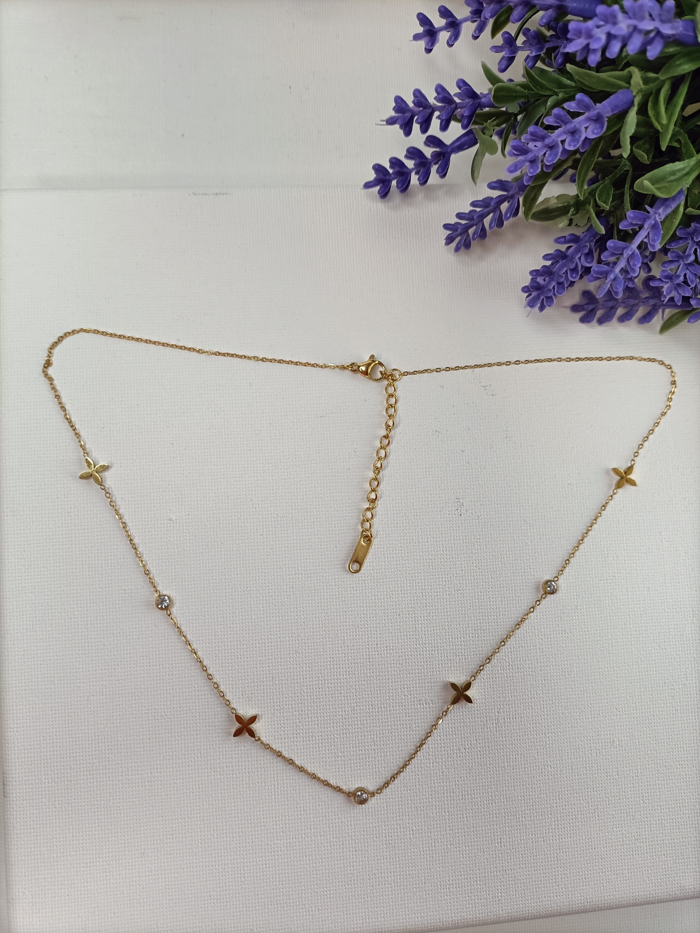 Um colar delicado com pequenas flores e pontinhos de luz. Ideal para usar sozinho ou acompanhado de outros.  É a escolha perfeita para quem aprecia elegância discreta com um toque contemporâneo