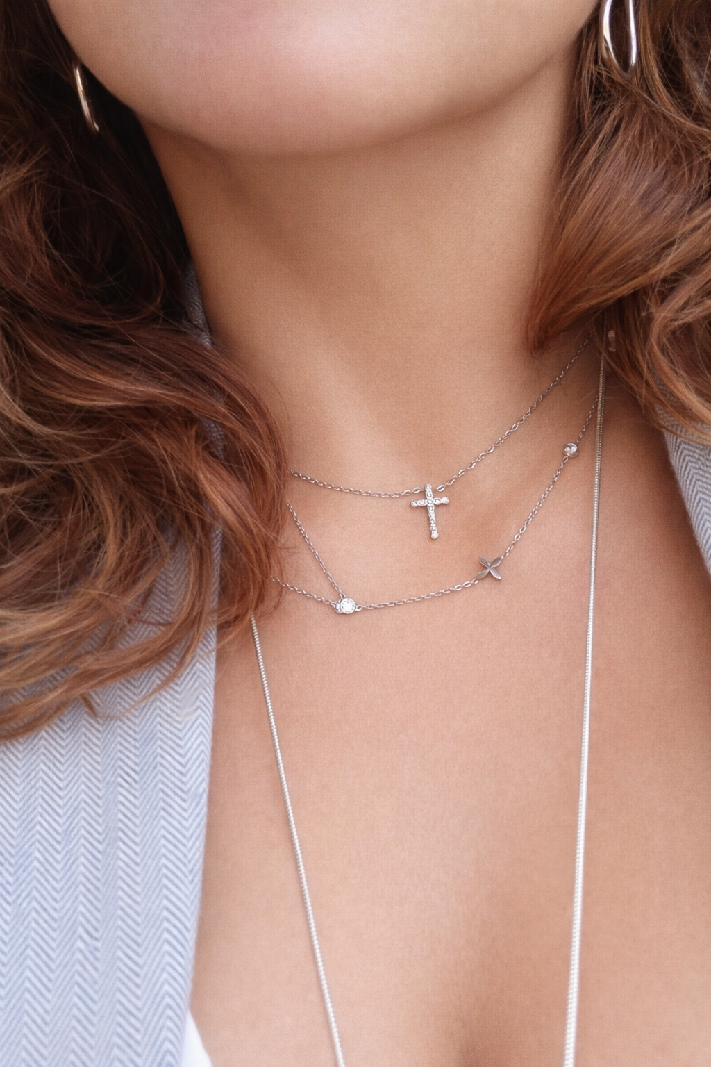 • Colares femininos prateados com pingentes variados usados no pescoço de uma mulher.
