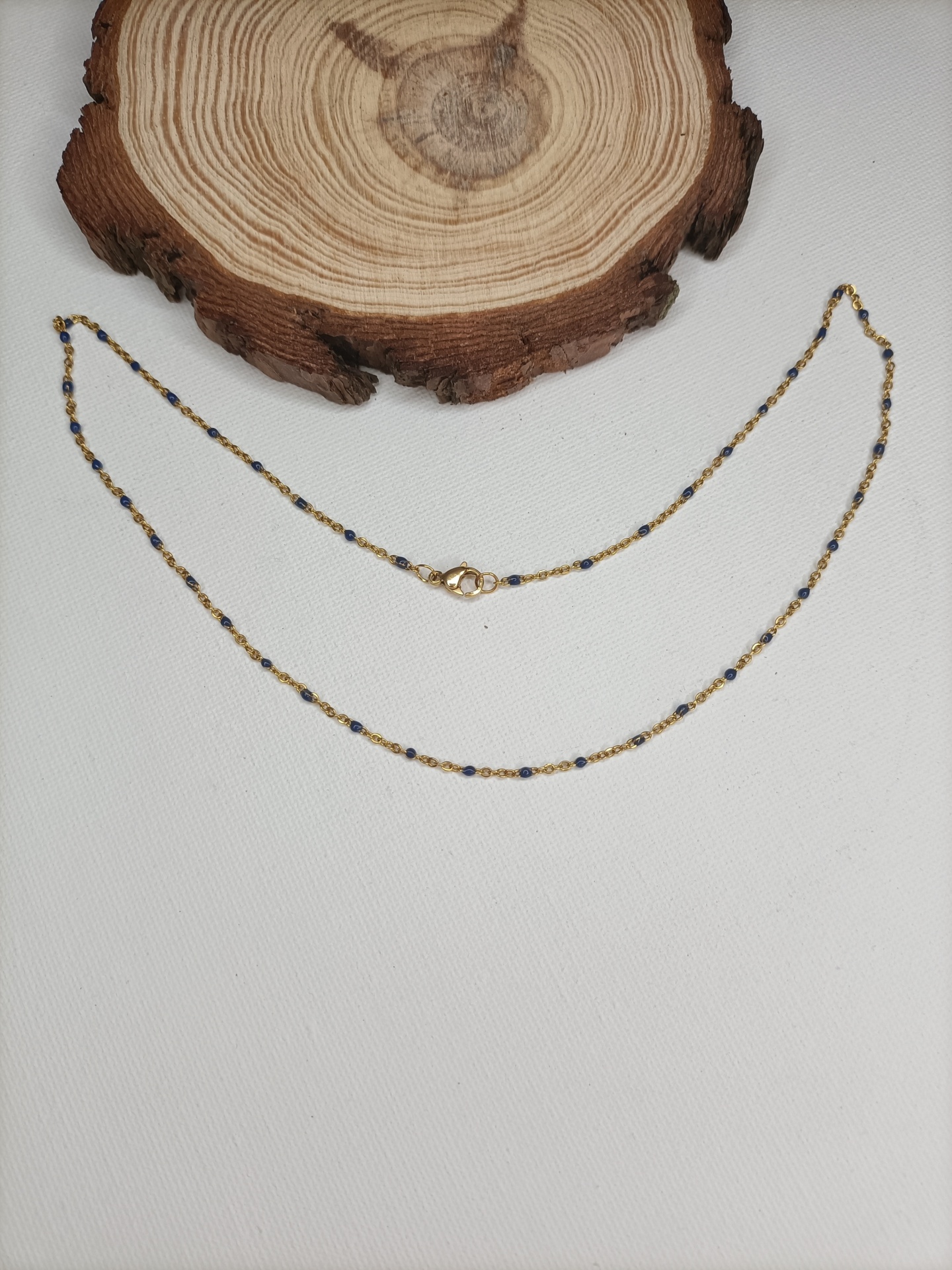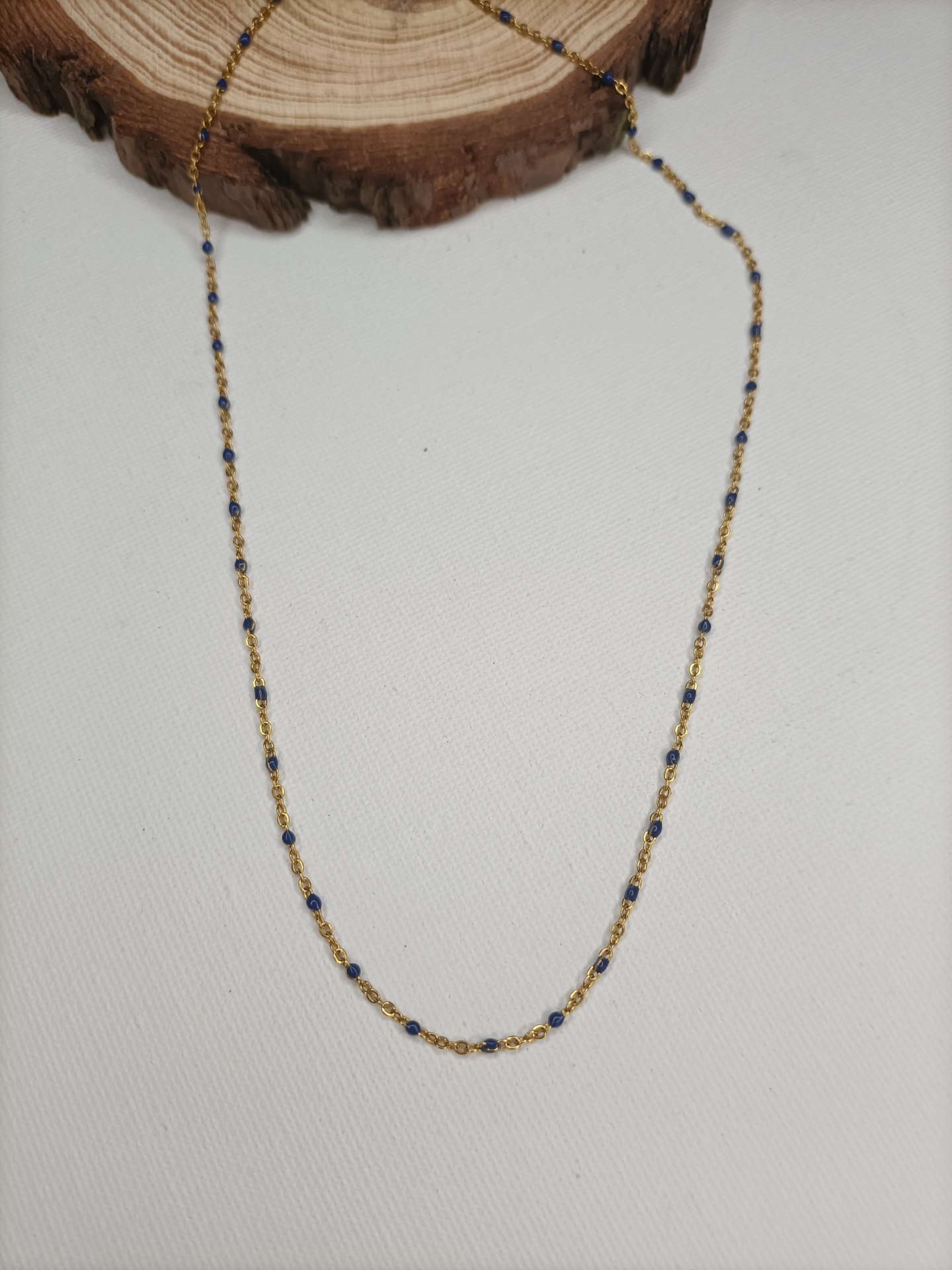 • Colar dourado com contas azuis sobre fundo branco e madeira