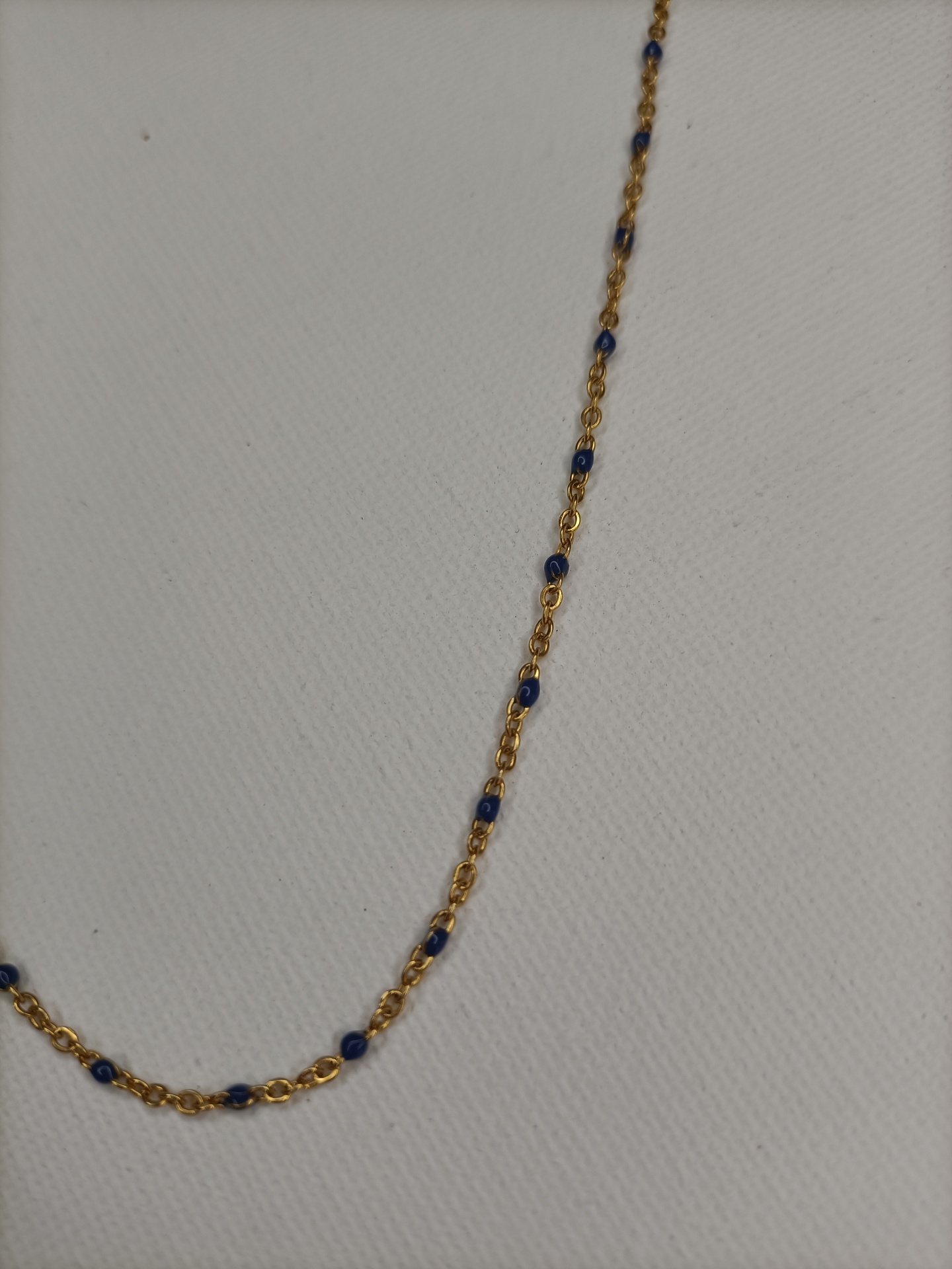 Use-o sozinho para um look minimalista ou combine com outros colares para criar um mix moderno e cheio de estilo. Colar elegante em aço dourado, delicadamente adornado com pequenas contas esmaltadas em azul.