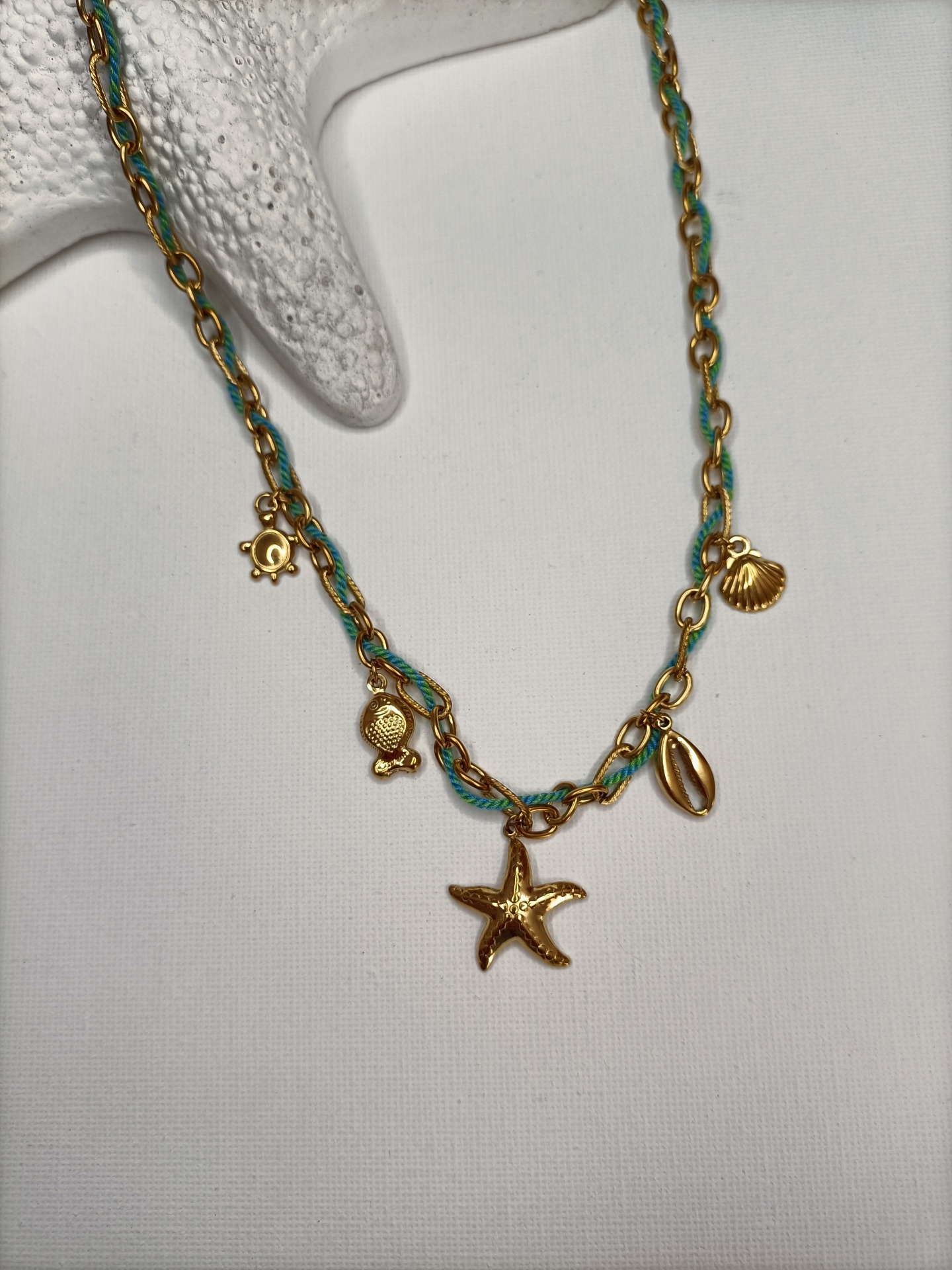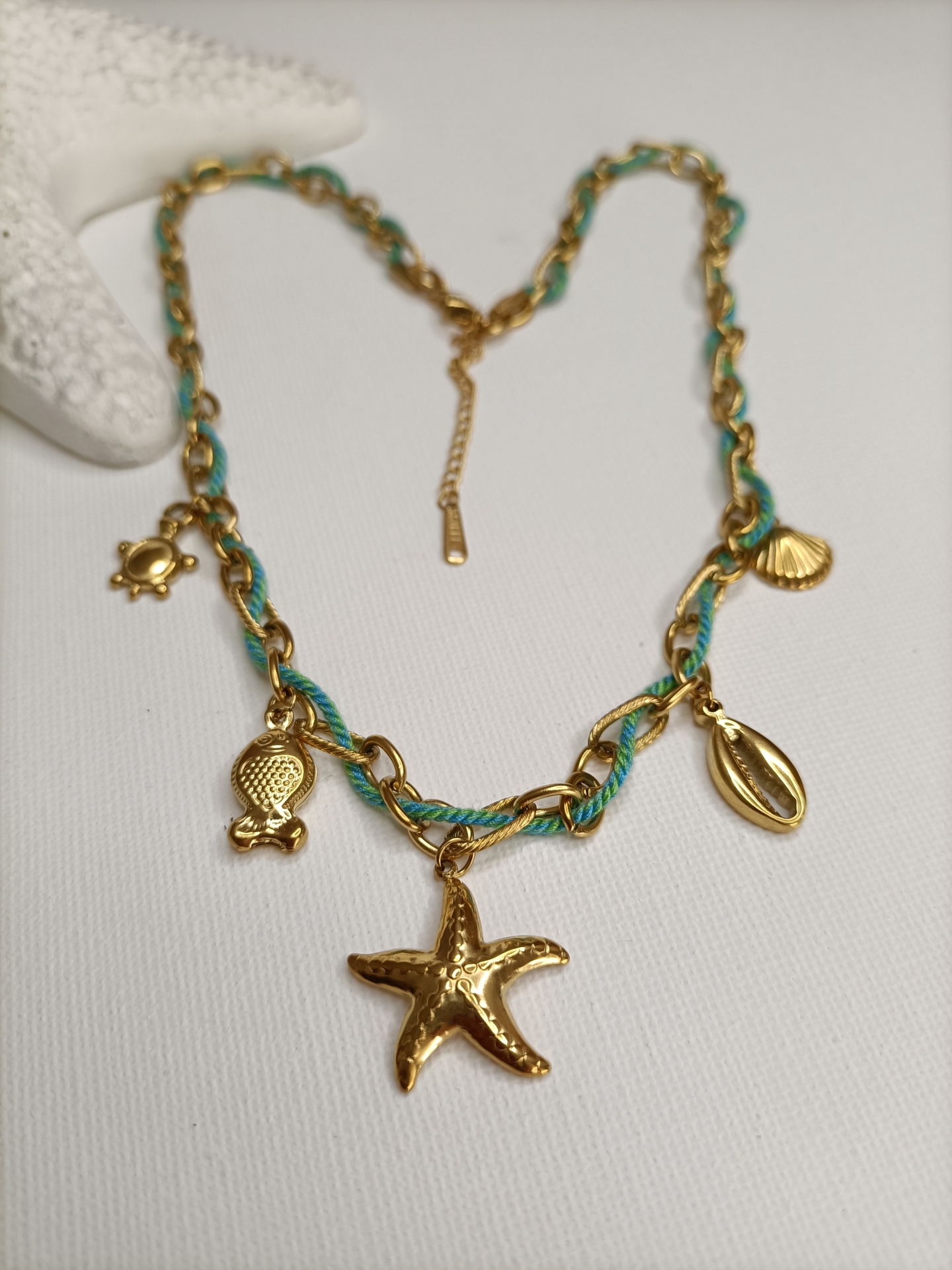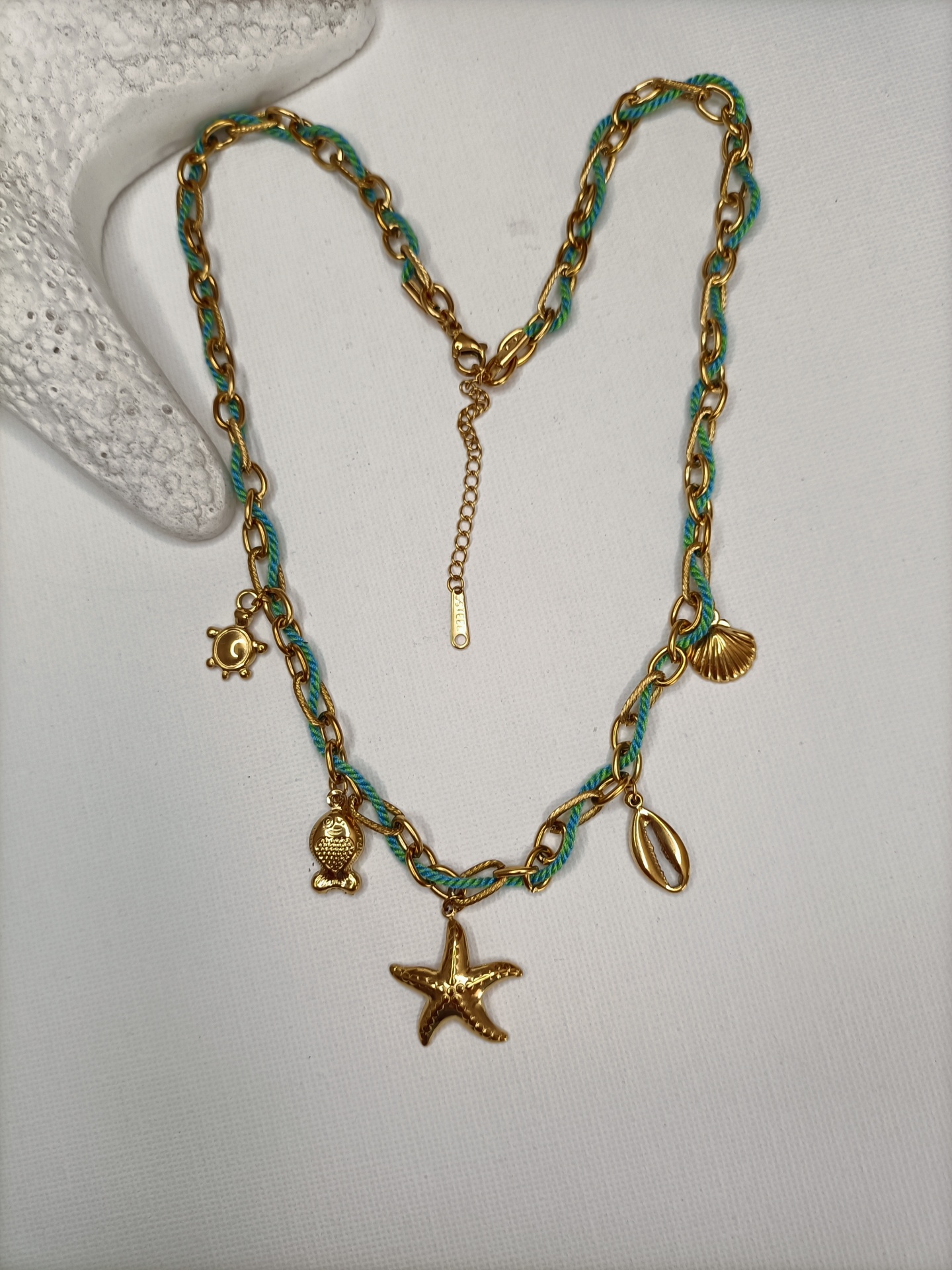 • Colar dourado com pendentes marinhos e corrente verde sobre fundo branco