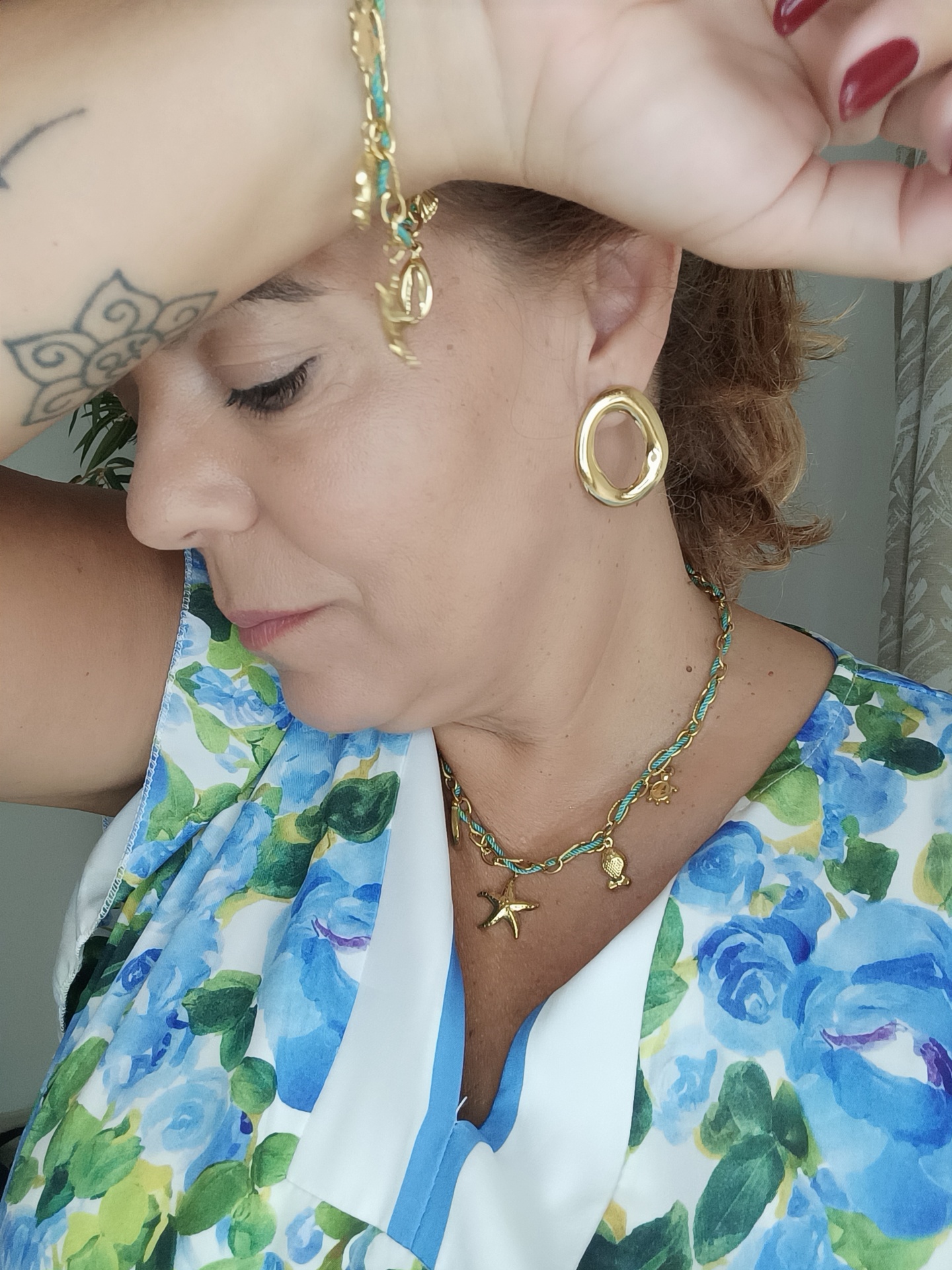 Mulher com joias douradas e vestido floral azul e verde