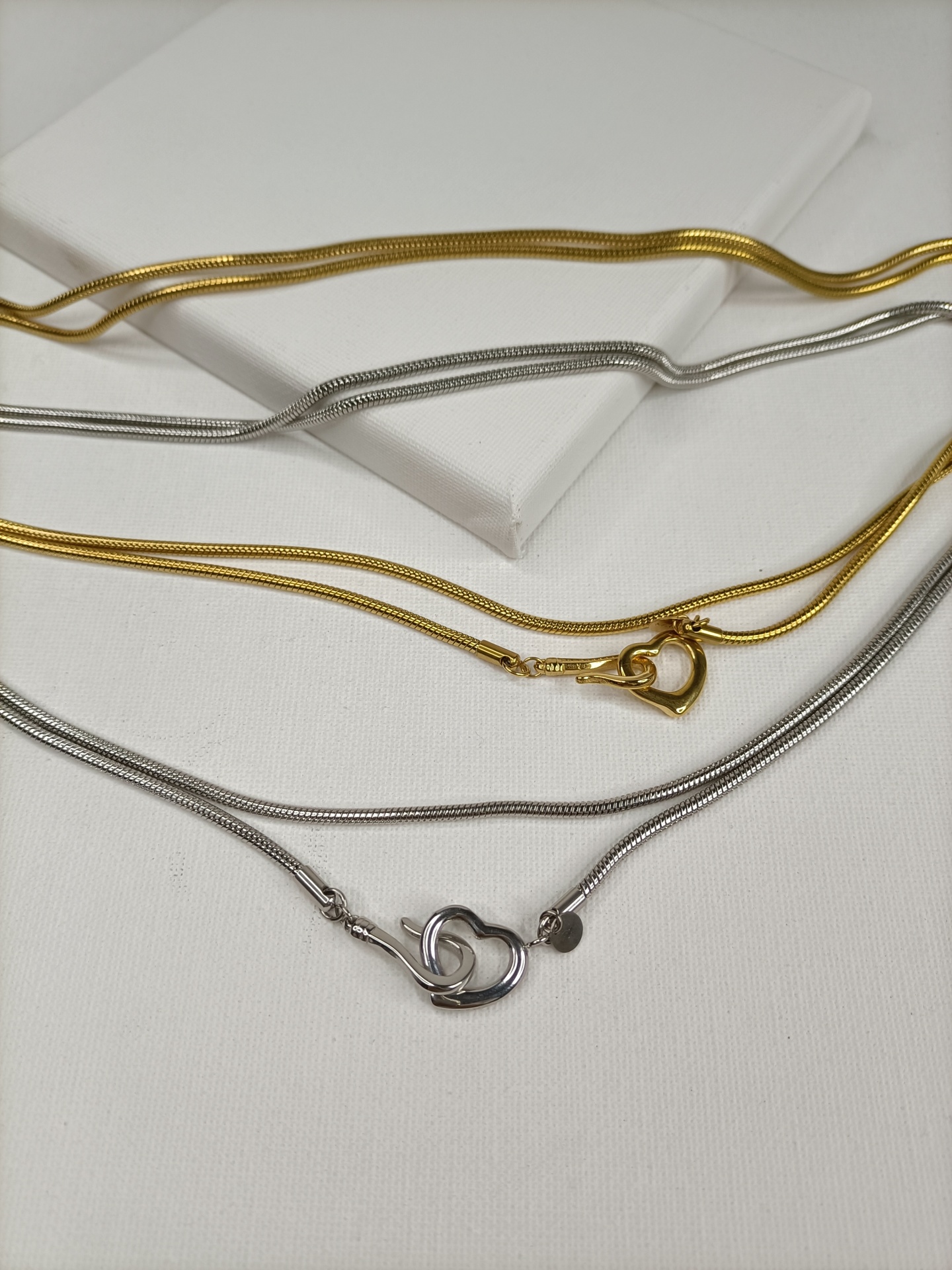 • Dois colares em metal dourado e prateado com fechos de coração sobre fundo branco.